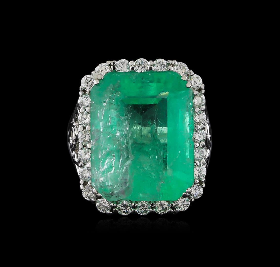 One electronically tested 14KT white gold lady's cast fashion ring with a basket halo with a bright polish finish. The featured lady's ring has a shank measuring 2.60 millimeters wide. Identified with markings of "14K". Condition is new, good workmanship. Containing: One prong set emerald step cut natural emerald, measuring 18.69 x 14.89 x 10.73mm, 3%. bulge factor, exact weight 22.51ct., clarity is heavily included, type III, medium light, very slightly grayish, green color, (GIA G 4/3), cut is good. Transmitting light somewhat diffusely, semi-transparent to translucent. Naturally occurring internal & external characteristics are present. Clarity enhanced. Graded loose prior to setting in the GIA Laboratory, Report #1172501603.Twenty-Four prong set round brilliant cut diamonds, measuring 2.40 - 2.30 x 1.46mm (depth est.) approximate total weight of 24 Stones = 1.20ct. Graded in the setting. Clarity: SI-1 to SI-2. Color: H - I. Cut Good. Total Weight of Colored Stones 22.51ct. Total Weight of Diamonds 1.20ct. Total Weight of Ring 13.20gm. GAS Appraised at $13,825.00.