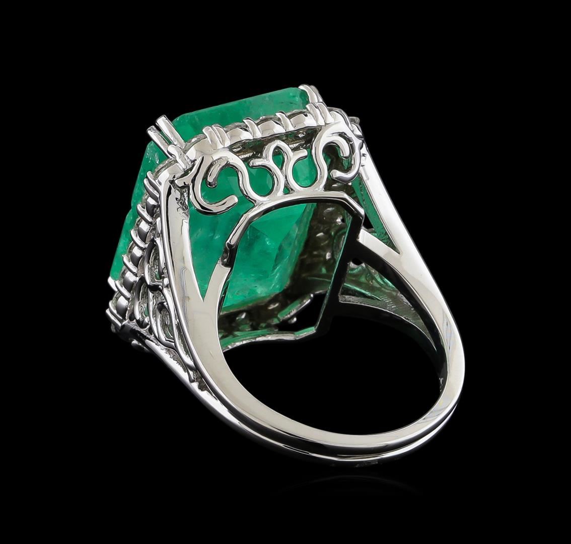 One electronically tested 14KT white gold lady's cast fashion ring with a basket halo with a bright polish finish. The featured lady's ring has a shank measuring 2.60 millimeters wide. Identified with markings of "14K". Condition is new, good workmanship. Containing: One prong set emerald step cut natural emerald, measuring 18.69 x 14.89 x 10.73mm, 3%. bulge factor, exact weight 22.51ct., clarity is heavily included, type III, medium light, very slightly grayish, green color, (GIA G 4/3), cut is good. Transmitting light somewhat diffusely, semi-transparent to translucent. Naturally occurring internal & external characteristics are present. Clarity enhanced. Graded loose prior to setting in the GIA Laboratory, Report #1172501603.Twenty-Four prong set round brilliant cut diamonds, measuring 2.40 - 2.30 x 1.46mm (depth est.) approximate total weight of 24 Stones = 1.20ct. Graded in the setting. Clarity: SI-1 to SI-2. Color: H - I. Cut Good. Total Weight of Colored Stones 22.51ct. Total Weight of Diamonds 1.20ct. Total Weight of Ring 13.20gm. GAS Appraised at $13,825.00.