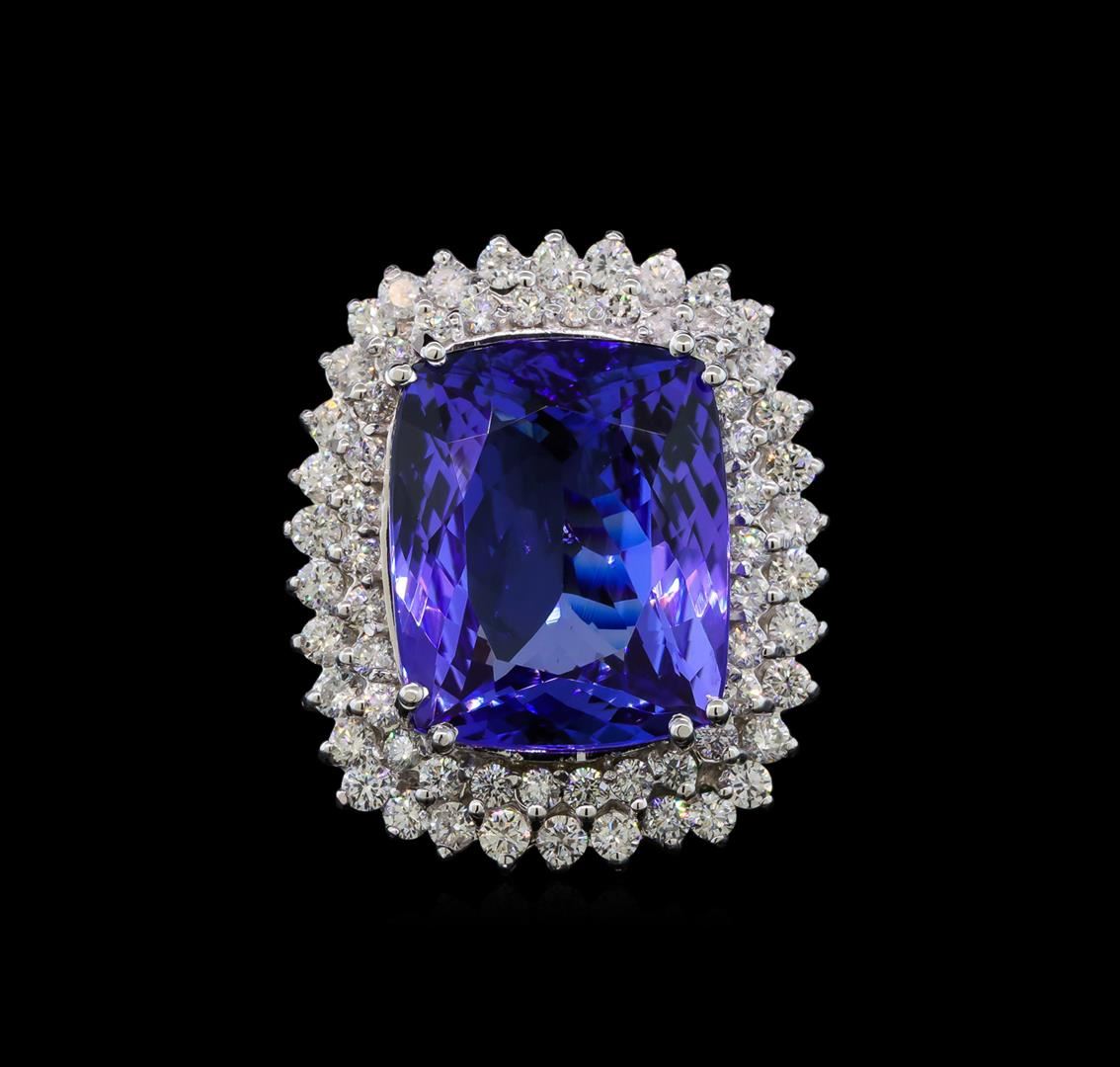 One electronically tested 14KT white gold lady's cast fashion ring with a double basket halo with a bright polish finish. The featured lady's ring has a shank measuring 2.70 millimeters wide. Identified with markings of 'K14'. Condition is new, good workmanship. Containing: One prong set rectangular cushion modified brilliant cut natural tanzanite, measuring 19.10 x 15.65 x 9.05mm, (depth est.) 6%. bulge factor, approximate weight of 22.59ct., clarity is eye clean, medium, moderately strong, bluish violet color, (GIA bV 5/4), cut is very good. Transmitting light with no distortion, transparent. Colored gemstones are presumed to have been subjected to commonly used enhancement processes. Graded loose prior to setting in the GIA Laboratory, Report #2173668607. Thirty-Four prong set round brilliant cut diamonds, measuring 2.40 - 2.30 x 1.41mm (depth est.) approximate total weight of 34 Stones = 1.60ct. Graded in the setting. Clarity SI-1 to I-1. Color: G - H Cut Good Thirty prong set round brilliant cut diamonds, measuring 2.10 - 2.00 x 1.23mm (depth est.) approximate total weight of 30 Stones = 0.91ct. Graded in the setting. Clarity SI-1 to I-1. Color: G - H Cut Good. Total Weight of Colored Stones 22.59ct.. Total Weight of Diamonds 2.51ct.. Total Weight of Ring 15.10gm. GAS Appraised at $38,215.00.