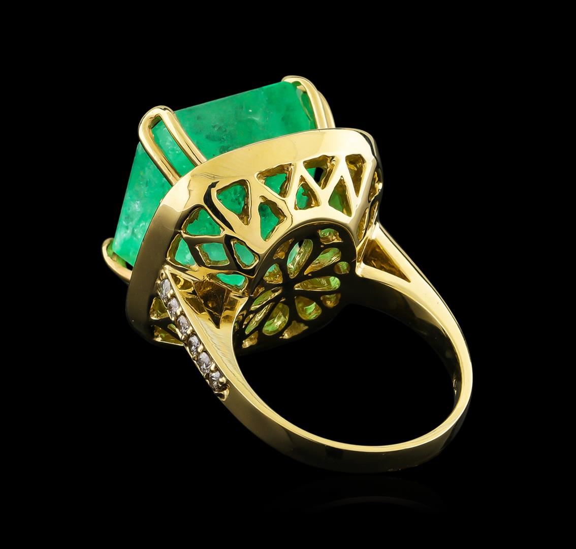One electronically tested 14KT yellow gold lady's cast fashion ring with a basket halo with a bright polish finish. The featured lady's ring has a shank measuring 2.54 millimeters wide. Identified with markings of "K14". Condition is new, good workmanship. Containing: One prong set emerald step cut natural emerald, measuring 16.04 x 15.66 x 11.69mm, 8%. bulge factor, approximate weight of 23.20ct., clarity is moderately included, type III, medium light, very slightly grayish, green color, (GIA G 4/3), cut is good. Transmitting light somewhat diffusely, transparent to translucent. Colored gemstones are presumed to have been subjected to commonly used enhancement processes. Graded loose prior to setting in the GIA Laboratory, Report #1172501519.Thirty prong set round brilliant cut diamonds, measuring 2.00 - 1.90 x 1.17mm (depth est.) approximate total weight of 30 Stones = 0.80ct. Graded in the setting. Clarity: SI-1 to SI-2. Color: G - Very Good Twelve prong set round brilliant cut diamonds, measuring 1.80 - 1.70 x 1.09mm (depth est.) approximate total weight of 12 Stones = 0.26ct. Graded in the setting. Clarity: SI-1 to I-1. Color: G - Good. Total Weight of Colored Stones 23.20ct. Total Weight of Diamonds 1.06ct. Total Weight of Ring 15.10gm. GAS Appraised at $17,840.00.