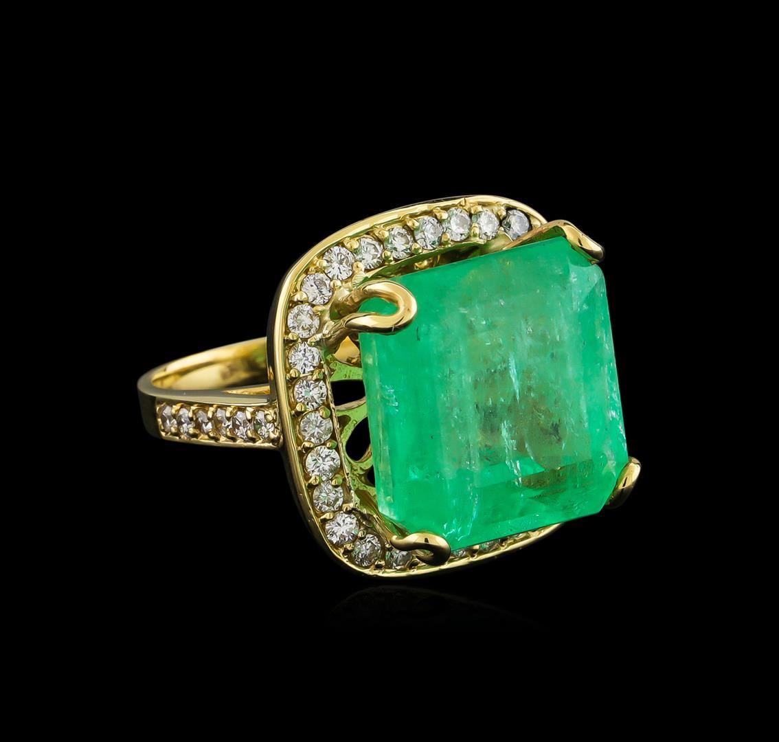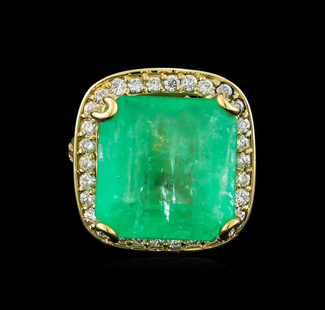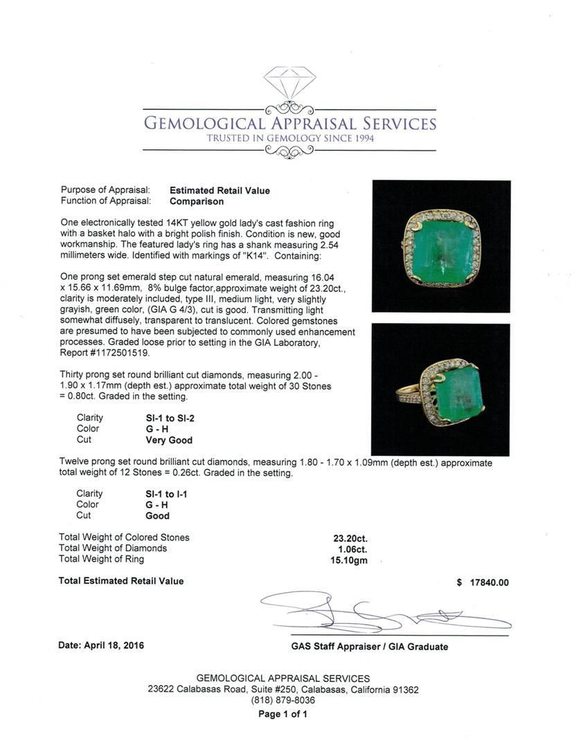One electronically tested 14KT yellow gold lady's cast fashion ring with a basket halo with a bright polish finish. The featured lady's ring has a shank measuring 2.54 millimeters wide. Identified with markings of "K14". Condition is new, good workmanship. Containing: One prong set emerald step cut natural emerald, measuring 16.04 x 15.66 x 11.69mm, 8%. bulge factor, approximate weight of 23.20ct., clarity is moderately included, type III, medium light, very slightly grayish, green color, (GIA G 4/3), cut is good. Transmitting light somewhat diffusely, transparent to translucent. Colored gemstones are presumed to have been subjected to commonly used enhancement processes. Graded loose prior to setting in the GIA Laboratory, Report #1172501519.Thirty prong set round brilliant cut diamonds, measuring 2.00 - 1.90 x 1.17mm (depth est.) approximate total weight of 30 Stones = 0.80ct. Graded in the setting. Clarity: SI-1 to SI-2. Color: G - Very Good Twelve prong set round brilliant cut diamonds, measuring 1.80 - 1.70 x 1.09mm (depth est.) approximate total weight of 12 Stones = 0.26ct. Graded in the setting. Clarity: SI-1 to I-1. Color: G - Good. Total Weight of Colored Stones 23.20ct. Total Weight of Diamonds 1.06ct. Total Weight of Ring 15.10gm. GAS Appraised at $17,840.00.