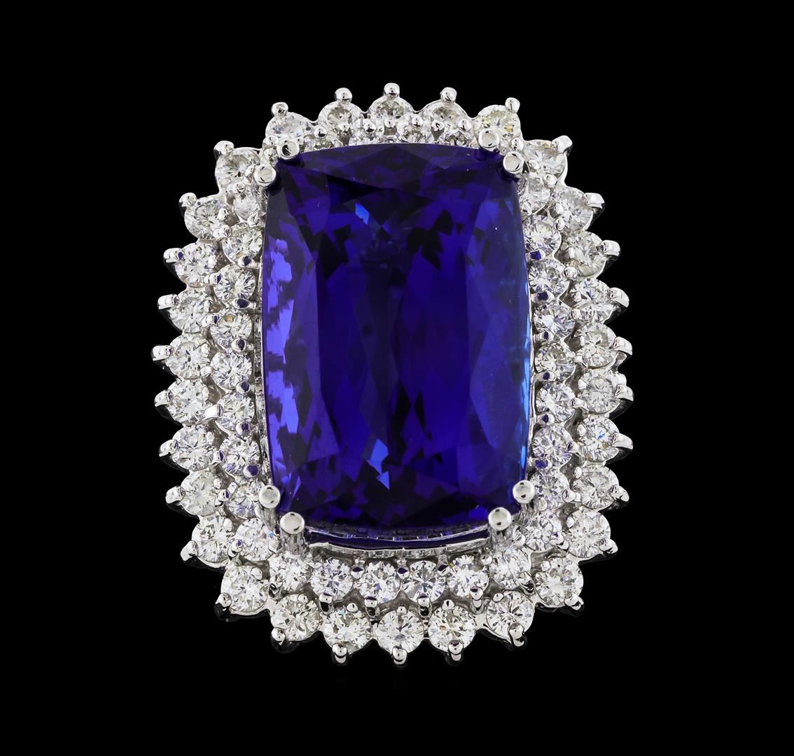 One electronically tested 14KT white gold lady's cast fashion ring with a double basket halo with a bright polish finish. The featured lady's ring has a shank measuring 3.19 millimeters wide. Identified with markings of 'K14'. Condition is new, good workmanship. Containing: One prong set rectangular cushion modified brilliant cut natural tanzanite, measuring 19.89 x 13.02 x 10.11mm, (depth est.) 20%. bulge factor, approximate weight of 24.59ct., clarity is eye clean, dark, strong, violetish blue color, (GIA vB 7/5), cut is very good. Transmitting light with no distortion, transparent. Colored gemstones are presumed to have been subjected to commonly used enhancement processes. Graded loose prior to setting in the GIA Laboratory, Report #6177847039. Thirty prong set round brilliant cut diamonds, measuring 2.40 - 2.30 x 1.41mm (depth est.) approximate total weight of 30 Stones = 1.43ct. Graded in the setting. Clarity SI-1 to SI-2. Color: H - I Cut Good Thirty prong set round brilliant cut diamonds, measuring 2.10 - 2.00 x 1.23mm (depth est.) approximate total weight of 30 Stones = 0.93ct. Graded in the setting. Clarity SI-1 to SI-3. Color: H - I Cut Good. Total Weight of Colored Stones 24.59ct.. Total Weight of Diamonds 2.36ct.. Total Weight of Ring 17.90gm. GAS Appraised at $37,740.00.