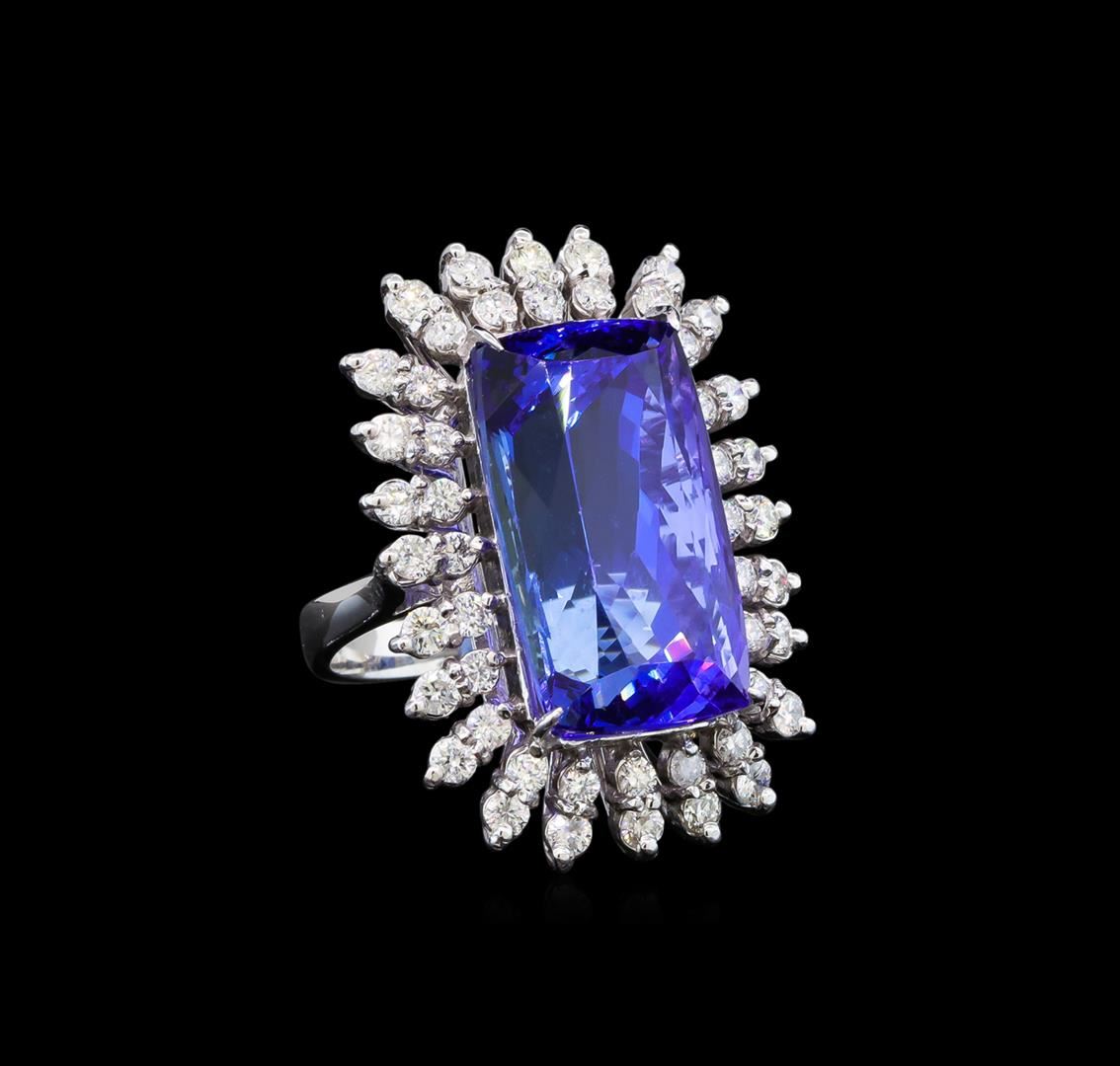 One electronically tested 14KT white gold lady's cast fashion ring with a double basket halo with a bright polish finish. The featured lady's ring has a shank measuring 3.10 millimeters wide. Identified with markings of 'K14'. Condition is new, good workmanship. Containing: One prong set rectangular cushion modified brilliant cut natural tanzanite, measuring 21.20 x 12.11 x 11.65mm, (depth est.) 11%. bulge factor, approximate weight of 26.10ct., clarity is eye clean, medium, moderately strong, bluish violet color, (GIA bV 5/4), cut is very good. Transmitting light with no distortion, transparent. Colored gemstones are presumed to have been subjected to commonly used enhancement processes. Graded loose prior to setting in the GIA Laboratory, Report #1176668687. Twenty-Four prong set round brilliant cut diamonds, measuring 2.40 - 2.30 x 1.41mm (depth est.) approximate total weight of 24 Stones = 1.12ct. Graded in the setting. Clarity SI-1 to I-1. Color: H - I Cut Good Twenty-Four prong set round brilliant cut diamonds, measuring 2.00 - 1.90 x 1.17mm (depth est.) approximate total weight of 24 Stones = 0.65ct. Graded in the setting. Clarity SI-1 to SI-2. Color: H - I Cut Good. Total Weight of Colored Stones 26.10ct.. Total Weight of Diamonds 1.77ct.. Total Weight of Ring 16.10gm. GAS Appraised at $41,880.00.