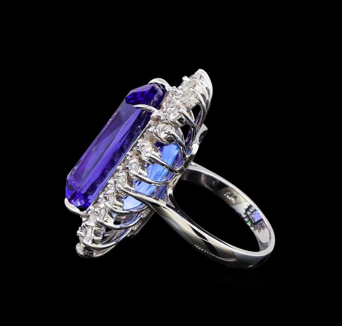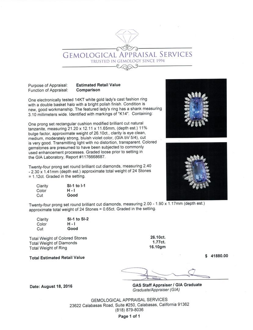 One electronically tested 14KT white gold lady's cast fashion ring with a double basket halo with a bright polish finish. The featured lady's ring has a shank measuring 3.10 millimeters wide. Identified with markings of 'K14'. Condition is new, good workmanship. Containing: One prong set rectangular cushion modified brilliant cut natural tanzanite, measuring 21.20 x 12.11 x 11.65mm, (depth est.) 11%. bulge factor, approximate weight of 26.10ct., clarity is eye clean, medium, moderately strong, bluish violet color, (GIA bV 5/4), cut is very good. Transmitting light with no distortion, transparent. Colored gemstones are presumed to have been subjected to commonly used enhancement processes. Graded loose prior to setting in the GIA Laboratory, Report #1176668687. Twenty-Four prong set round brilliant cut diamonds, measuring 2.40 - 2.30 x 1.41mm (depth est.) approximate total weight of 24 Stones = 1.12ct. Graded in the setting. Clarity SI-1 to I-1. Color: H - I Cut Good Twenty-Four prong set round brilliant cut diamonds, measuring 2.00 - 1.90 x 1.17mm (depth est.) approximate total weight of 24 Stones = 0.65ct. Graded in the setting. Clarity SI-1 to SI-2. Color: H - I Cut Good. Total Weight of Colored Stones 26.10ct.. Total Weight of Diamonds 1.77ct.. Total Weight of Ring 16.10gm. GAS Appraised at $41,880.00.