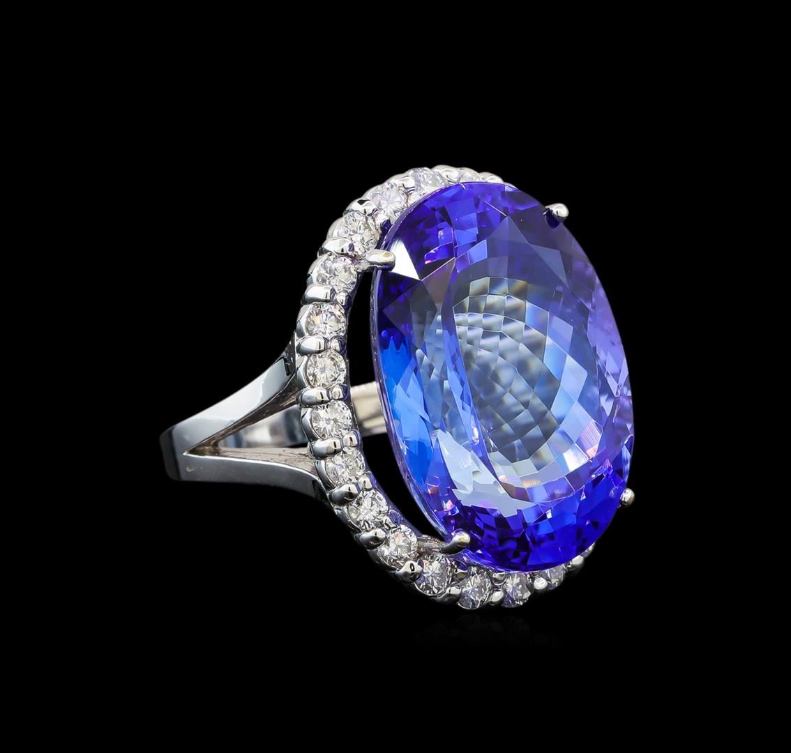 One electronically tested 14KT white gold lady's cast fashion ring with a split shank basket halo with a bright polish finish. The featured lady's ring has a shank measuring 2.40 millimeters wide. Identified with markings of '14K'. Condition is new, good workmanship. Containing: One prong set oval modified brilliant cut natural tanzanite, measuring 21.12 x 15.30 x 10.78mm, (depth est.) 8%. bulge factor, approximate weight of 26.53ct., clarity is eye clean, medium, very slightly grayish, bluish violet color, (GIA bV 5/3), cut is very good. Transmitting light with no distortion, transparent. Colored gemstones are presumed to have been subjected to commonly used enhancement processes. Graded loose prior to setting in the GIA Laboratory, Report #2171668623. Twenty-Four prong set round brilliant cut diamonds, measuring 2.30 - 2.20 x 1.40mm (depth est.) approximate total weight of 24 Stones = 1.04ct. Graded in the setting. Clarity SI-1 to I-1. Color: H - I Cut Good. Total Weight of Colored Stones 26.53ct.. Total Weight of Diamonds 1.04ct.. Total Weight of Ring 13.60gm. GAS Appraised at $39,100.00.