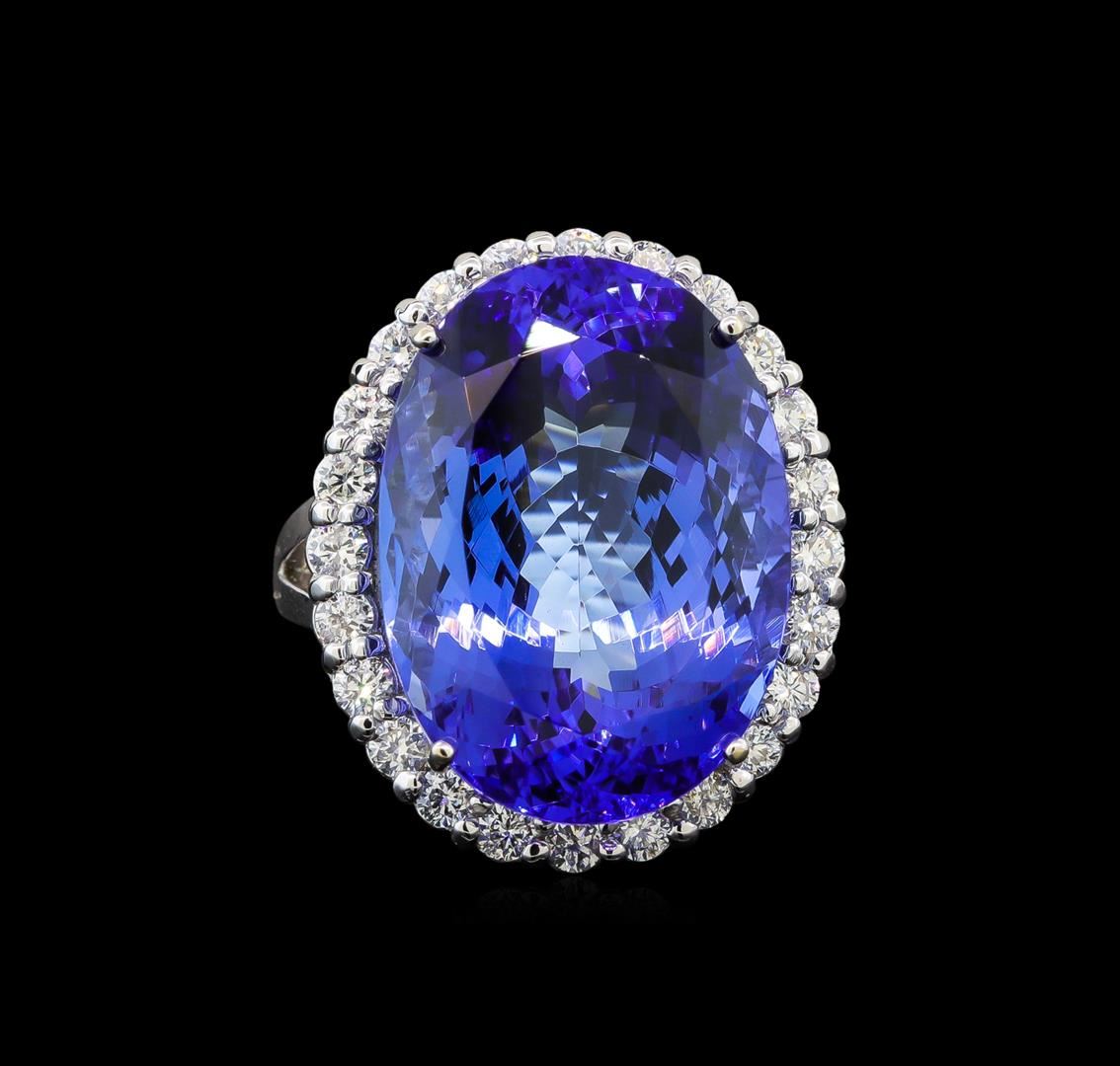 One electronically tested 14KT white gold lady's cast fashion ring with a split shank basket halo with a bright polish finish. The featured lady's ring has a shank measuring 2.40 millimeters wide. Identified with markings of '14K'. Condition is new, good workmanship. Containing: One prong set oval modified brilliant cut natural tanzanite, measuring 21.12 x 15.30 x 10.78mm, (depth est.) 8%. bulge factor, approximate weight of 26.53ct., clarity is eye clean, medium, very slightly grayish, bluish violet color, (GIA bV 5/3), cut is very good. Transmitting light with no distortion, transparent. Colored gemstones are presumed to have been subjected to commonly used enhancement processes. Graded loose prior to setting in the GIA Laboratory, Report #2171668623. Twenty-Four prong set round brilliant cut diamonds, measuring 2.30 - 2.20 x 1.40mm (depth est.) approximate total weight of 24 Stones = 1.04ct. Graded in the setting. Clarity SI-1 to I-1. Color: H - I Cut Good. Total Weight of Colored Stones 26.53ct.. Total Weight of Diamonds 1.04ct.. Total Weight of Ring 13.60gm. GAS Appraised at $39,100.00.