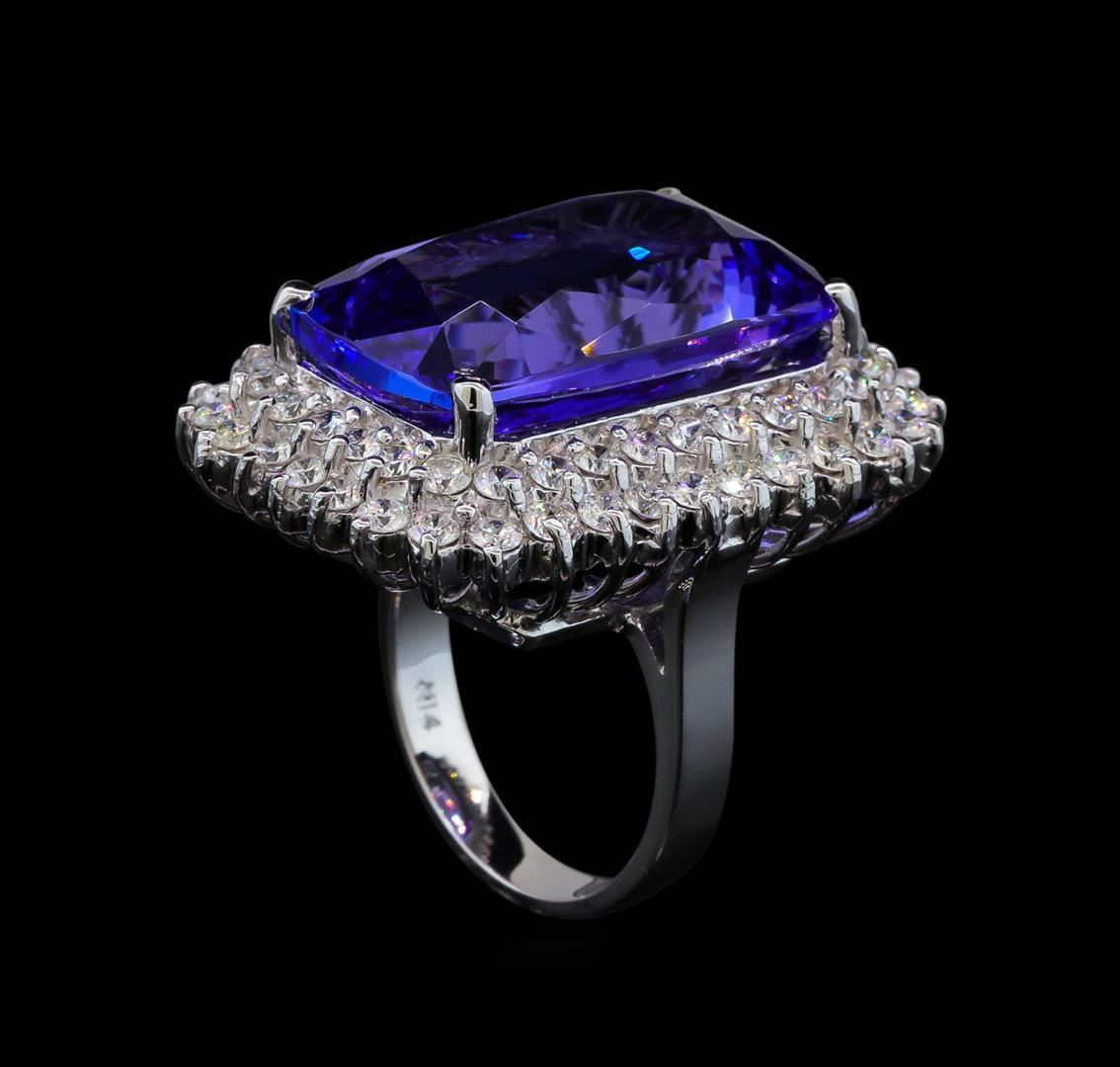 One electronically tested 14KT white gold lady's cast fashion ring with a double basket halo with a bright polish finish. The featured lady's ring has a shank measuring 3.28 millimeters wide. Identified with markings of 'K14'. Condition is new, good workmanship. Containing: One prong set rectangular cushion modified brilliant cut natural tanzanite, measuring 22.08 x 14.61 x 9.16mm, (depth est.) 15%. bulge factor, approximate weight of 26.67ct., clarity is eye clean, medium, moderately strong, violet color, (GIA V 5/4), cut is very good. Transmitting light with no distortion, transparent. Colored gemstones are presumed to have been subjected to commonly used enhancement processes. Graded loose prior to setting in the GIA Laboratory, Report #2175668749. Sixty-Four prong set round brilliant cut diamonds, measuring 2.30 - 2.20 x 1.37mm (depth est.) approximate total weight of 64 Stones = 2.70ct. Graded in the setting. Clarity SI-1 to I-1. Color: G - I Cut Good. Total Weight of Colored Stones 26.67ct.. Total Weight of Diamonds 2.70ct.. Total Weight of Ring 18.80gm. GAS Appraised at $43,125.00.