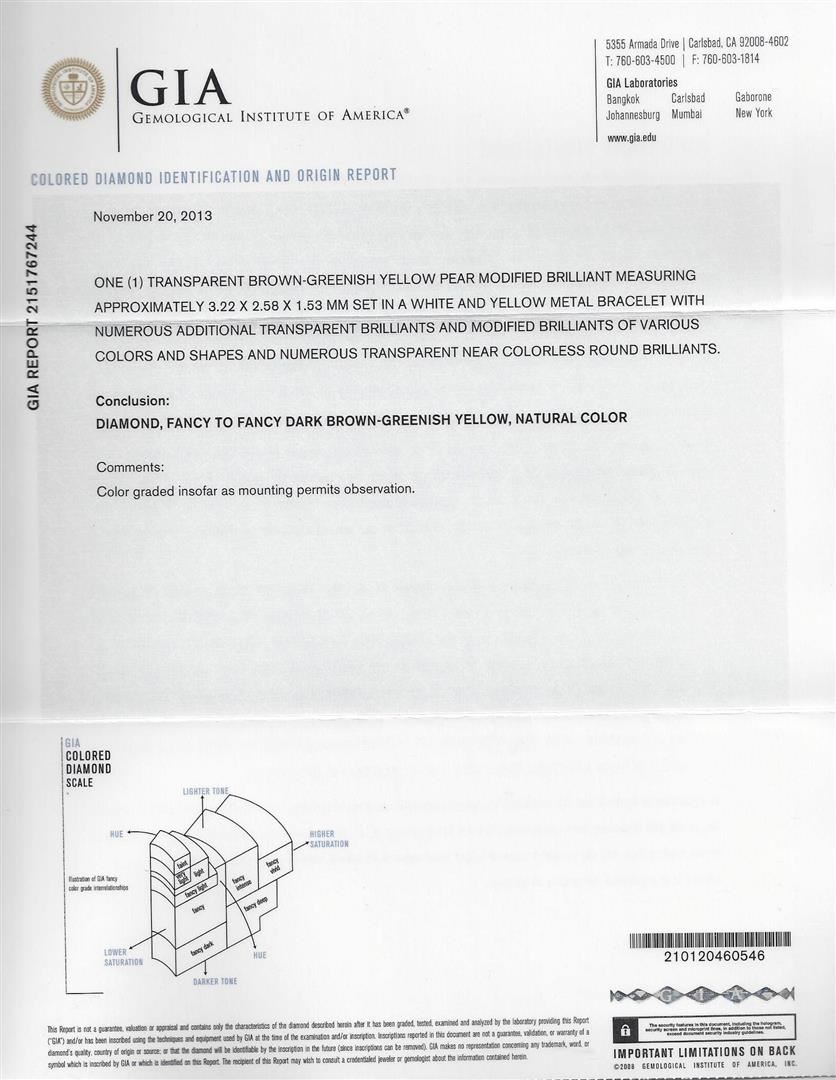 One GIA certified 18KT white and yellow gold hand made bracelet weighing 47.45 grams containing: natural fancy color mixed shape diamonds with a total weight of 21.03ct and natural round brilliant cut diamonds with a total weight of 6.36ct (VS clarity; E-F color). All fine cutting and proportions. 5 GIA certified reports. RBGS Appraised at $500,000.00.