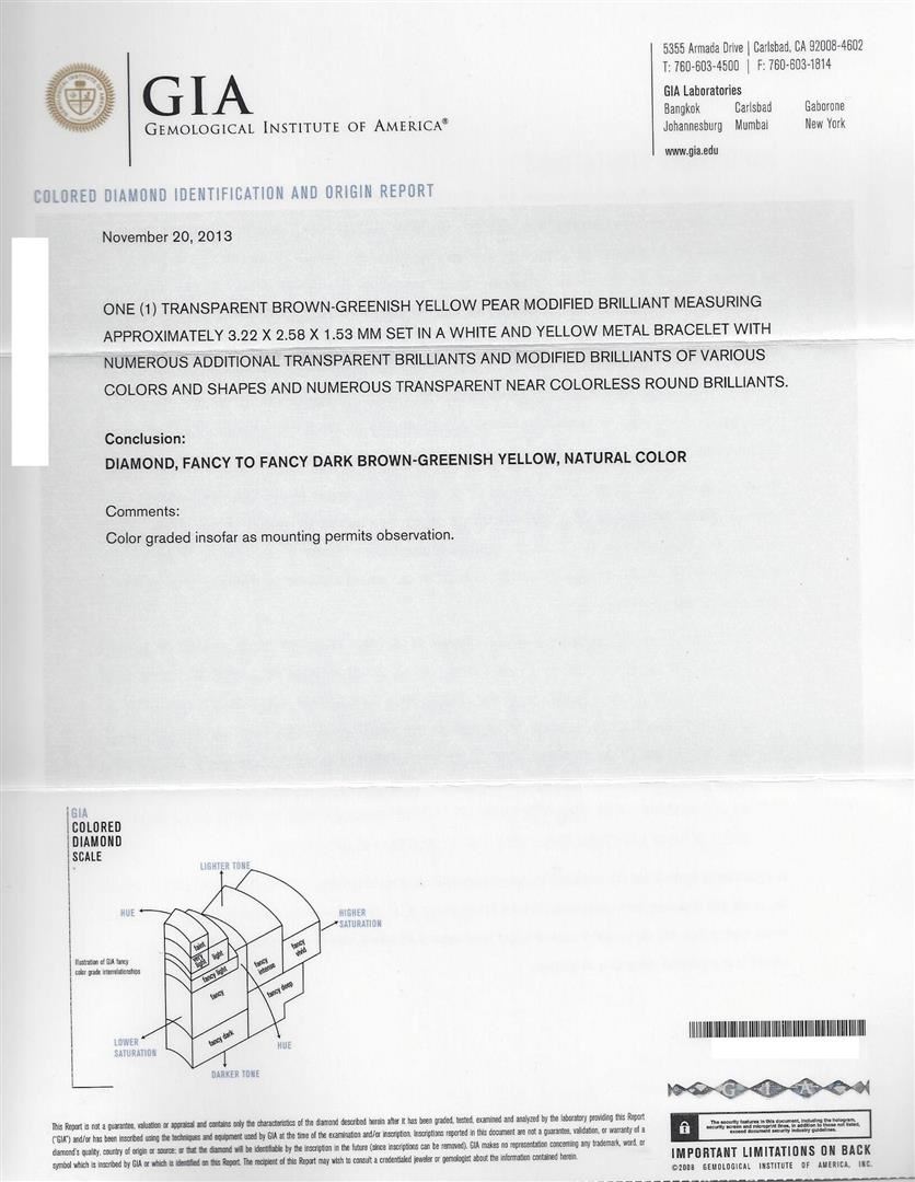 One GIA certified 18KT white and yellow gold hand made bracelet weighing 47.45 grams containing: natural fancy color mixed shape diamonds with a total weight of 21.03ct and natural round brilliant cut diamonds with a total weight of 6.36ct (VS clarity; E-F color). All fine cutting and proportions. 5 GIA certified reports. RBGS Appraised at $500,000.00.