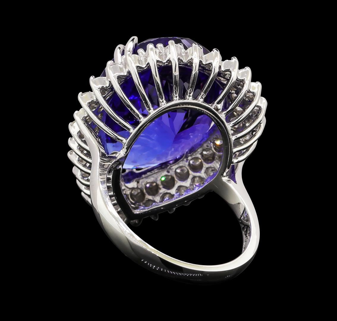 One electronically tested 14KT white gold lady's cast fashion ring with a double basket halo with a bright polish finish. The featured lady's ring has a shank measuring 2.51 millimeters wide. Identified with markings of 'K14'. Condition is new, good workmanship. Containing: One prong set pear modified brilliant cut natural tanzanite, measuring 20.39 x 14.39 x 12.88mm, (depth est.) 9%. bulge factor, approximate weight of 27.51ct., clarity is eye clean, dark, strong, violetish blue color, (GIA vB 7/5), cut is very good. Transmitting light with no distortion, transparent. Colored gemstones are presumed to have been subjected to commonly used enhancement processes. Graded loose prior to setting in the GIA Laboratory, Report #1172847820. Sixty-One prong set round brilliant cut diamonds, measuring 2.00 - 1.90 x 1.21mm (depth est.) approximate total weight of 61 Stones = 1.75ct. Graded in the setting. Clarity SI-1 to SI-2. Color: H - I Cut Good. Total Weight of Colored Stones 27.51ct.. Total Weight of Diamonds 1.75ct.. Total Weight of Ring 13.80gm. GAS Appraised at $41,775.00.