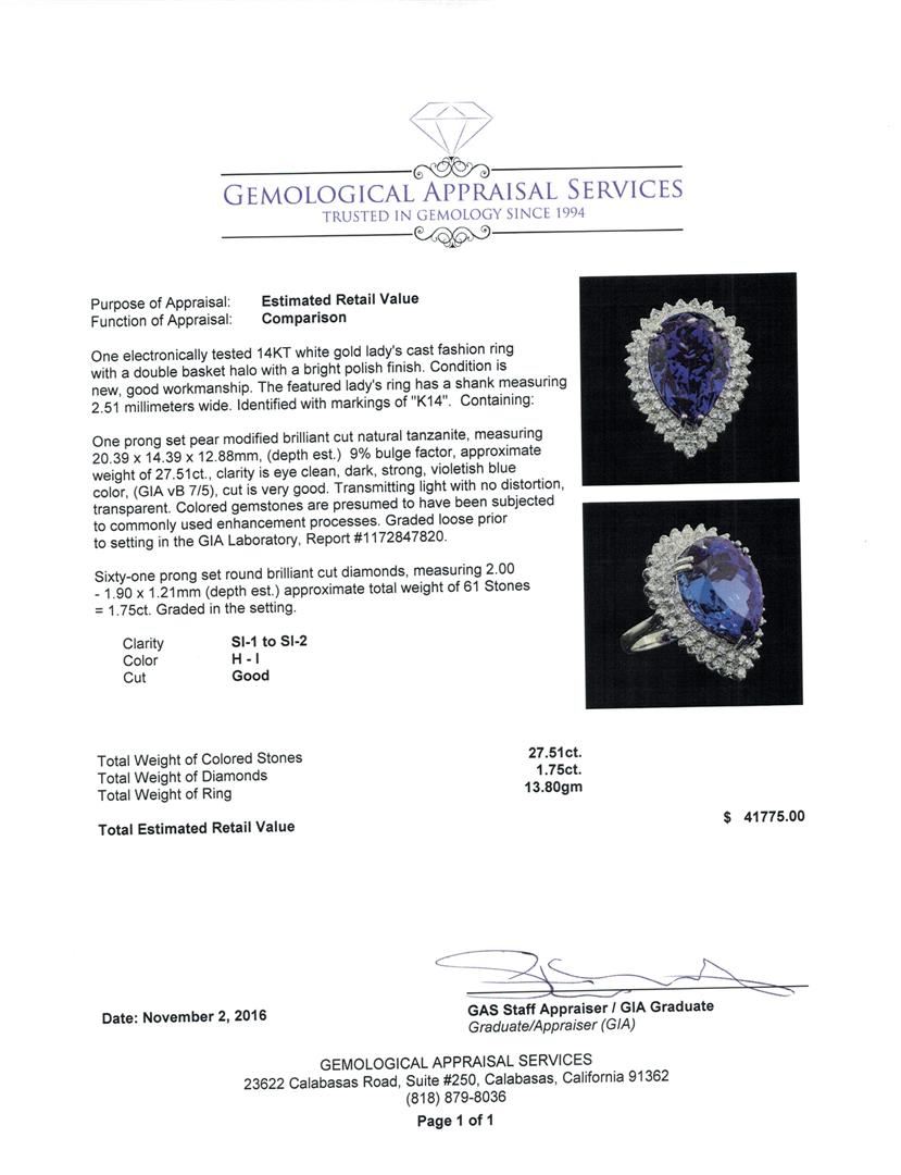 One electronically tested 14KT white gold lady's cast fashion ring with a double basket halo with a bright polish finish. The featured lady's ring has a shank measuring 2.51 millimeters wide. Identified with markings of 'K14'. Condition is new, good workmanship. Containing: One prong set pear modified brilliant cut natural tanzanite, measuring 20.39 x 14.39 x 12.88mm, (depth est.) 9%. bulge factor, approximate weight of 27.51ct., clarity is eye clean, dark, strong, violetish blue color, (GIA vB 7/5), cut is very good. Transmitting light with no distortion, transparent. Colored gemstones are presumed to have been subjected to commonly used enhancement processes. Graded loose prior to setting in the GIA Laboratory, Report #1172847820. Sixty-One prong set round brilliant cut diamonds, measuring 2.00 - 1.90 x 1.21mm (depth est.) approximate total weight of 61 Stones = 1.75ct. Graded in the setting. Clarity SI-1 to SI-2. Color: H - I Cut Good. Total Weight of Colored Stones 27.51ct.. Total Weight of Diamonds 1.75ct.. Total Weight of Ring 13.80gm. GAS Appraised at $41,775.00.