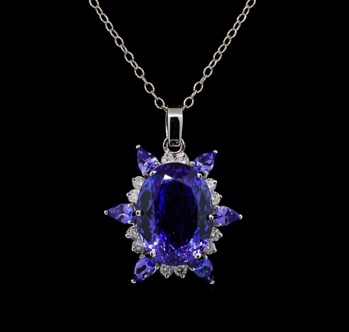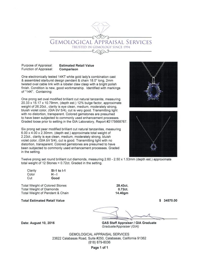 One electronically tested 14KT white gold lady's combination cast & assembled starburst design pendant & chain 18.0' long, 2mm twisted oval cable link with a lobster claw clasp with a bright polish finish. Identified with markings of '14K'. Condition is new, good workmanship. Containing: One prong set oval modified brilliant cut natural tanzanite, measuring 20.33 x 15.17 x 10.79mm, (depth est.) 12%. bulge factor, approximate weight of 26.20ct., clarity is eye clean, medium, moderately strong, bluish violet color, (GIA bV 5/4), cut is very good. Transmitting light with no distortion, transparent. Colored gemstones are presumed to have been subjected to commonly used enhancement processes. Graded loose prior to setting in the GIA Laboratory, Report #2175668767. Six prong set pear modified brilliant cut natural tanzanites, measuring 6.00 x 4.00 x 2.30mm, (depth est.) approximate total weight of 2.23ct., clarity is eye clean, medium, moderately strong, bluish violet color, (GIA bV 5/4), cut is good. Transmitting light with no distortion, transparent. Colored gemstones are presumed to have been subjected to commonly used enhancement processes. Graded in the setting. Twelve prong set round brilliant cut diamonds, measuring 2.60 - 2.50 x 1.53mm (depth est.) approximate total weight of 12 Stones = 0.72ct. Graded in the setting. Clarity SI-1 to I-1. Color: H - I Cut Good. Total Weight of Colored Stones 28.43ct.. Total Weight of Diamonds 0.72ct.. Total Weight of Pendant & Chain 14.40gm. GAS Appraised at $34,570.00.