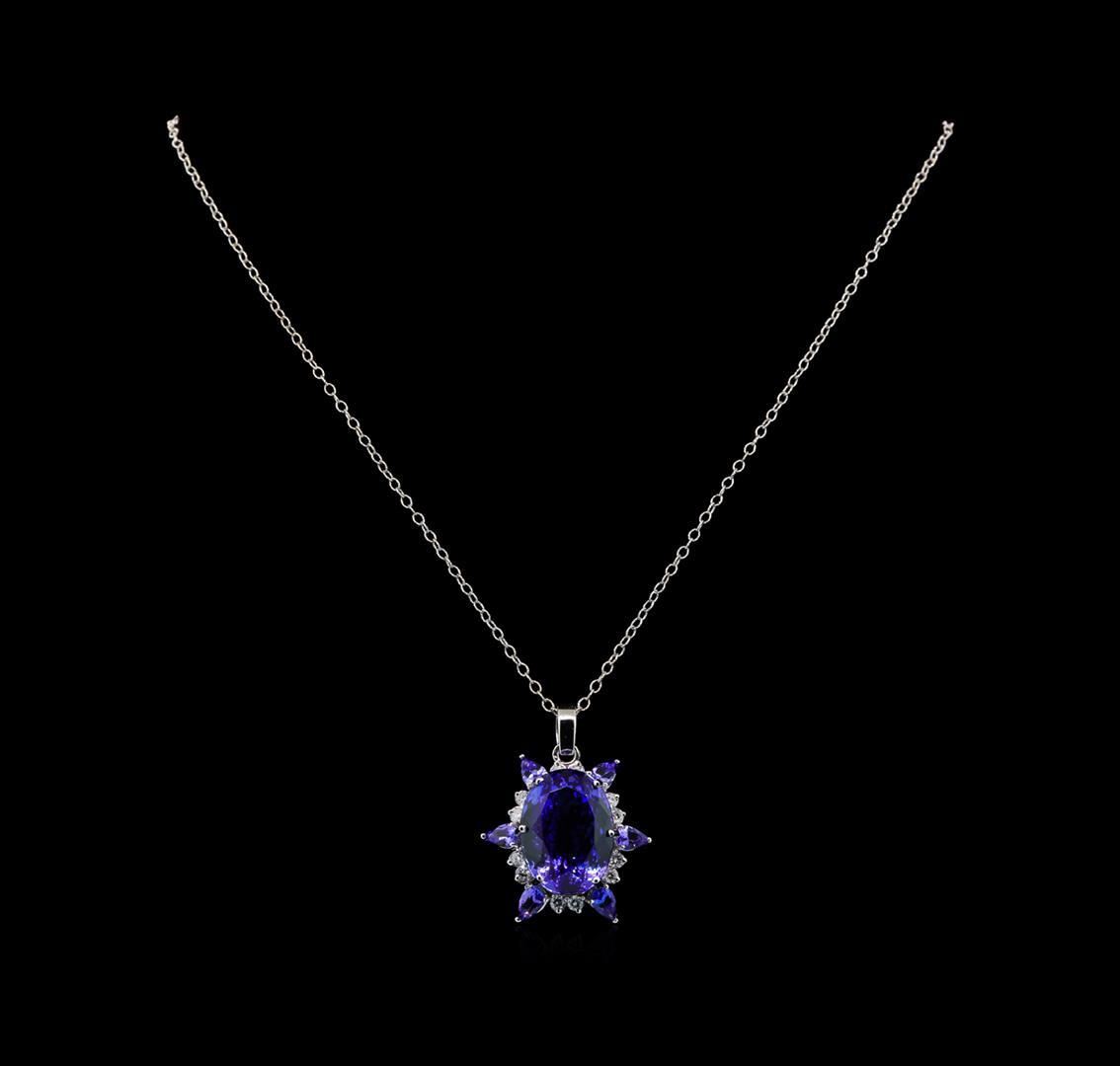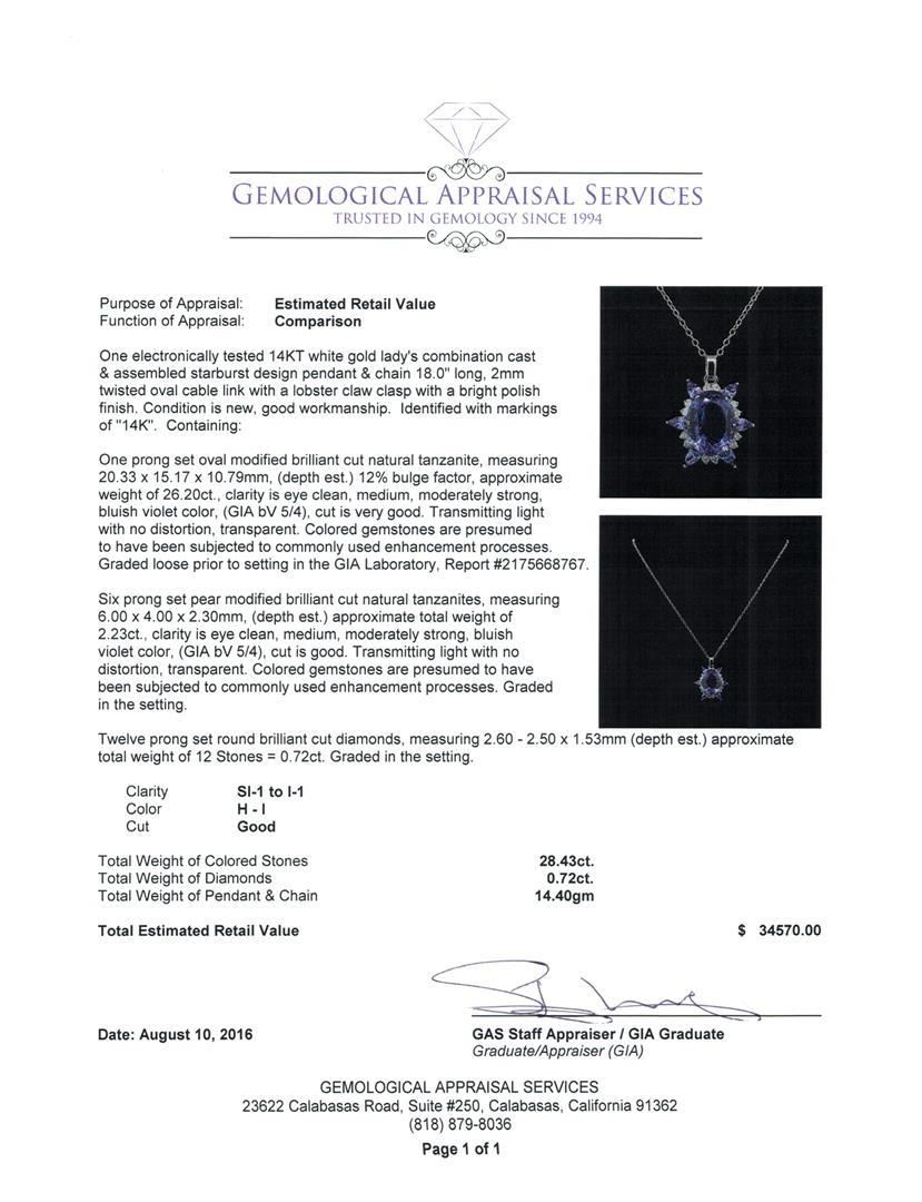 One electronically tested 14KT white gold lady's combination cast & assembled starburst design pendant & chain 18.0' long, 2mm twisted oval cable link with a lobster claw clasp with a bright polish finish. Identified with markings of '14K'. Condition is new, good workmanship. Containing: One prong set oval modified brilliant cut natural tanzanite, measuring 20.33 x 15.17 x 10.79mm, (depth est.) 12%. bulge factor, approximate weight of 26.20 ct., clarity is eye clean, medium, moderately strong, bluish violet color, (GIA bV 5/4), cut is very good. Transmitting light with no distortion, transparent. Colored gemstones are presumed to have been subjected to commonly used enhancement processes. Graded loose prior to setting in the GIA Laboratory, Report #2175668767. Six prong set pear modified brilliant cut natural tanzanites, measuring 6.00 x 4.00 x 2.30mm, (depth est.) approximate total weight of 2.23ct., clarity is eye clean, medium, moderately strong, bluish violet color, (GIA bV 5/4), cut is good. Transmitting light with no distortion, transparent. Colored gemstones are presumed to have been subjected to commonly used enhancement processes. Graded in the setting. Twelve prong set round brilliant cut diamonds, measuring 2.60 - 2.50 x 1.53mm (depth est.) approximate total weight of 12 Stones = 0.72ct. Graded in the setting. Clarity SI-1 to I-1. Color: H - I Cut Good. Total Weight of Colored Stones 28.43ct.. Total Weight of Diamonds 0.72ct.. Total Weight of Pendant & Chain 14.40gm. GAS Appraised.
