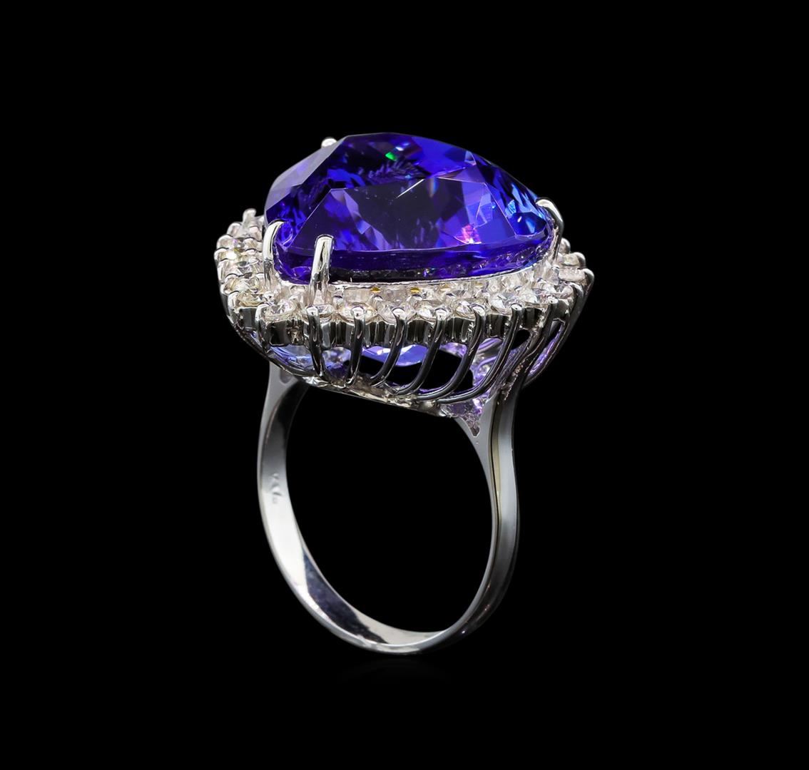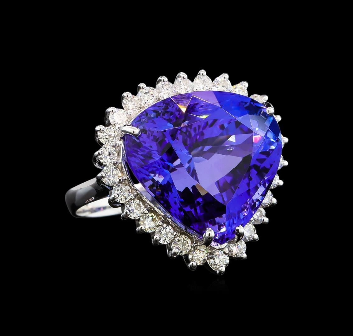 One electronically tested 14KT white gold lady's cast fashion ring with a basket halo with a bright polish finish. The featured lady's ring has a shank measuring 3.09 millimeters wide. Identified with markings of 'K14'. Condition is new, good workmanship. Containing: One prong set pear modified brilliant cut natural tanzanite, measuring 17.90 x 19.45 x 13.79mm, (depth est.) approximate weight of 28.94ct., clarity is eye clean, medium dark, strong, violet color, (GIA V 6/5), cut is very good. Transmitting light with no distortion, transparent. Colored gemstones are presumed to have been subjected to commonly used enhancement processes. Graded loose prior to setting in the GIA Laboratory, Report #2175668631. Twenty-Seven prong set round brilliant cut diamonds, measuring 2.35 - 2.25 x 1.43mm (depth est.) approximate total weight of 27 Stones = 1.25ct. Graded in the setting. Clarity SI-1 to I-1. Color: G - I Cut Good. Total Weight of Colored Stones 28.94ct.. Total Weight of Diamonds 1.25ct.. Total Weight of Ring 13.20gm. GAS Appraised at $39,115.00.