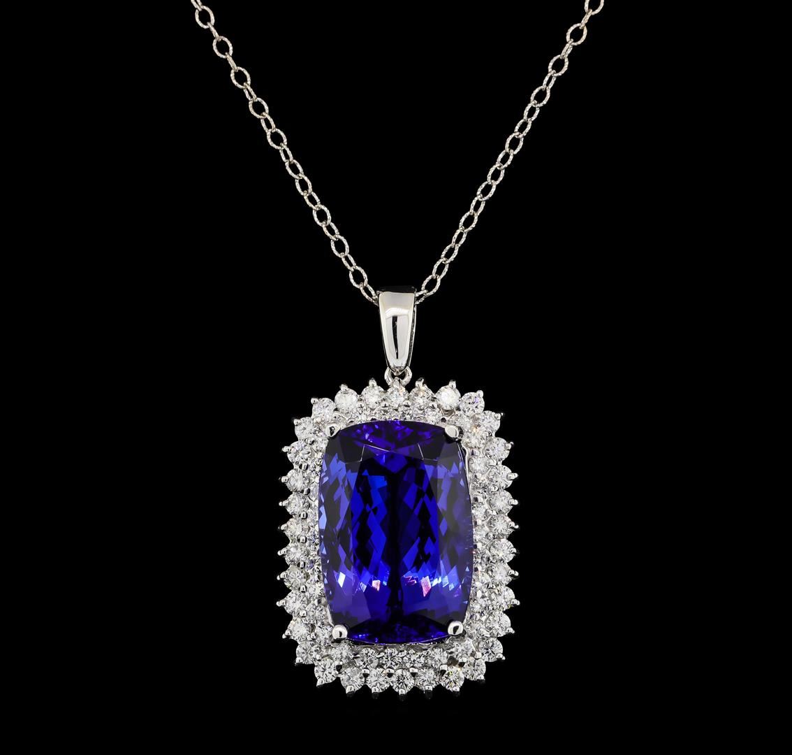 One electronically tested 14KT white gold lady's combination cast & assembled fashion pendant & chain 18.0' long, 1.9mm twisted oval shape link with a lobster claw clasp with a double basket halo with a bright polish finish. Identified with markings of '14K'. Condition is new, good workmanship. Containing: One prong set rectangular cushion modified brilliant cut natural tanzanite, measuring 22.10 x 15.18 x 10.06mm, (depth est.) 9%. bulge factor, approximate weight of 29.02ct., clarity is eye clean, medium dark, strong, violetish blue color, (GIA vB 6/5), cut is very good. Transmitting light with no distortion, transparent. Colored gemstones are presumed to have been subjected to commonly used enhancement processes. Graded loose prior to setting in the GIA Laboratory, Report #5172847131. Thirty-Four prong set round brilliant cut diamonds, measuring 2.40 - 2.30 x 1.46mm (depth est.) approximate total weight of 34 Stones = 1.67ct. Graded in the setting. Clarity SI-1 to SI-3. Color: H - I Cut Good Thirty prong set round brilliant cut diamonds, measuring 2.30 - 2.20 x 1.35mm (depth est.) approximate total weight of 30 Stones = 1.26ct. Graded in the setting. Clarity SI-1 to SI-2. Color: H - J Cut Good. Total Weight of Colored Stones 29.02ct.. Total Weight of Diamonds 2.93ct.. Total Weight of Pendant & Chain 19.40gm. GAS Appraised at $44,680.00.