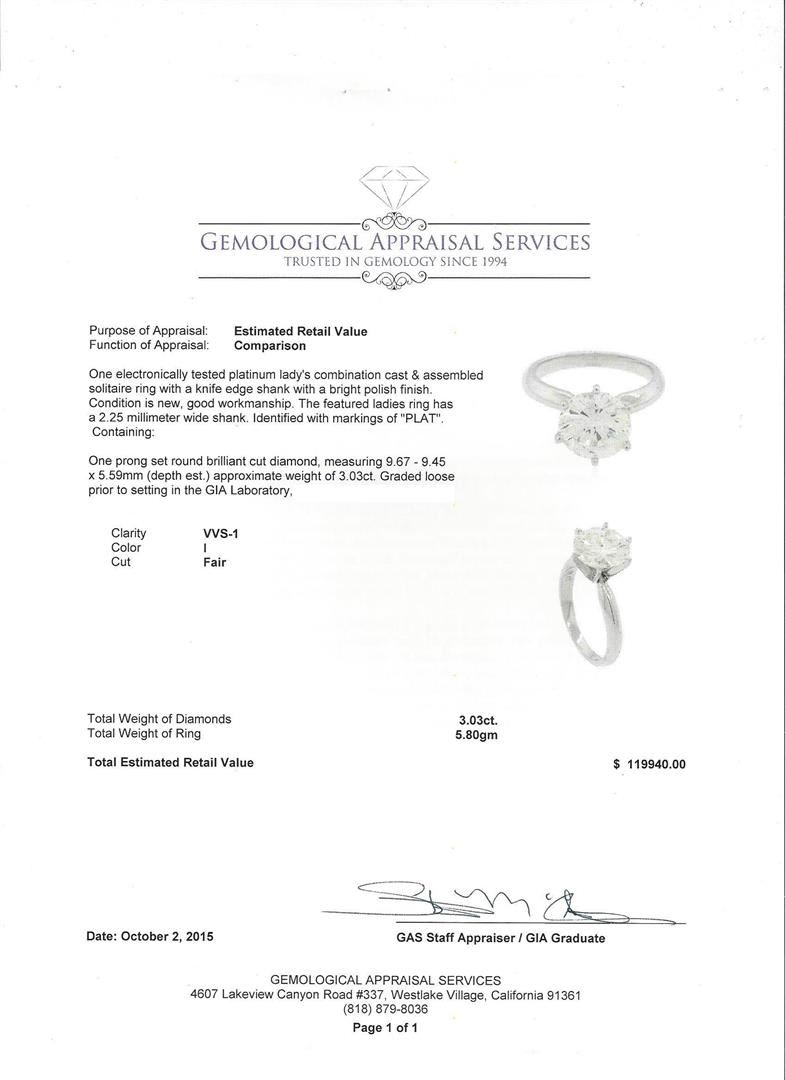 One electronically tested platinum lady's combination cast & assembled solitaire ring with a knife edge shank with a bright polish finish. Condition is new, good workmanship. The featured ladies ring has a 2.25 millimeter wide shank. Identified with markings of "PLAT". Containing: One prong set round brilliant cut diamond, measuring 9.67 - 9.45 x 5.59mm (depth est.) approximate weight of 3.03ct. Graded loose prior to setting in the GIA Laboratory. Clarity: VVS-1. Color: I. Cut: Fair. Total Weight of Diamond: 3.03ct. Total Weight of Ring: 5.80 grams. GAS Appraised at $119,940.00.