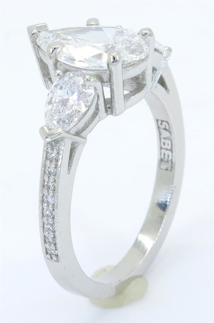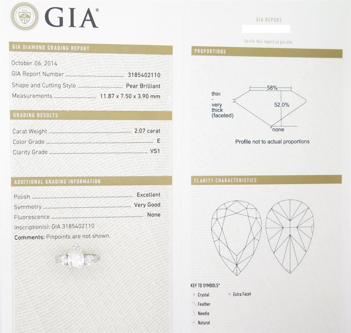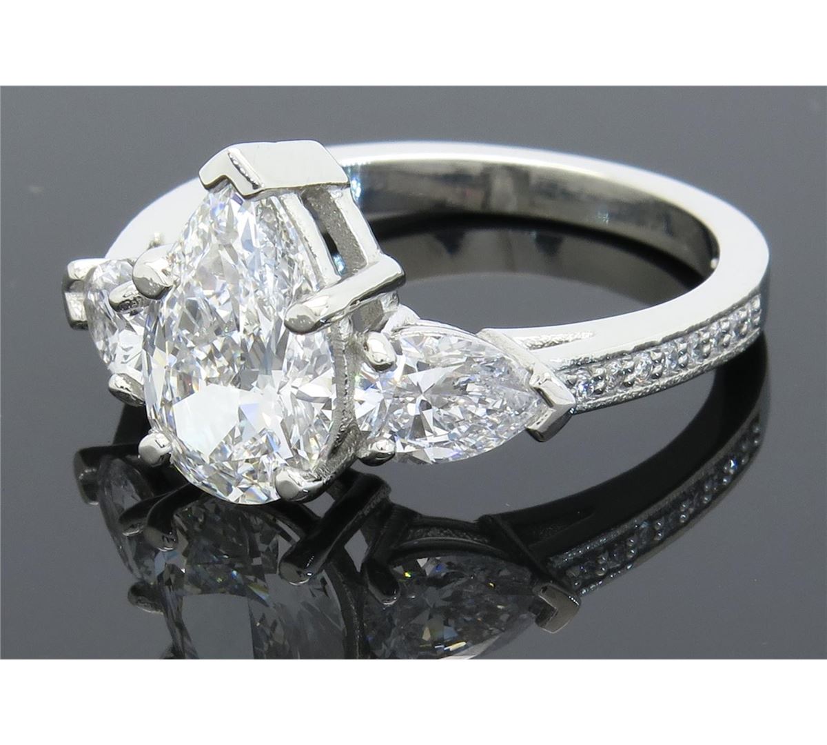 One tested Platinum GIA certified diamond ring. Condition is new. Containing: One Pear cut Diamond. Weight: 2.07CT, Clarity: VS1, Color: E. Two additional Pear Cut Diamonds, and Sixteen Round Brilliant cut Diamonds. Approximate total diamond weight: 3.21CTW. Diamonds are graded in the mounting, unless otherwise stated. Weight of ring: 8.2 grams. Size: 8.0 GIA Appraised.