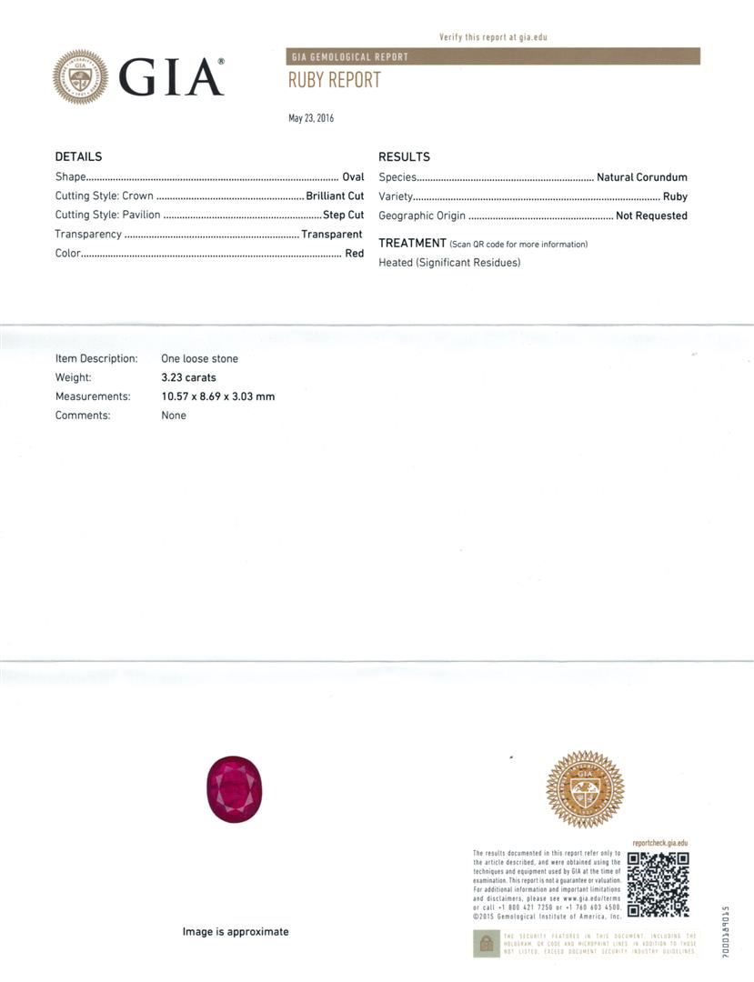 One electronically tested 14KT yellow gold lady's cast fashion ring with a cathedral triple basket halo with a bright polish finish. The featured lady's ring has a shank measuring 2.32 millimeters in width. Identified with markings of 'K14'. Condition is new, good workmanship. Containing: One prong set oval modified mixed cut natural ruby, measuring 10.57 x 8.69 x 3.03mm, (depth est.) 20%. bulge factor, approximate weight of 3.23ct., clarity is heavily included, medium, moderately strong, red color, (GIA R 5/4), cut is very good. Transmitting light somewhat diffusely, transparent to translucent. Indications of laboratory high temperature heat treatment. Naturally occurring internal & external characteristics are present. Colored gemstones are presumed to have been subjected to commonly used enhancement processes. Graded loose prior to setting in the GIA Laboratory, Report #2171603584. Sixteen prong set round brilliant cut diamonds, measuring 2.10 - 2.00 x 1.27mm (depth est.) approximate total weight of 16 Stones = 0.53ct. Graded in the setting. Clarity SI-1 to SI-2. Color: H - I Cut Good Thirty-Two prong set round brilliant cut diamonds, measuring 1.80 - 1.70 x 1.09mm (depth est.) approximate total weight of 32 Stones = 0.65ct. Graded in the setting. Clarity SI-1 to SI-2. Color: H - I Cut Good Thirty-Two prong set round brilliant cut diamonds, measuring 1.65 - 1.60 x 0.98mm (depth est.) approximate total weight of 32 Stones = 0.50ct. Graded in the setting. Clarity SI-1 to SI-2. Color: H - I Cut Good. Total Weight of Colored Stones 3.23ct.. Total Weight of Diamonds 1.68ct.. Total Weight of Ring 9.80gm.