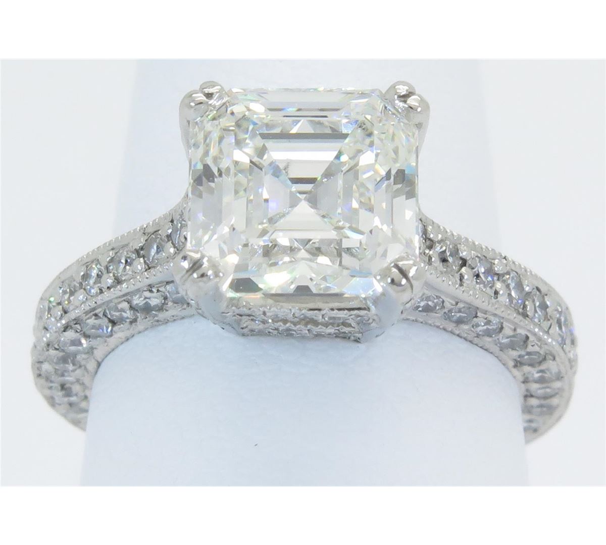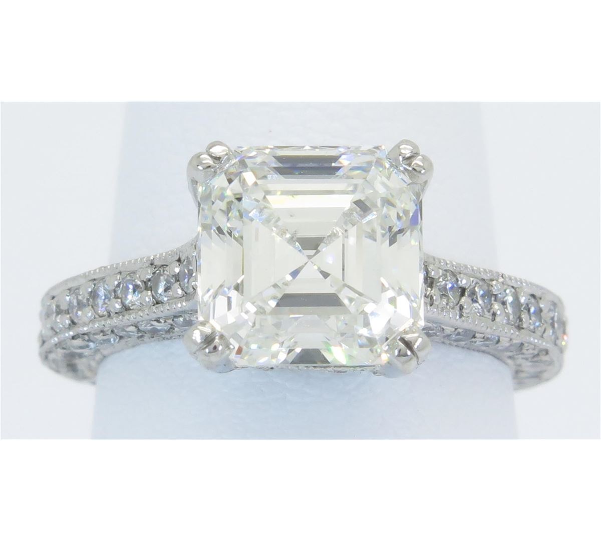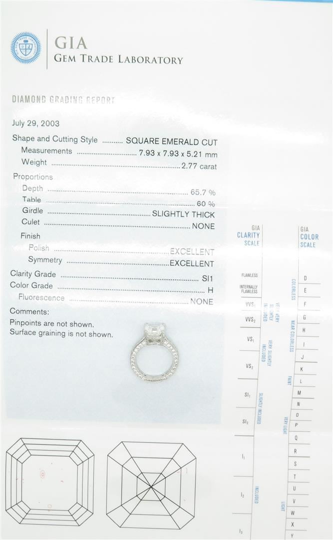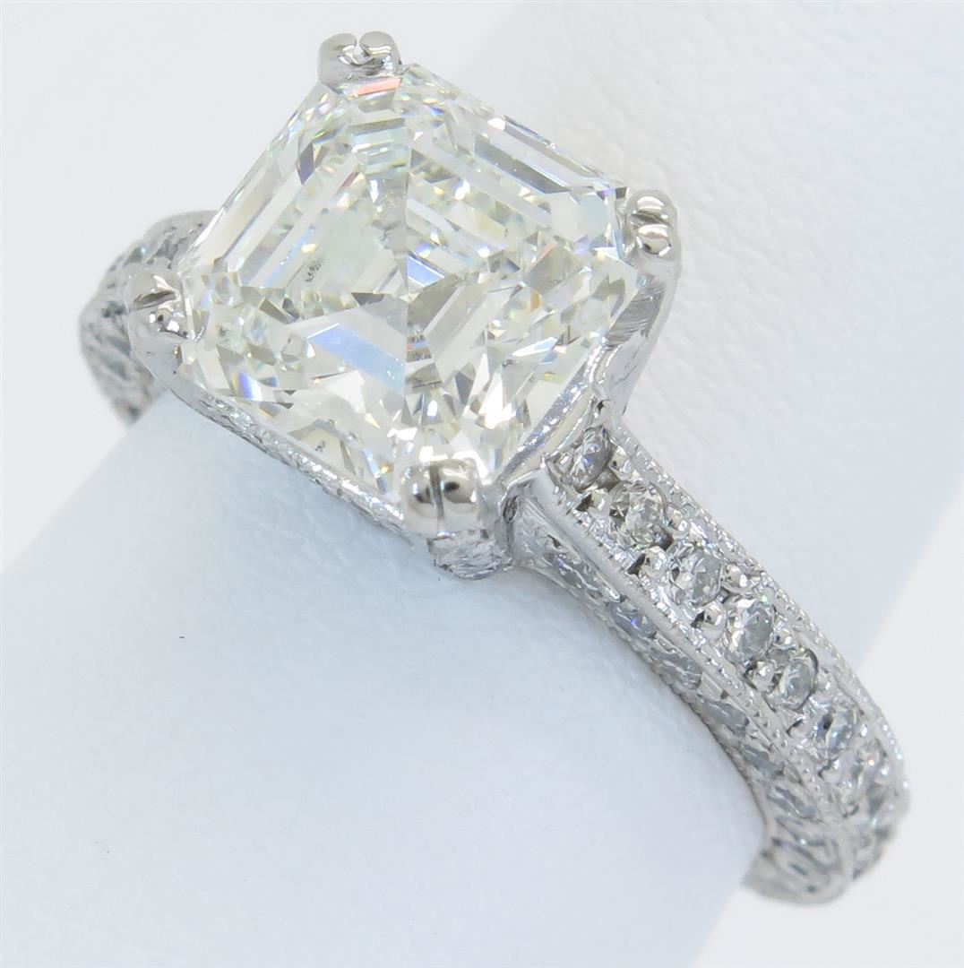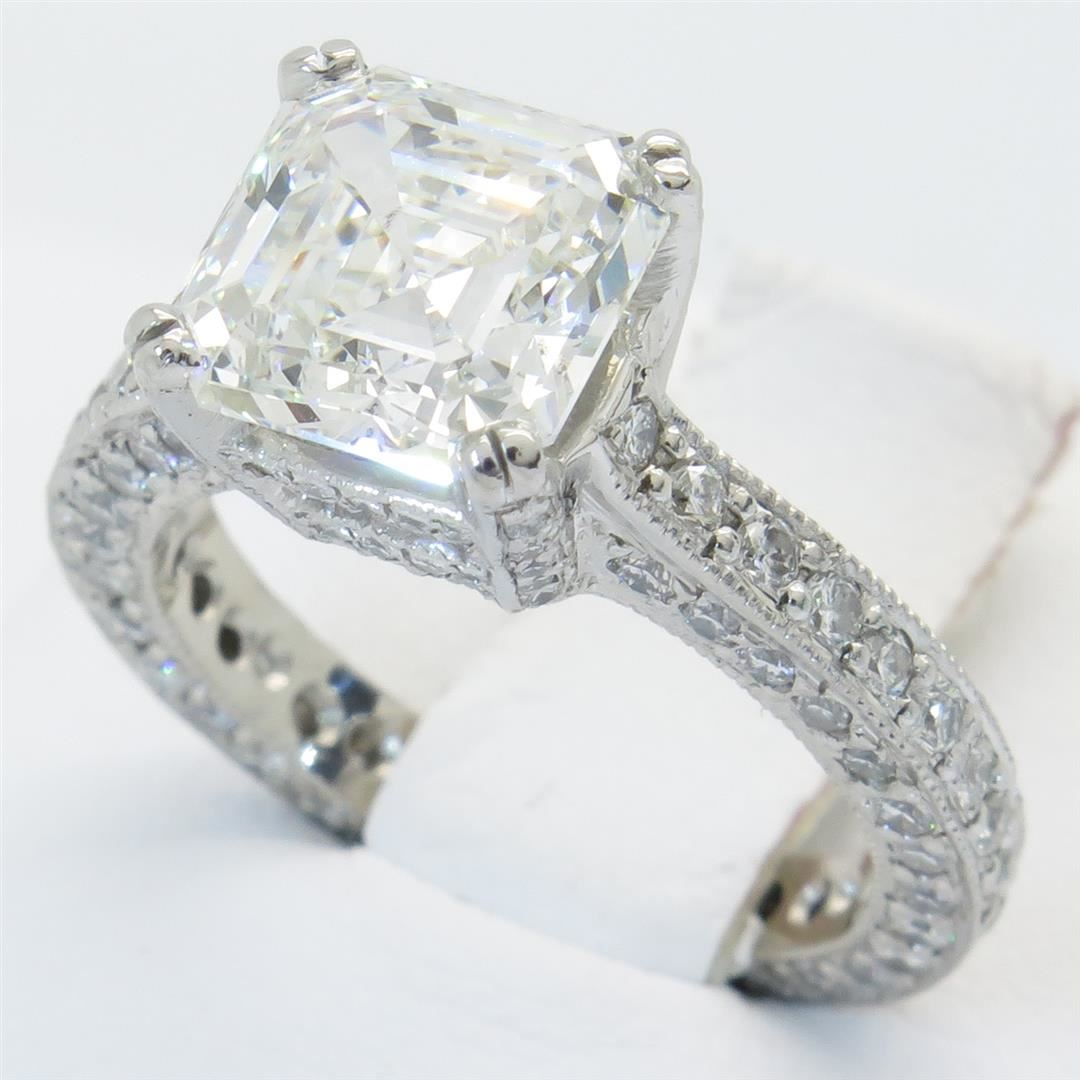 One tested platinum diamond ring. Containing: One GIA Certified Asscher Cut Diamond. Size: 2.77CT, Clarity: SI1, Color: H. 118 Round Brilliant Cut Diamonds. Approximate total diamond weight: 3.24CTW. All diamonds are graded in the mounting unless otherwise stated. Weight of ring: 7.6 grams, Size: 4.5. GIA Appraised.