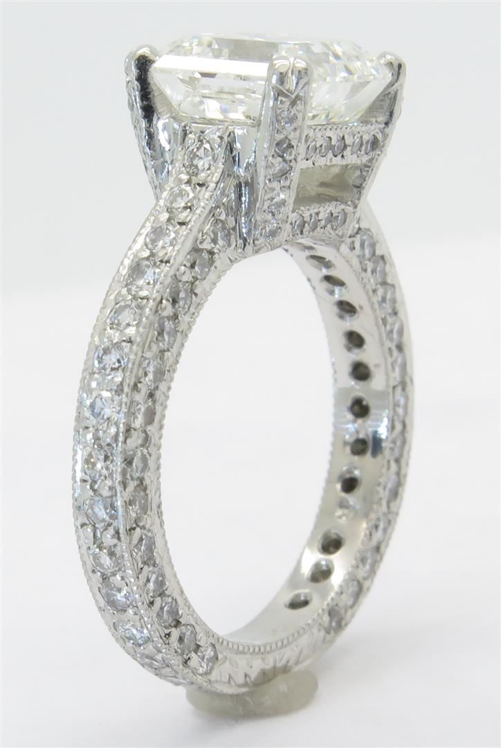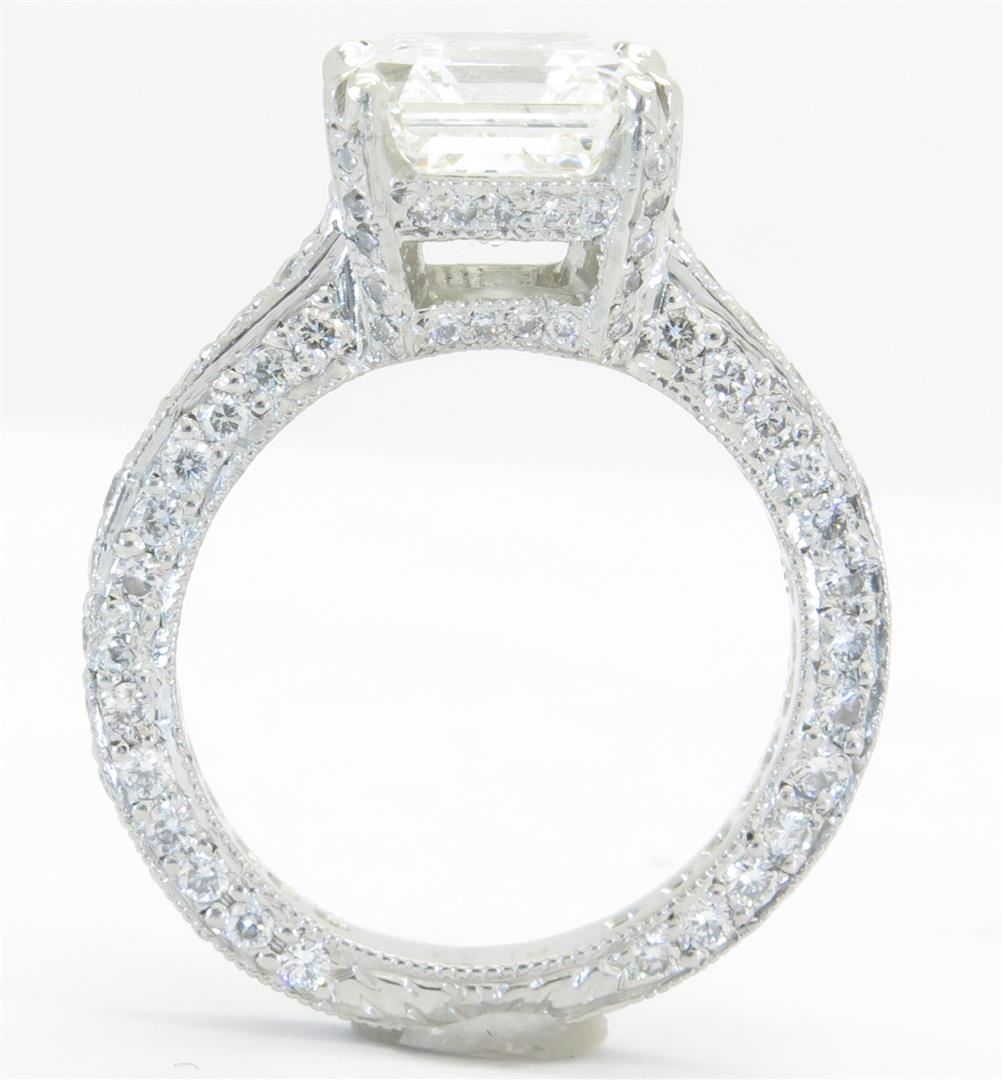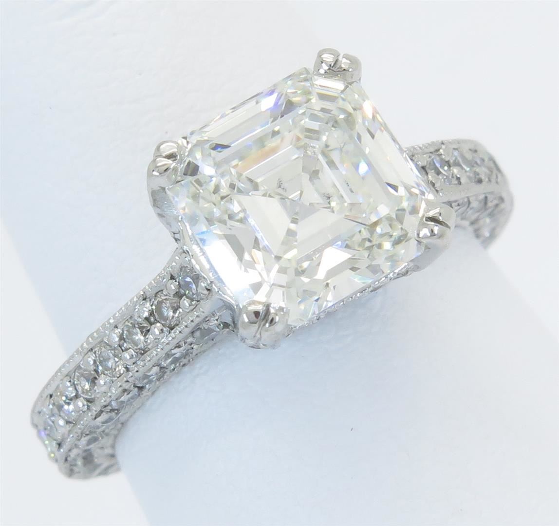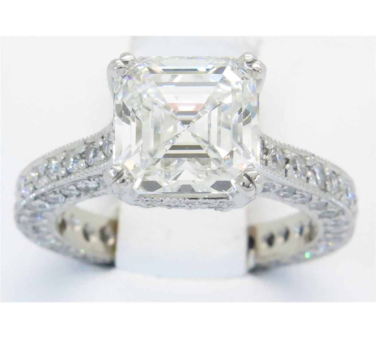 One tested platinum diamond ring. Containing: One GIA Certified Asscher Cut Diamond. Size: 2.77CT, Clarity: SI1, Color: H. 118 Round Brilliant Cut Diamonds. Approximate total diamond weight: 3.24CTW. All diamonds are graded in the mounting unless otherwise stated. Weight of ring: 7.6 grams, Size: 4.5. GIA Appraised.