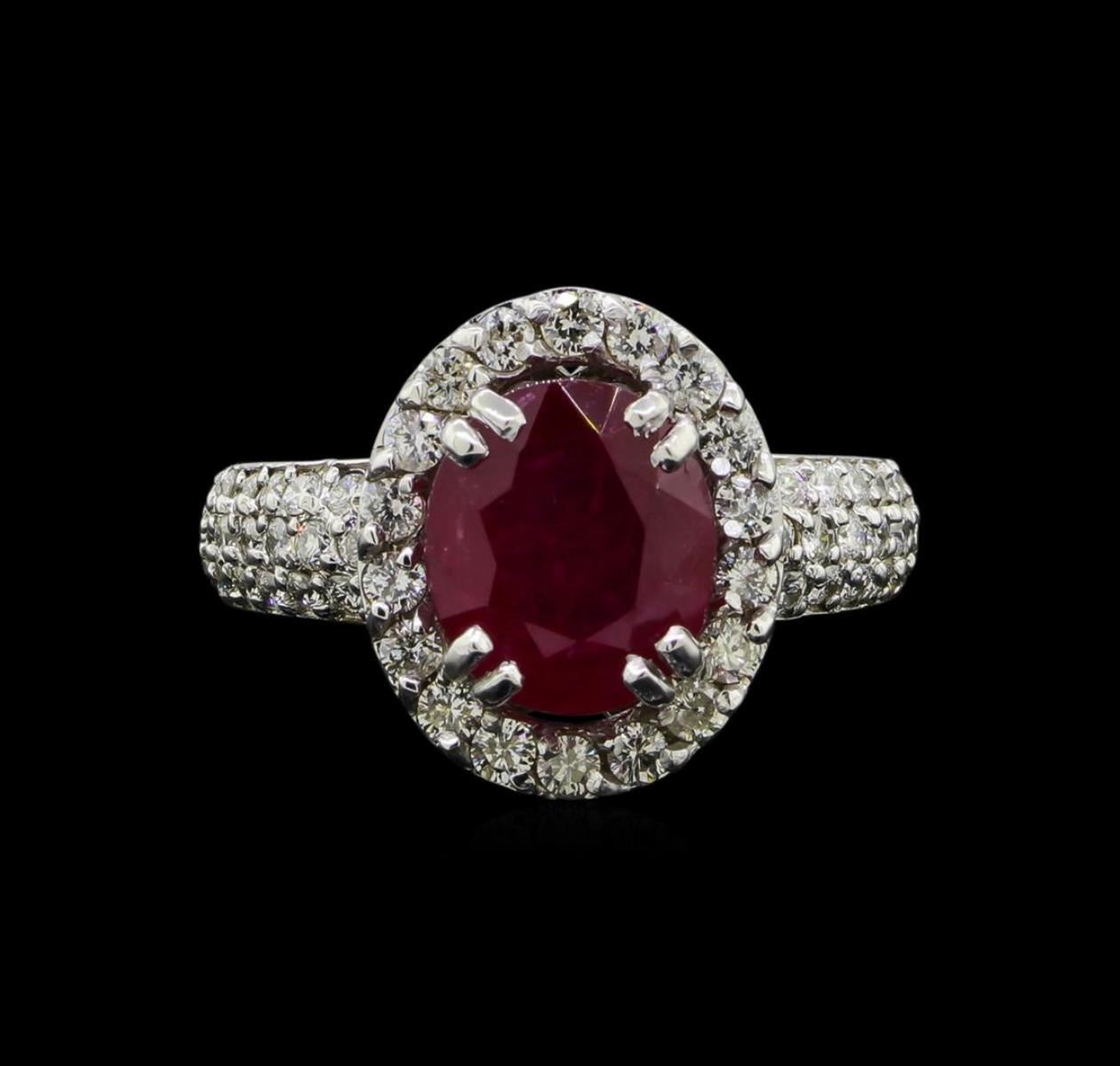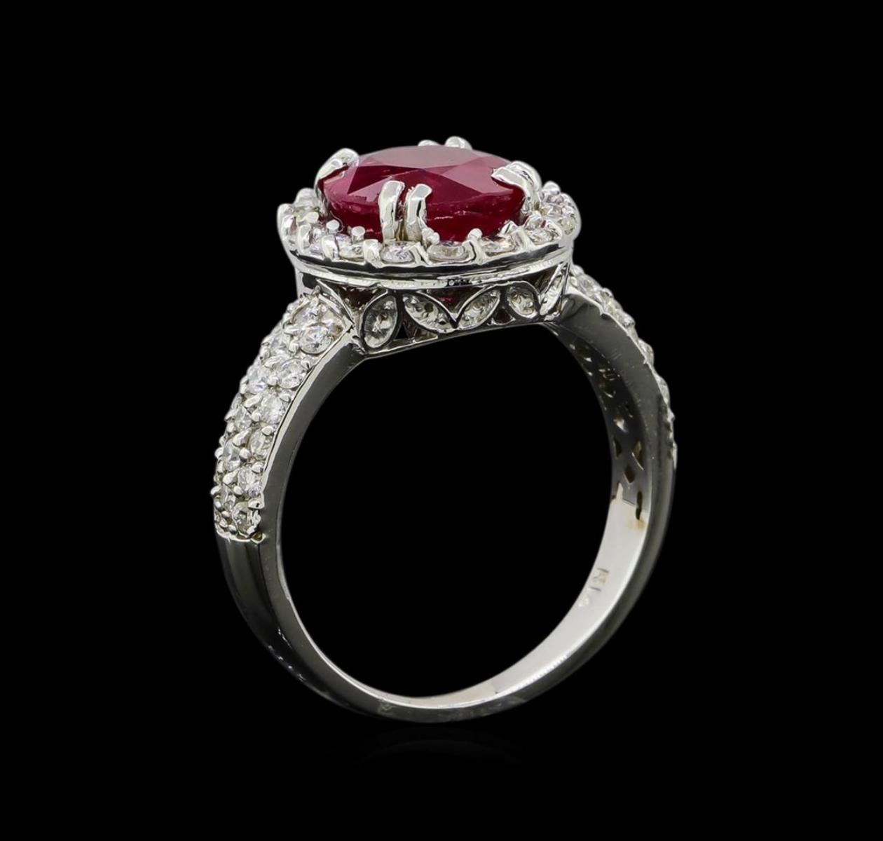 One electronically tested 14KT white gold lady's cast fashion ring with a basket halo with a bright polish finish. The featured lady's ring has a shank measuring 2.25 millimeters wide. Identified with markings of 'K14'. Condition is new, good workmanship. Containing: One prong set oval modified mixed cut natural ruby, measuring 9.73 x 8.44 x 4.41mm, (depth est.) 5%. bulge factor, approximate weight of 3.24ct., clarity is heavily included, medium dark, moderately strong, red color, (GIA R 6/4), cut is good. Transmitting light somewhat diffusely, semi-transparent to translucent. Indications of laboratory high temperature heat treatment. Naturally occurring internal & external characteristics are present. Colored gemstones are presumed to have been subjected to commonly used enhancement processes. Graded loose prior to setting in the GIA Laboratory, Report #5171603145. Eighteen prong set round brilliant cut diamonds, measuring 1.95 - 1.85 x 1.16mm (depth est.) approximate total weight of 18 Stones = 0.46ct. Graded in the setting. Clarity SI-1 to SI-2. Color: H - I Cut Good Thirty-Six prong set round brilliant cut diamonds, measuring 1.50 - 1.40 x 0.90mm (depth est.) approximate total weight of 36 Stones = 0.42ct. Graded in the setting. Clarity SI-1 to SI-2. Color: H - I Cut Good. Total Weight of Colored Stones 3.24ct.. Total Weight of Diamonds 0.88ct.. Total Weight of Ring 5.80gm. GAS Appraised.