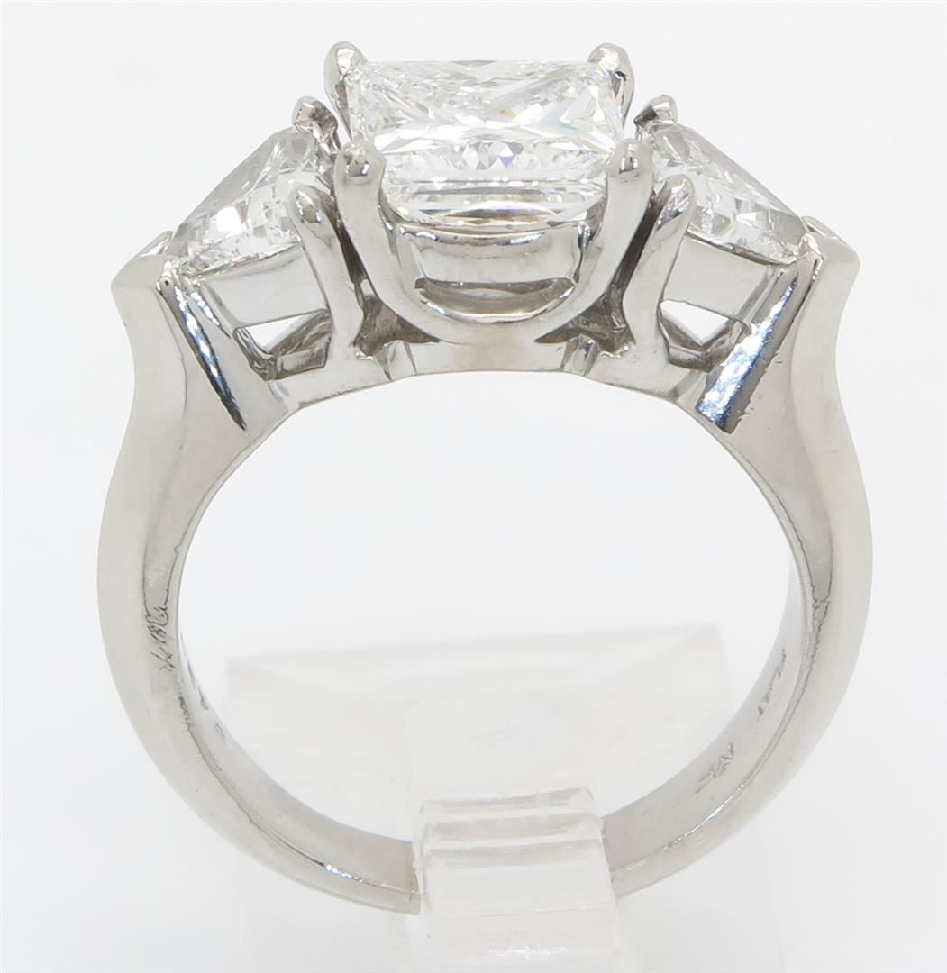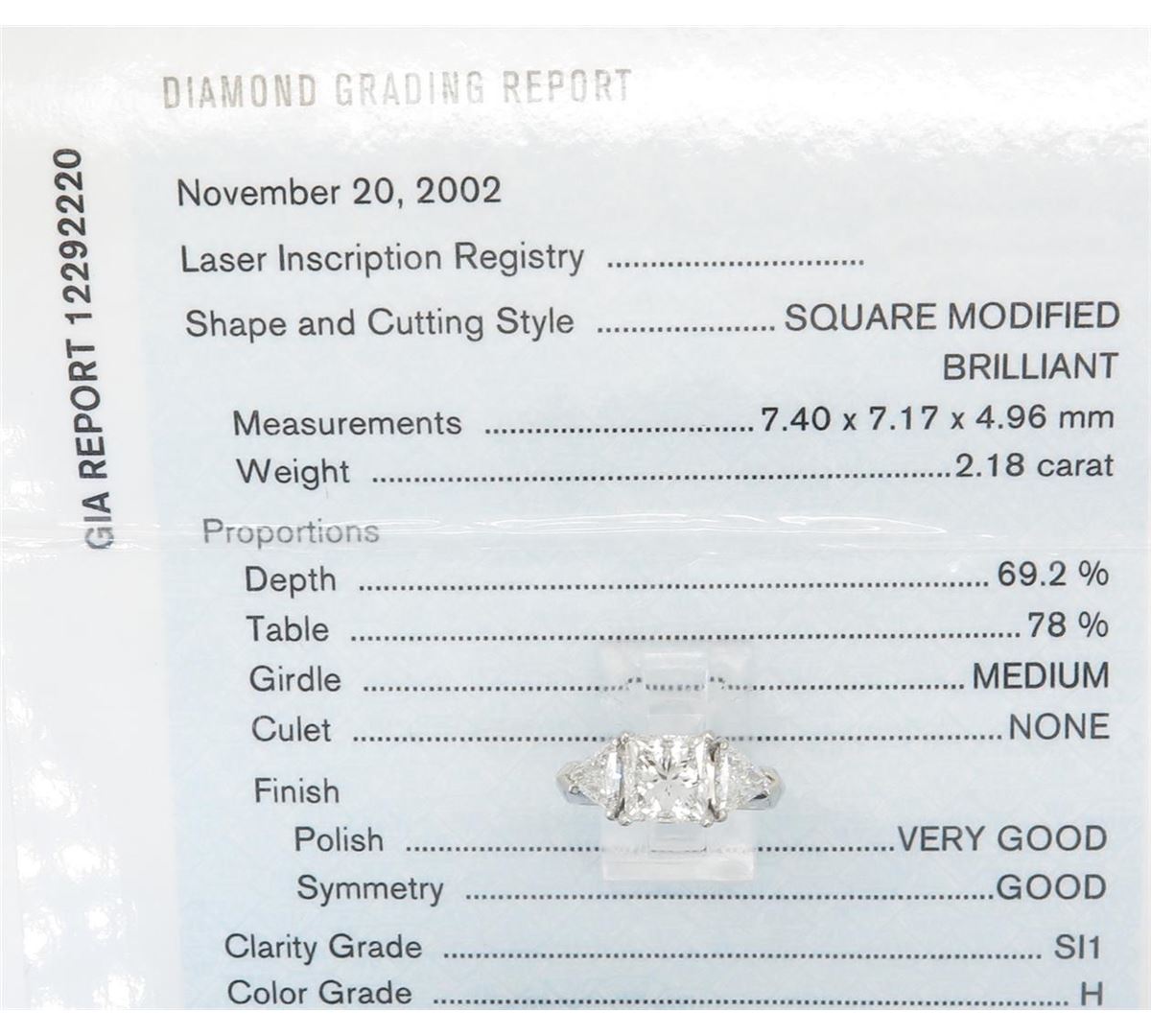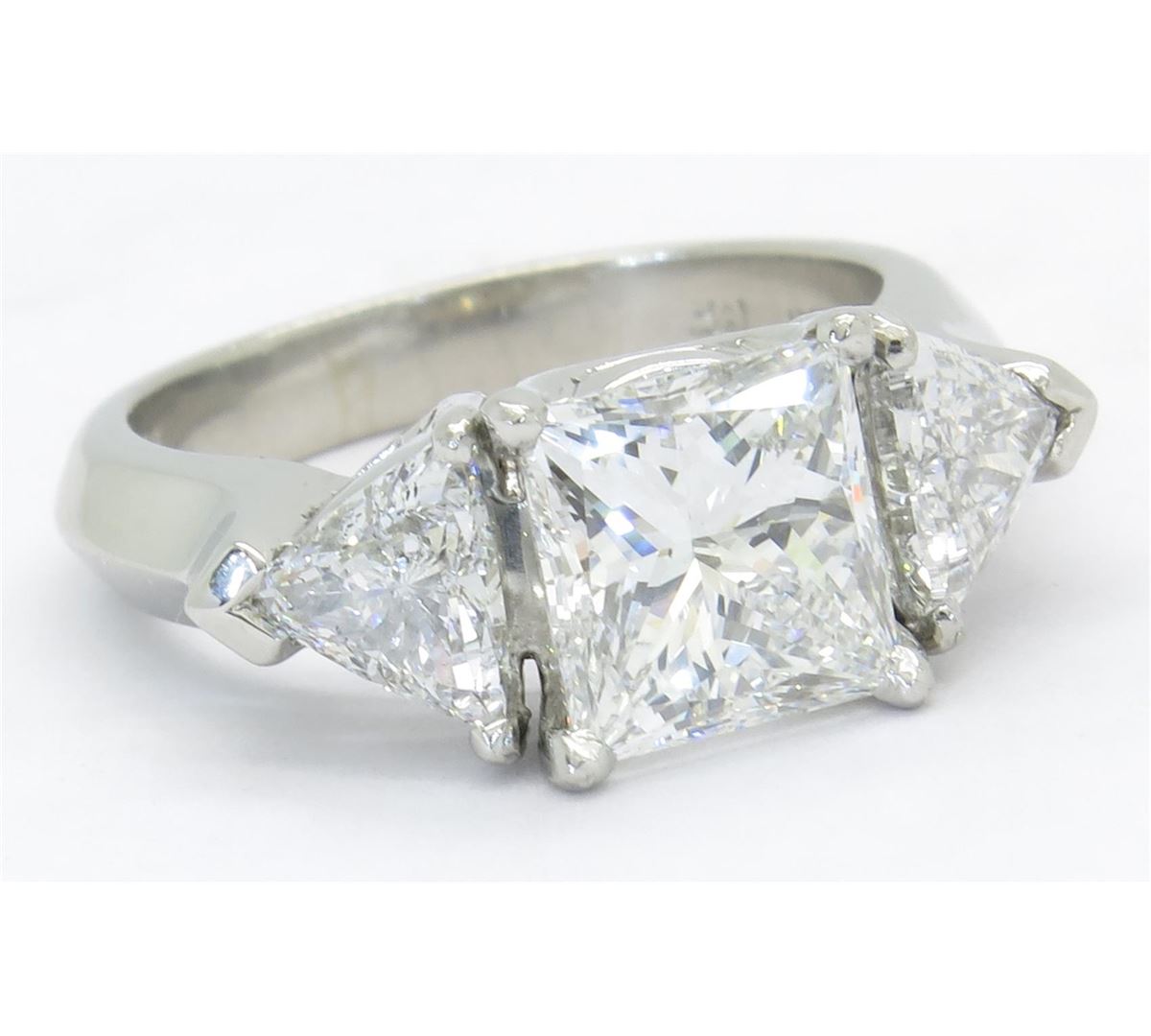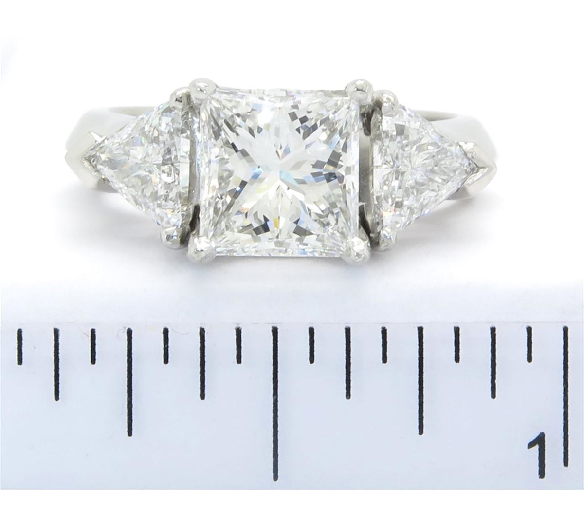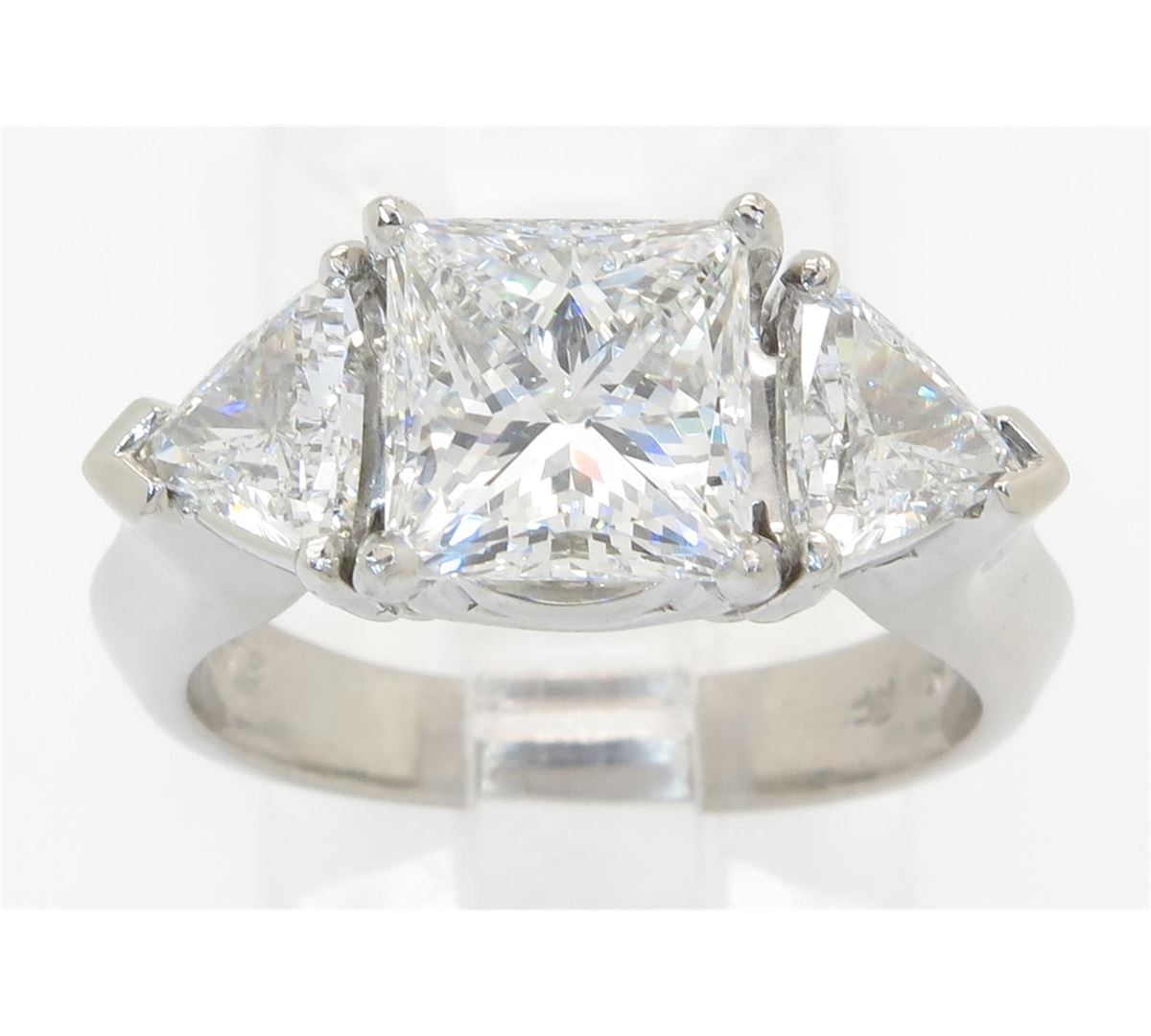 One tested platinum diamond ring by designer Martin Flyer. Containing: One GIA Certified Princess Cut Diamond. Size: 2.18CT, Clarity: SI1, Color: H. Two Trilliant Cut Diamonds. Approximate total diamond weight: 3.27CTW. All diamonds are graded in the mounting unless otherwise stated. Weight of ring: 9.2 grams, Size: 5.0. GIA Appraised.