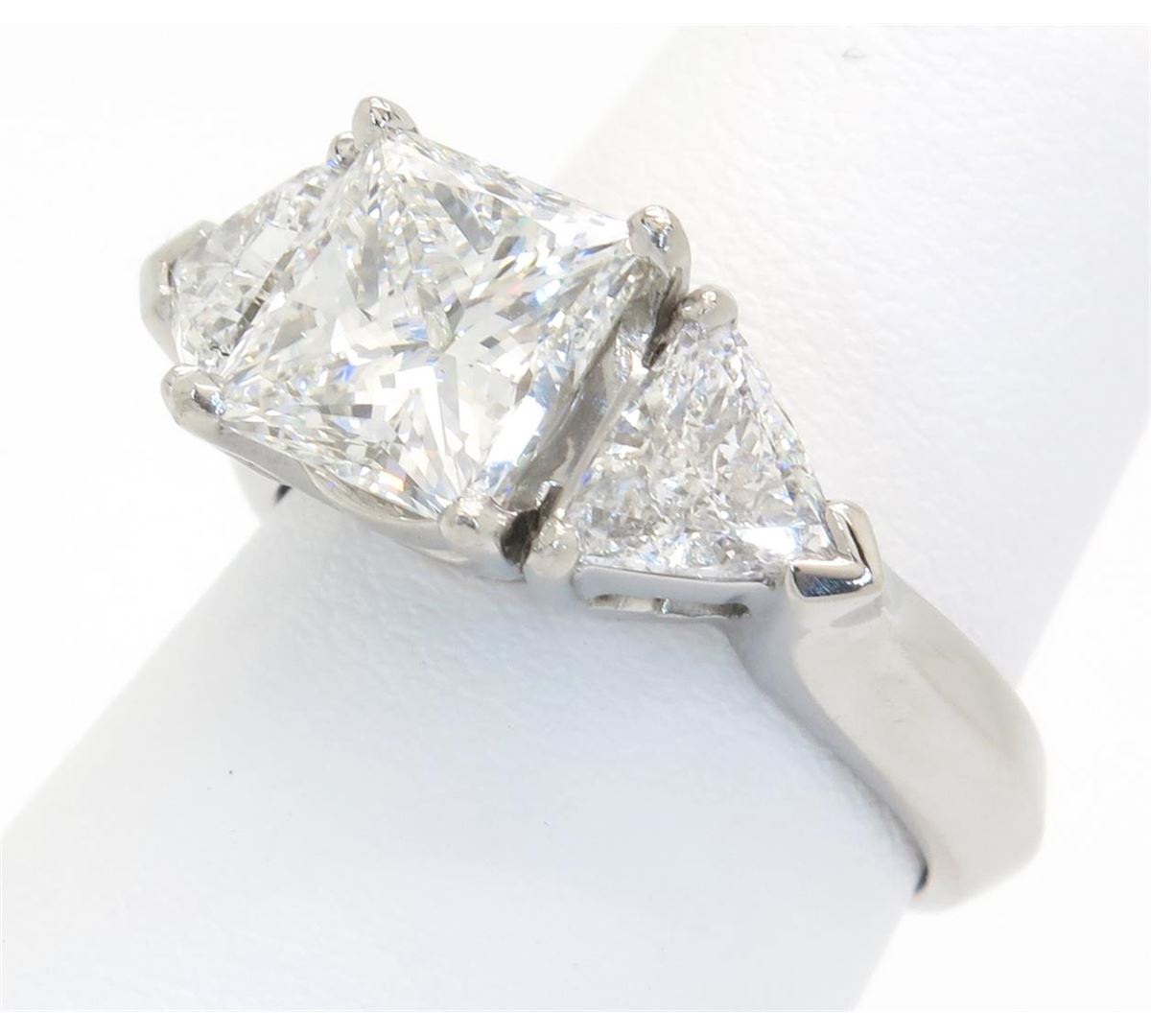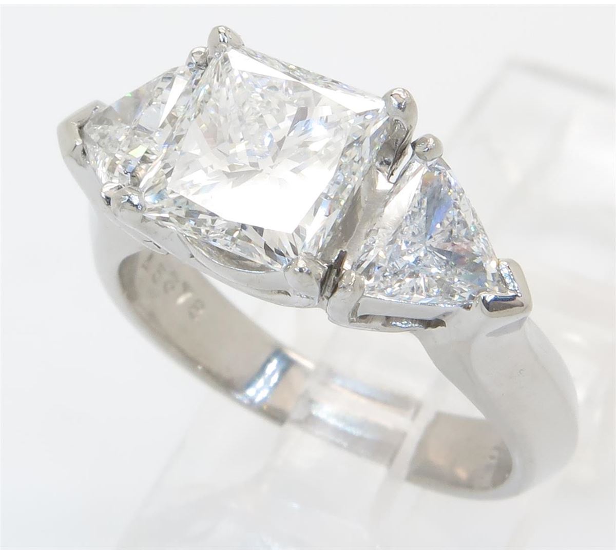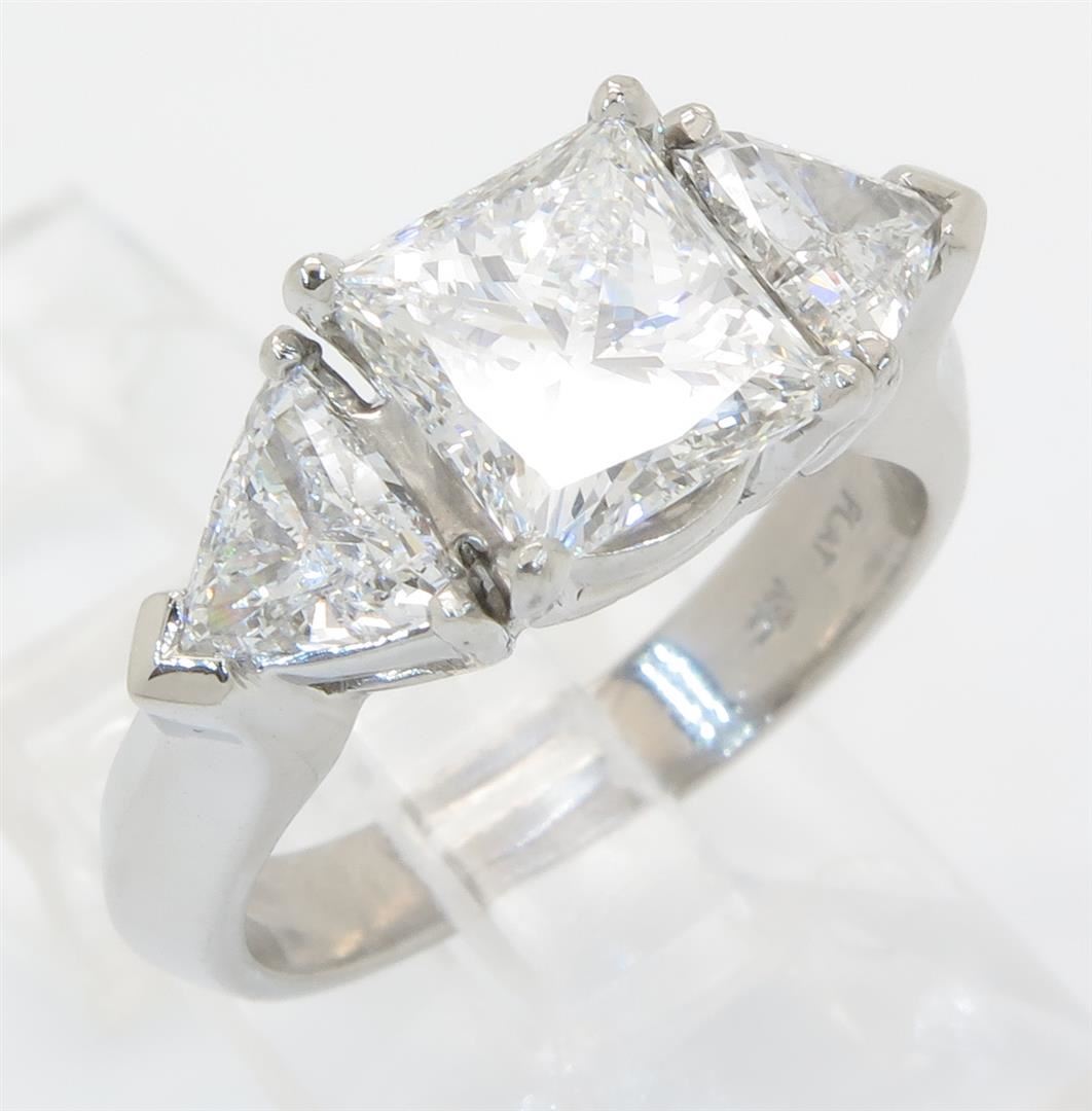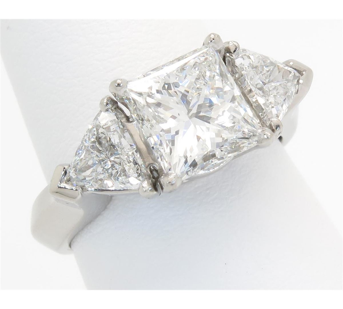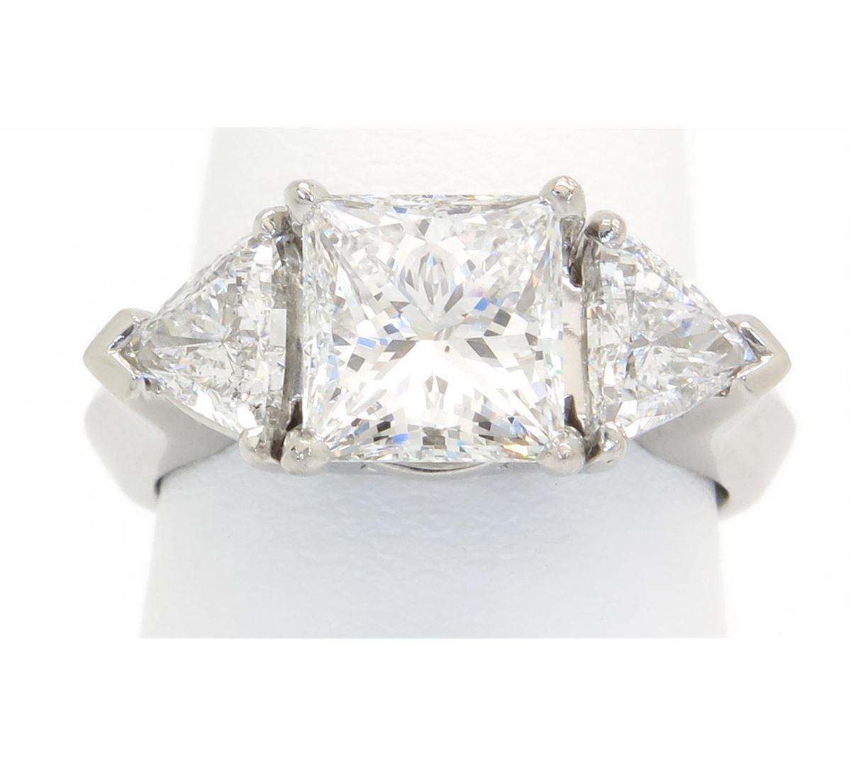 One tested platinum diamond ring by designer Martin Flyer. Containing: One GIA Certified Princess Cut Diamond. Size: 2.18CT, Clarity: SI1, Color: H. Two Trilliant Cut Diamonds. Approximate total diamond weight: 3.27CTW. All diamonds are graded in the mounting unless otherwise stated. Weight of ring: 9.2 grams, Size: 5.0. GIA Appraised.