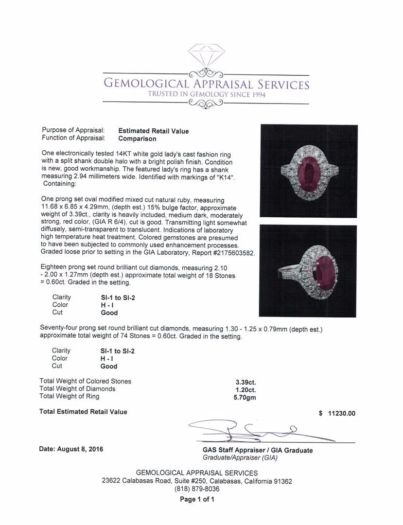 One electronically tested 14KT white gold lady's cast fashion ring with a split shank double halo with a bright polish finish. The featured lady's ring has a shank measuring 2.94 millimeters wide. Identified with markings of 'K14'. Condition is new, good workmanship. Containing: One prong set oval modified mixed cut natural ruby, measuring 11.68 x 6.85 x 4.29mm, (depth est.) 15%. bulge factor, approximate weight of 3.39ct., clarity is heavily included, medium dark, moderately strong, red color, (GIA R 6/4), cut is good. Transmitting light somewhat diffusely, semi-transparent to translucent. Indications of laboratory high temperature heat treatment. Colored gemstones are presumed to have been subjected to commonly used enhancement processes. Graded loose prior to setting in the GIA Laboratory, Report #2175603582. Eighteen prong set round brilliant cut diamonds, measuring 2.10 - 2.00 x 1.27mm (depth est.) approximate total weight of 18 Stones = 0.60ct. Graded in the setting. Clarity SI-1 to SI-2. Color: H - I Cut Good Seventy-Four prong set round brilliant cut diamonds, measuring 1.30 - 1.25 x 0.79mm (depth est.) approximate total weight of 74 Stones = 0.60ct. Graded in the setting. Clarity SI-1 to SI-2. Color: H - I Cut Good. Total Weight of Colored Stones 3.39ct.. Total Weight of Diamonds 1.20ct.. Total Weight of Ring 5.70gm. GAS Appraised at $11,230.00.