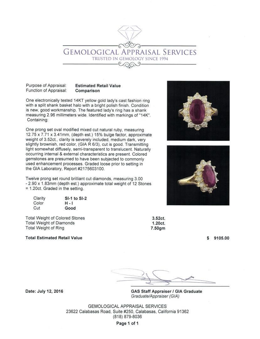 One electronically tested 14KT yellow gold lady's cast fashion ring with a split shank basket halo with a bright polish finish. The featured lady's ring has a shank measuring 2.96 millimeters wide. Identified with markings of '14K'. Condition is new, good workmanship. Containing: One prong set oval modified mixed cut natural ruby, measuring 12.75 x 7.71 x 3.41mm, (depth est.) 15%. bulge factor, approximate weight of 3.52ct., clarity is severely included, medium dark, very slightly brownish, red color, (GIA R 6/3), cut is good. Transmitting light somewhat diffusely, semi-transparent to translucent. Naturally occurring internal & external characteristics are present. Colored gemstones are presumed to have been subjected to commonly used enhancement processes. Graded loose prior to setting in the GIA Laboratory, Report #2175603100. Twelve prong set round brilliant cut diamonds, measuring 3.00 - 2.90 x 1.83mm (depth est.) approximate total weight of 12 Stones = 1.20ct. Graded in the setting. Clarity SI-1 to SI-2. Color: H - I Cut Good. Total Weight of Colored Stones 3.52ct.. Total Weight of Diamonds 1.20ct.. Total Weight of Ring 7.50gm. GAS Appraised at $9,105.00.