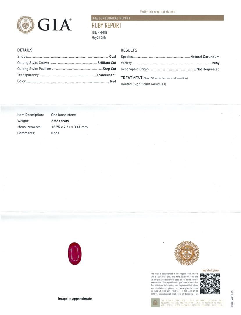 One electronically tested 14KT yellow gold lady's cast fashion ring with a split shank basket halo with a bright polish finish. The featured lady's ring has a shank measuring 2.96 millimeters wide. Identified with markings of '14K'. Condition is new, good workmanship. Containing: One prong set oval modified mixed cut natural ruby, measuring 12.75 x 7.71 x 3.41mm, (depth est.) 15%. bulge factor, approximate weight of 3.52ct., clarity is severely included, medium dark, very slightly brownish, red color, (GIA R 6/3), cut is good. Transmitting light somewhat diffusely, semi-transparent to translucent. Naturally occurring internal & external characteristics are present. Colored gemstones are presumed to have been subjected to commonly used enhancement processes. Graded loose prior to setting in the GIA Laboratory, Report #2175603100. Twelve prong set round brilliant cut diamonds, measuring 3.00 - 2.90 x 1.83mm (depth est.) approximate total weight of 12 Stones = 1.20ct. Graded in the setting. Clarity SI-1 to SI-2. Color: H - I Cut Good. Total Weight of Colored Stones 3.52ct.. Total Weight of Diamonds 1.20ct.. Total Weight of Ring 7.50gm. GAS Appraised at $9,105.00.