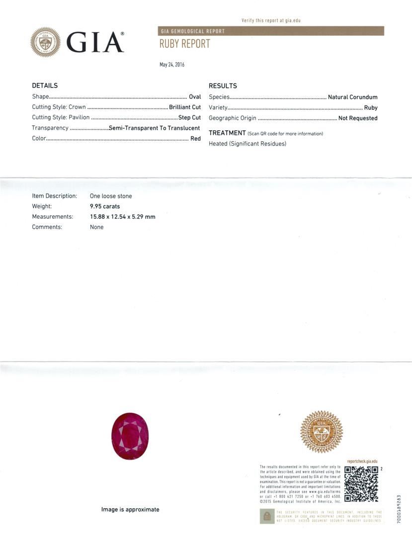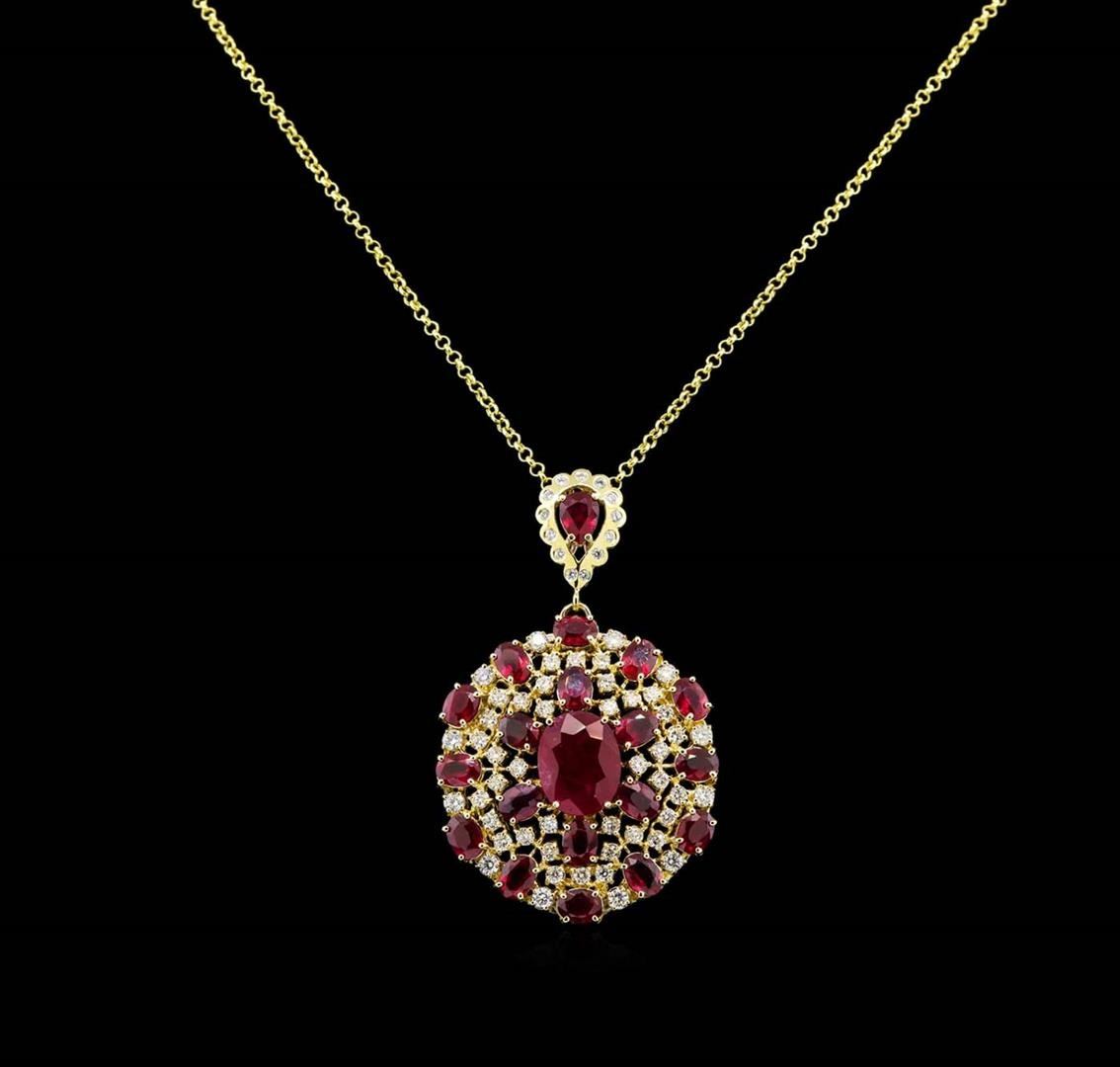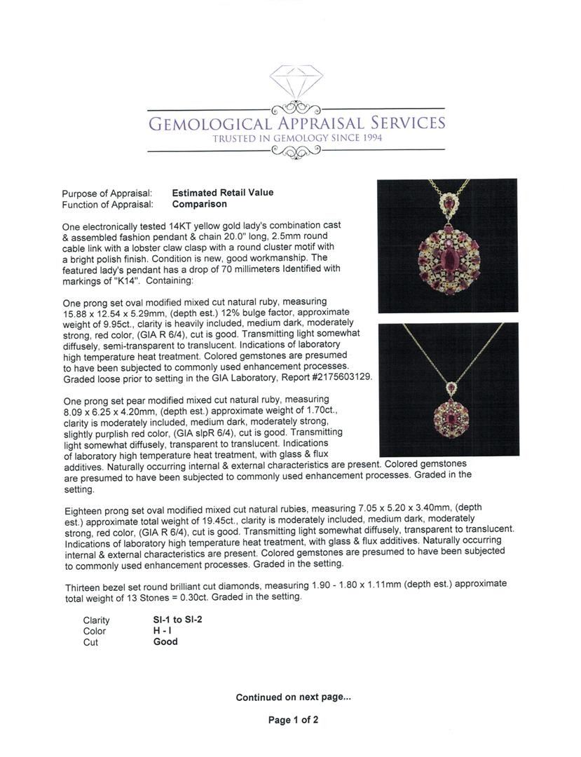 One electronically tested 14KT yellow gold lady's combination cast & assembled fashion pendant & chain 20.0' long, 2.5mm round cable link with a lobster claw clasp with a round cluster motif with a bright polish finish. The featured lady's pendant has a drop of 70 millimeters Identified with markings of 'K14'. Condition is new, good workmanship. Containing: One prong set oval modified mixed cut natural ruby, measuring 15.88 x 12.54 x 5.29mm, (depth est.) 12%. bulge factor, approximate weight of 9.95ct., clarity is heavily included, medium dark, moderately strong, red color, (GIA R 6/4), cut is good. Transmitting light somewhat diffusely, semi-transparent to translucent. Indications of laboratory high temperature heat treatment. Colored gemstones are presumed to have been subjected to commonly used enhancement processes. Graded loose prior to setting in the GIA Laboratory, Report #2175603129. One prong set pear modified mixed cut natural ruby, measuring 8.09 x 6.25 x 4.20mm, (depth est.) approximate weight of 1.70ct., clarity is moderately included, medium dark, moderately strong, slightly purplish red color, (GIA slpR 6/4), cut is good. Transmitting light somewhat diffusely, transparent to translucent. Indications of laboratory high temperature heat treatment, with glass & flux additives. Naturally occurring internal & external characteristics are present. Colored gemstones are presumed to have been subjected to commonly used enhancement processes. Graded in the setting. Eighteen prong set oval modified mixed cut natural rubies, measuring 7.05 x 5.20 x 3.40mm, (depth est.) approximate total weight of 19.45ct., clarity is moderately included, medium dark, moderately strong, red color, (GIA R 6/4), cut is good. Transmitting light somewhat diffusely, transparent to translucent. Indications of laboratory high temperature heat treatment, with glass & flux additives. Naturally occurring internal & external characteristics are present. Colored gemstones are presumed to have been subjected to commonly used enhancement processes. Graded in the setting. Thirteen bezel set round brilliant cut diamonds, measuring 1.90 - 1.80 x 1.11mm (depth est.) approximate total weight of 13 Stones = 0.30ct. Graded in the setting. Clarity SI-1 to SI-2. Color: H - I Cut Good Twelve prong set round brilliant cut diamonds, measuring 3.20 - 3.10 x 1.89mm (depth est.) approximate total weight of 12 Stones = 1.38ct. Graded in the setting. Clarity VS-2 to SI-1. Color: H - I Cut Very Good Thirty-Six prong set round brilliant cut diamonds, measuring 2.60 - 2.50 x 1.56mm (depth est.) approximate total weight of 36 Stones = 2.22ct. Graded in the setting. Clarity SI-1 to SI-2. Color: H - I Cut Good. Total Weight of Colored Stones 31.10ct.. Total Weight of Diamonds 3.90ct.. Total Weight of Pendant & Chain 36.00gm. GAS Appraised at $34,850.00.
