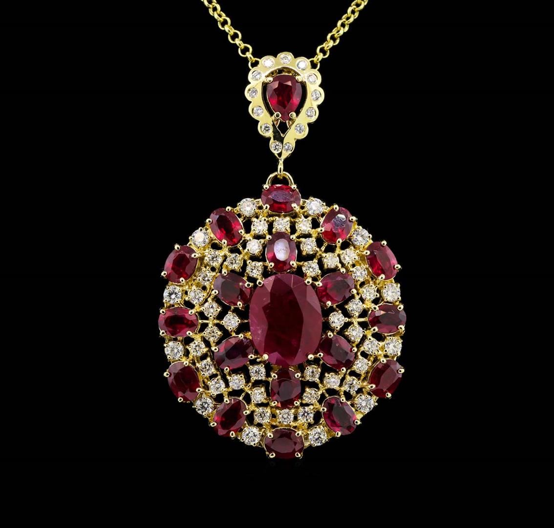 One electronically tested 14KT yellow gold lady's combination cast & assembled fashion pendant & chain 20.0' long, 2.5mm round cable link with a lobster claw clasp with a round cluster motif with a bright polish finish. The featured lady's pendant has a drop of 70 millimeters Identified with markings of 'K14'. Condition is new, good workmanship. Containing: One prong set oval modified mixed cut natural ruby, measuring 15.88 x 12.54 x 5.29mm, (depth est.) 12%. bulge factor, approximate weight of 9.95ct., clarity is heavily included, medium dark, moderately strong, red color, (GIA R 6/4), cut is good. Transmitting light somewhat diffusely, semi-transparent to translucent. Indications of laboratory high temperature heat treatment. Colored gemstones are presumed to have been subjected to commonly used enhancement processes. Graded loose prior to setting in the GIA Laboratory, Report #2175603129. One prong set pear modified mixed cut natural ruby, measuring 8.09 x 6.25 x 4.20mm, (depth est.) approximate weight of 1.70ct., clarity is moderately included, medium dark, moderately strong, slightly purplish red color, (GIA slpR 6/4), cut is good. Transmitting light somewhat diffusely, transparent to translucent. Indications of laboratory high temperature heat treatment, with glass & flux additives. Naturally occurring internal & external characteristics are present. Colored gemstones are presumed to have been subjected to commonly used enhancement processes. Graded in the setting. Eighteen prong set oval modified mixed cut natural rubies, measuring 7.05 x 5.20 x 3.40mm, (depth est.) approximate total weight of 19.45ct., clarity is moderately included, medium dark, moderately strong, red color, (GIA R 6/4), cut is good. Transmitting light somewhat diffusely, transparent to translucent. Indications of laboratory high temperature heat treatment, with glass & flux additives. Naturally occurring internal & external characteristics are present. Colored gemstones are presumed to have been subjected to commonly used enhancement processes. Graded in the setting. Thirteen bezel set round brilliant cut diamonds, measuring 1.90 - 1.80 x 1.11mm (depth est.) approximate total weight of 13 Stones = 0.30ct. Graded in the setting. Clarity SI-1 to SI-2. Color: H - I Cut Good Twelve prong set round brilliant cut diamonds, measuring 3.20 - 3.10 x 1.89mm (depth est.) approximate total weight of 12 Stones = 1.38ct. Graded in the setting. Clarity VS-2 to SI-1. Color: H - I Cut Very Good Thirty-Six prong set round brilliant cut diamonds, measuring 2.60 - 2.50 x 1.56mm (depth est.) approximate total weight of 36 Stones = 2.22ct. Graded in the setting. Clarity SI-1 to SI-2. Color: H - I Cut Good. Total Weight of Colored Stones 31.10ct.. Total Weight of Diamonds 3.90ct.. Total Weight of Pendant & Chain 36.00gm. GAS Appraised at $34,850.00.