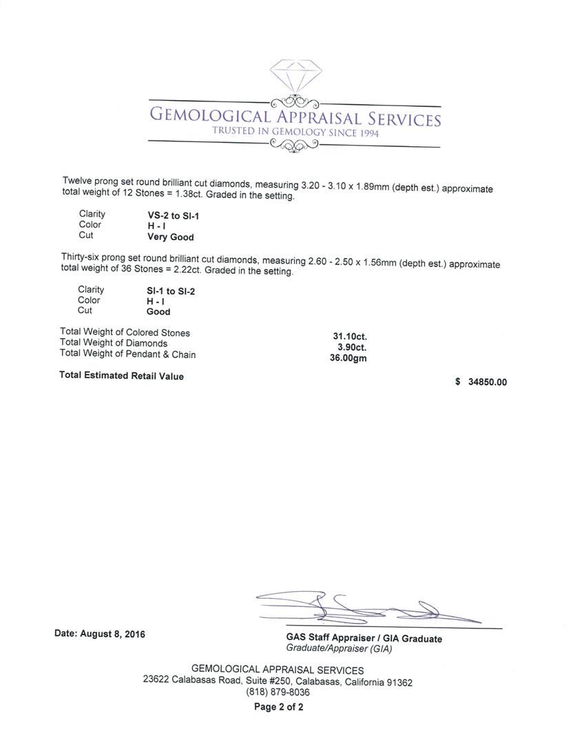 One electronically tested 14KT yellow gold lady's combination cast & assembled fashion pendant & chain 20.0' long, 2.5mm round cable link with a lobster claw clasp with a round cluster motif with a bright polish finish. The featured lady's pendant has a drop of 70 millimeters Identified with markings of 'K14'. Condition is new, good workmanship. Containing: One prong set oval modified mixed cut natural ruby, measuring 15.88 x 12.54 x 5.29mm, (depth est.) 12%. bulge factor, approximate weight of 9.95ct., clarity is heavily included, medium dark, moderately strong, red color, (GIA R 6/4), cut is good. Transmitting light somewhat diffusely, semi-transparent to translucent. Indications of laboratory high temperature heat treatment. Colored gemstones are presumed to have been subjected to commonly used enhancement processes. Graded loose prior to setting in the GIA Laboratory, Report #2175603129. One prong set pear modified mixed cut natural ruby, measuring 8.09 x 6.25 x 4.20mm, (depth est.) approximate weight of 1.70ct., clarity is moderately included, medium dark, moderately strong, slightly purplish red color, (GIA slpR 6/4), cut is good. Transmitting light somewhat diffusely, transparent to translucent. Indications of laboratory high temperature heat treatment, with glass & flux additives. Naturally occurring internal & external characteristics are present. Colored gemstones are presumed to have been subjected to commonly used enhancement processes. Graded in the setting. Eighteen prong set oval modified mixed cut natural rubies, measuring 7.05 x 5.20 x 3.40mm, (depth est.) approximate total weight of 19.45ct., clarity is moderately included, medium dark, moderately strong, red color, (GIA R 6/4), cut is good. Transmitting light somewhat diffusely, transparent to translucent. Indications of laboratory high temperature heat treatment, with glass & flux additives. Naturally occurring internal & external characteristics are present. Colored gemstones are presumed to have been subjected to commonly used enhancement processes. Graded in the setting. Thirteen bezel set round brilliant cut diamonds, measuring 1.90 - 1.80 x 1.11mm (depth est.) approximate total weight of 13 Stones = 0.30ct. Graded in the setting. Clarity SI-1 to SI-2. Color: H - I Cut Good Twelve prong set round brilliant cut diamonds, measuring 3.20 - 3.10 x 1.89mm (depth est.) approximate total weight of 12 Stones = 1.38ct. Graded in the setting. Clarity VS-2 to SI-1. Color: H - I Cut Very Good Thirty-Six prong set round brilliant cut diamonds, measuring 2.60 - 2.50 x 1.56mm (depth est.) approximate total weight of 36 Stones = 2.22ct. Graded in the setting. Clarity SI-1 to SI-2. Color: H - I Cut Good. Total Weight of Colored Stones 31.10ct.. Total Weight of Diamonds 3.90ct.. Total Weight of Pendant & Chain 36.00gm. GAS Appraised at $34,850.00.