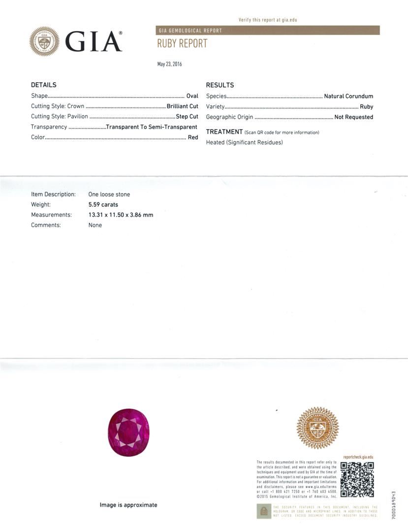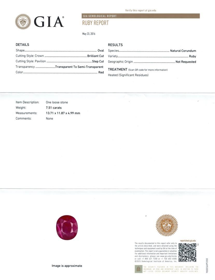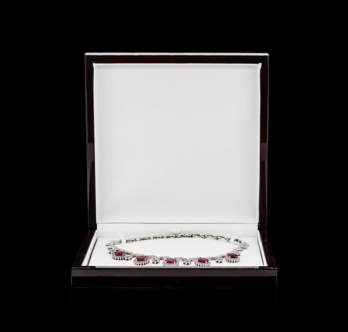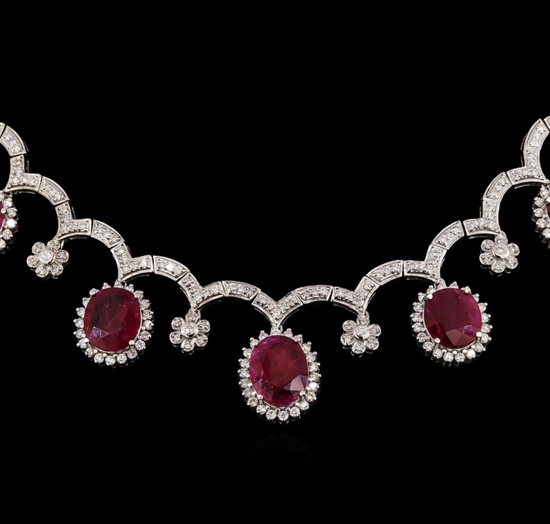 One electronically tested 18KT white gold lady's combination cast & assembled fashion necklace with a tongue clasp with fold over safety with a bright polish finish. The featured lady's necklace measures 17.5 inches in length. Identified with markings of '18K'. Condition is new, good workmanship. Containing: One prong set oval modified mixed cut natural ruby, measuring 13.71 x 11.89 x 4.99mm, (depth est.) 8%. bulge factor, approximate weight of 7.51ct., clarity is heavily included, medium, moderately strong, red color, (GIA R 5/4), cut is very good. Transmitting light somewhat diffusely, semi-transparent to translucent. Naturally occurring internal & external characteristics are present. Indications of laboratory high temperature heat treatment. Colored gemstones are presumed to have been subjected to commonly used enhancement processes. Graded loose prior to setting in the GIA Laboratory, Report #6177603397. One prong set oval modified mixed cut natural ruby, measuring 14.11 x 11.72 x 4.29mm, (depth est.) 10%. bulge factor, approximate weight of 6.66ct., clarity is heavily included, medium dark, moderately strong, strongly purplish red color, (GIA stpR 6/4), cut is very good. Transmitting light somewhat diffusely, semi-transparent to translucent. Naturally occurring internal & external characteristics are present. Indications of laboratory high temperature heat treatment. Colored gemstones are presumed to have been subjected to commonly used enhancement processes. Graded loose prior to setting in the GIA Laboratory, Report #5171603543. One prong set oval modified mixed cut natural ruby, measuring 15.54 x 12.02 x 2.91mm, (depth est.) 15%. bulge factor, approximate weight of 6.01ct., clarity is heavily included, medium dark, moderately strong, red color, (GIA R 6/4), cut is very good. Transmitting light somewhat diffusely, semi-transparent to translucent. Naturally occurring internal & external characteristics are present. Indications of laboratory high temperature heat treatment. Colored gemstones are presumed to have been subjected to commonly used enhancement processes. Graded loose prior to setting in the GIA Laboratory, Report #5171603536. One prong set oval modified mixed cut natural ruby, measuring 12.71 x 10.65 x 4.47mm, (depth est.) 10%. bulge factor, approximate weight of 5.62ct., clarity is heavily included, medium dark, moderately strong, strongly purplish red color, (GIA stpR 6/4), cut is very good. Transmitting light somewhat diffusely, semi-transparent to translucent. Naturally occurring internal & external characteristics are present. Indications of laboratory high temperature heat treatment. Colored gemstones are presumed to have been subjected to commonly used enhancement processes. Graded loose prior to setting in the GIA Laboratory, Report #2173603106. One prong set oval modified mixed cut natural ruby, measuring 13.31 x 11.50 x 3.86mm, (depth est.) 12%. bulge factor, approximate weight of 5.59ct., clarity is heavily included, medium dark, moderately strong, red color, (GIA R 6/4), cut is very good. Transmitting light somewhat diffusely, semi-transparent to translucent. Naturally occurring internal & external characteristics are present. Indications of laboratory high temperature heat treatment. Colored gemstones are presumed to have been subjected to commonly used enhancement processes. Graded loose prior to setting in the GIA Laboratory, Report #6173603394. Six bezel set round brilliant cut diamonds, measuring 2.50 - 2.40 x 1.52mm (depth est.) approximate total weight of 6 Stones = 0.34ct. Graded in the setting. Clarity VS-1 to VS-2. Color: G - H Cut Very Good Three Hundred Fourteen prong set round brilliant cut diamonds, measuring 1.90 - 1.70 x 1.12mm (depth est.) approximate total weight of 314 Stones = 7.24ct. Graded in the setting. Clarity VS-2 to SI-2. Color: G - I Cut Very Good Thirty-Six prong set round brilliant cut diamonds, measuring 1.50 - 1.40 x 0.90mm (depth est.) approximate total weight of 36 Stones = 0.42ct. Graded in the setting. Clarity VS-2 to SI-1. Color: G - H Cut Good. Total Weight of Colored Stones 31.39ct.. Total Weight of Diamonds 8.00ct.. Total Weight of Necklace 77.00gm. GAS Appraised at $85,965.00.