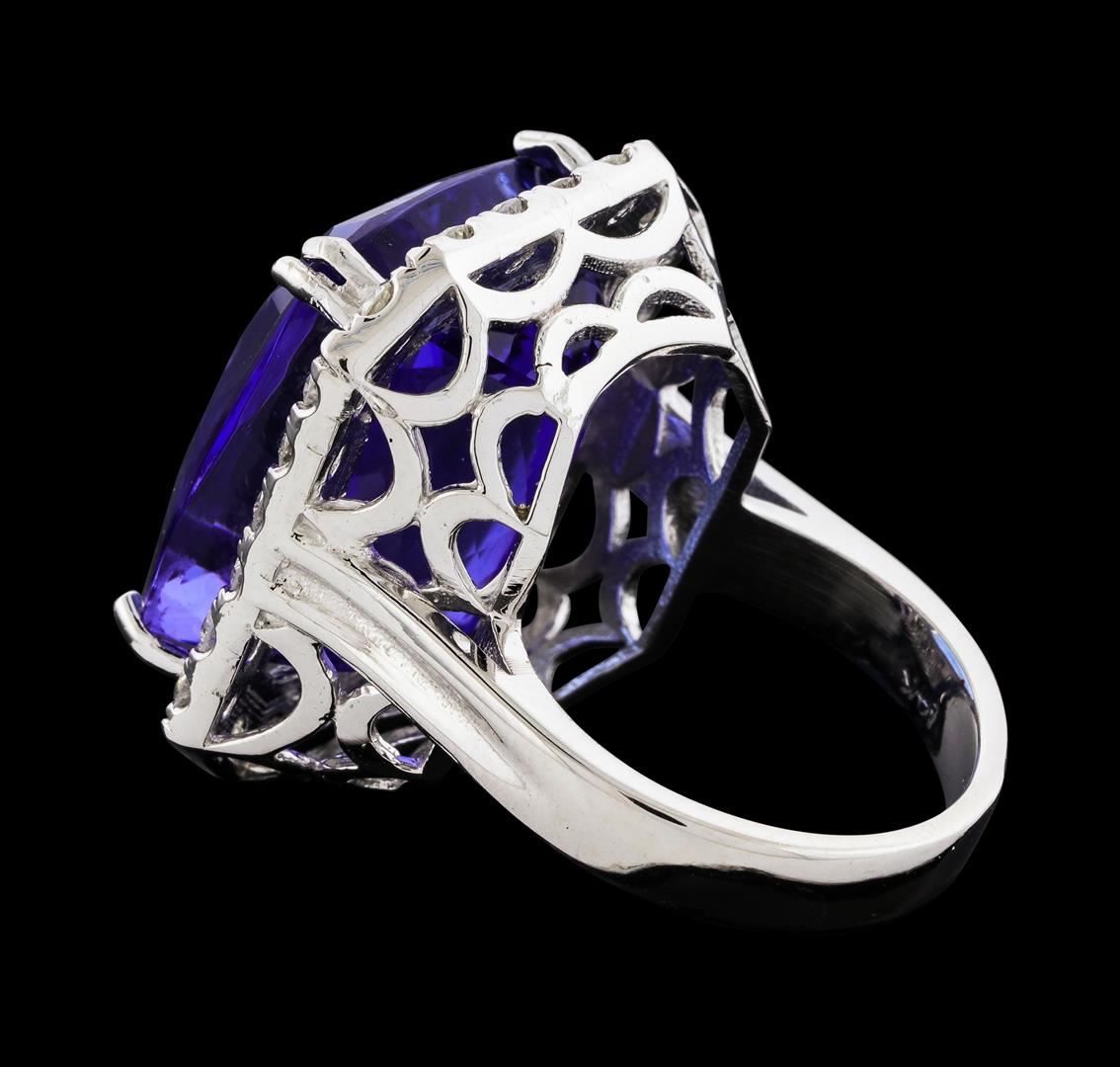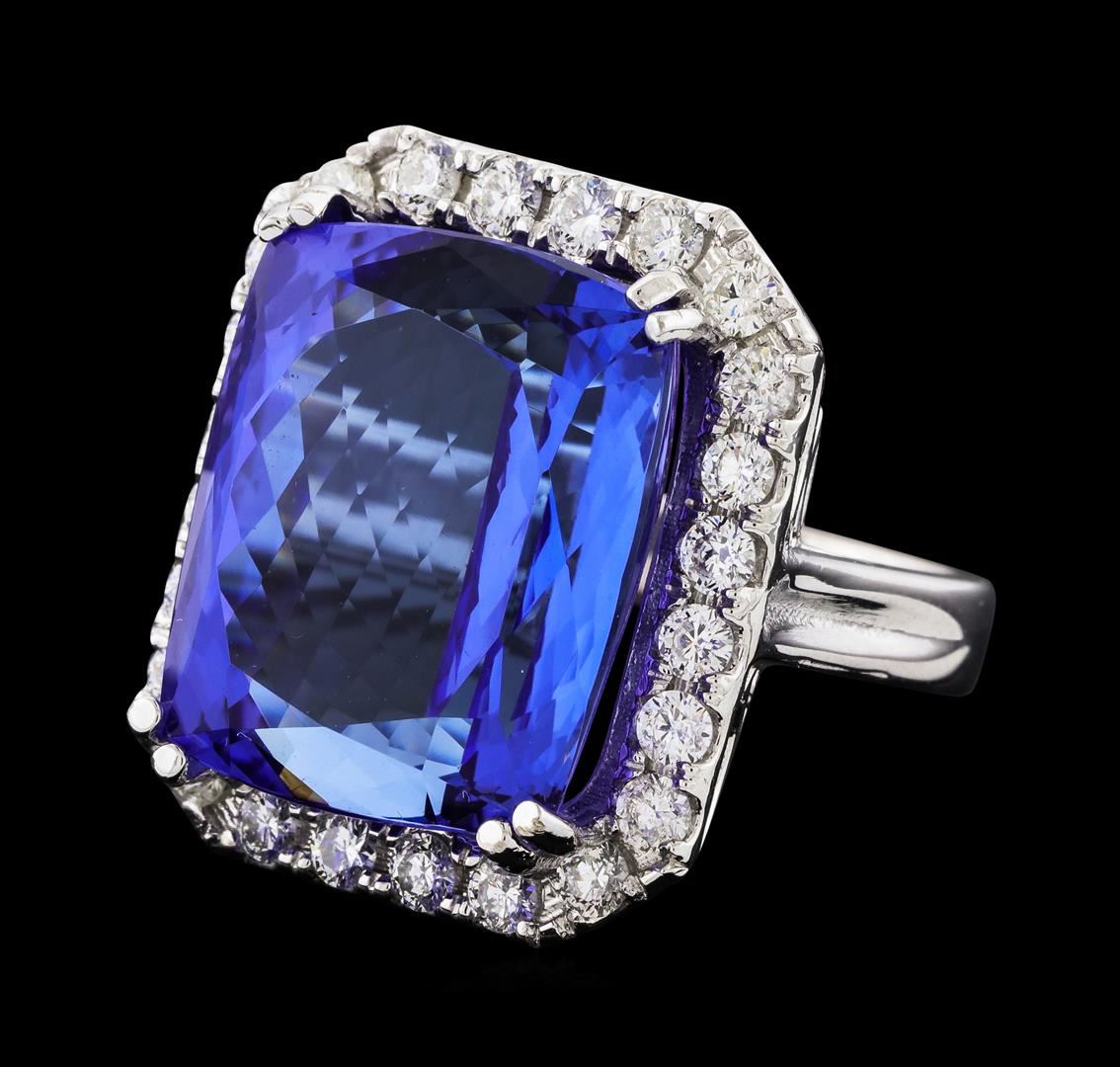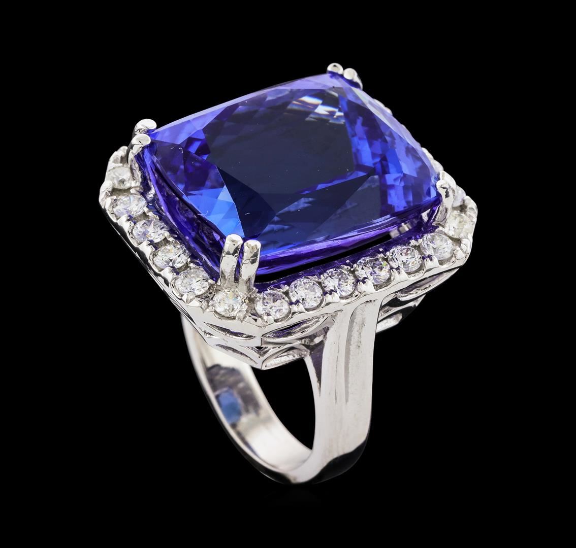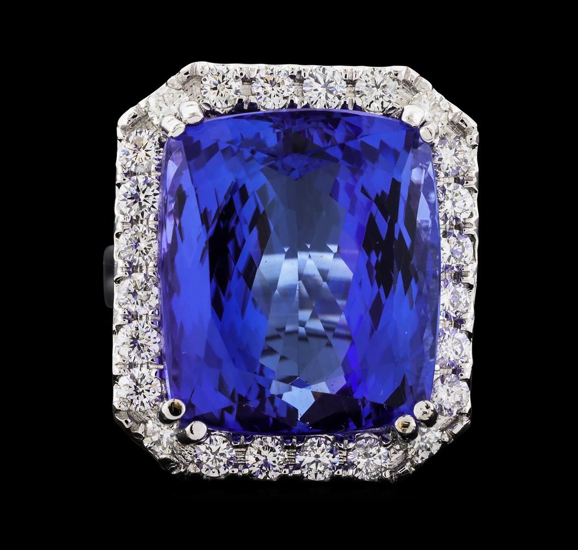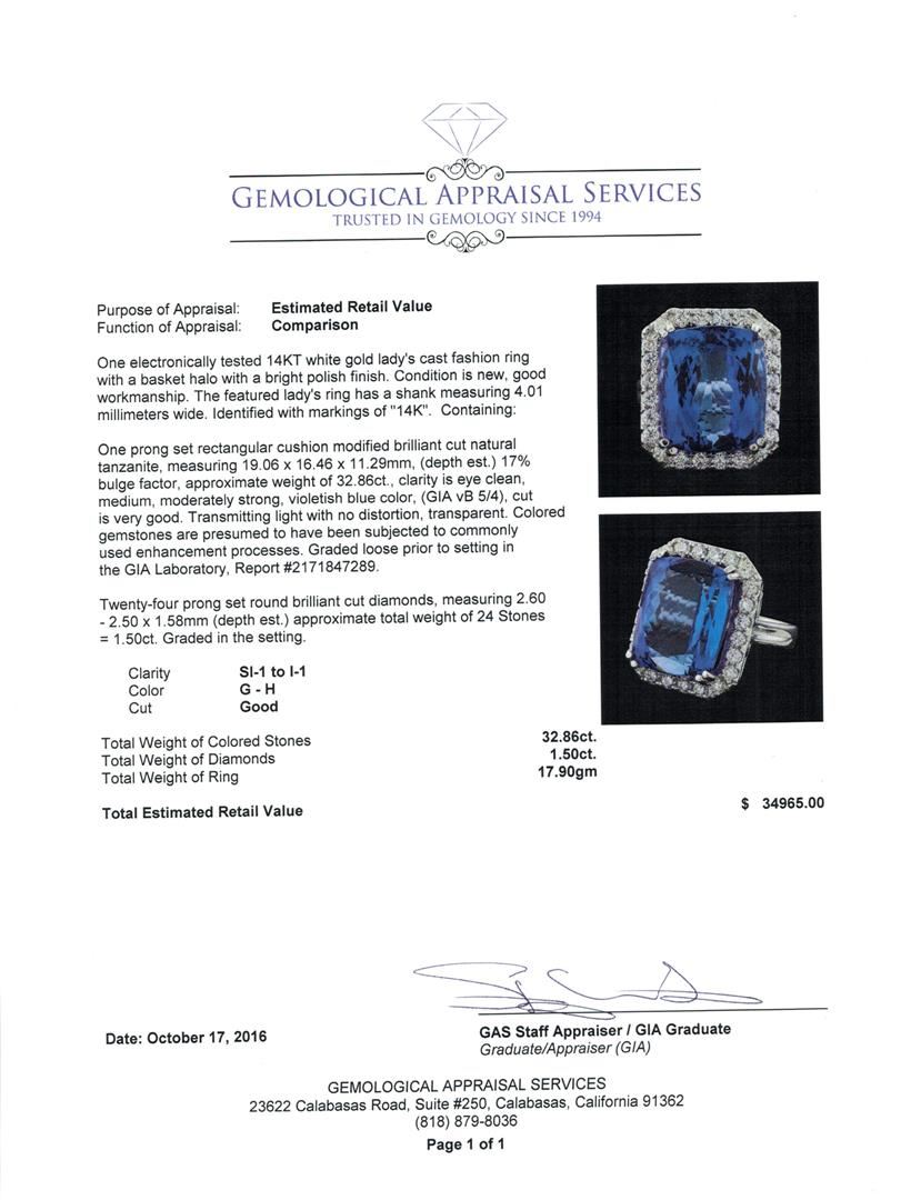One electronically tested 14KT white gold lady's cast fashion ring with a basket halo with a bright polish finish. The featured lady's ring has a shank measuring 4.01 millimeters wide. Identified with markings of '14K'. Condition is new, good workmanship. Containing: One prong set rectangular cushion modified brilliant cut natural tanzanite, measuring 19.06 x 16.46 x 11.29mm, (depth est.) 17%. bulge factor, approximate weight of 32.86ct., clarity is eye clean, medium, moderately strong, violetish blue color, (GIA vB 5/4), cut is very good. Transmitting light with no distortion, transparent. Colored gemstones are presumed to have been subjected to commonly used enhancement processes. Graded loose prior to setting in the GIA Laboratory, Report #2171847289. Twenty-Four prong set round brilliant cut diamonds, measuring 2.60 - 2.50 x 1.58mm (depth est.) approximate total weight of 24 Stones = 1.50ct. Graded in the setting. Clarity SI-1 to I-1. Color: G - H Cut Good. Total Weight of Colored Stones 32.86ct.. Total Weight of Diamonds 1.50ct.. Total Weight of Ring 17.90gm. GAS Appraised at $34,965.00.