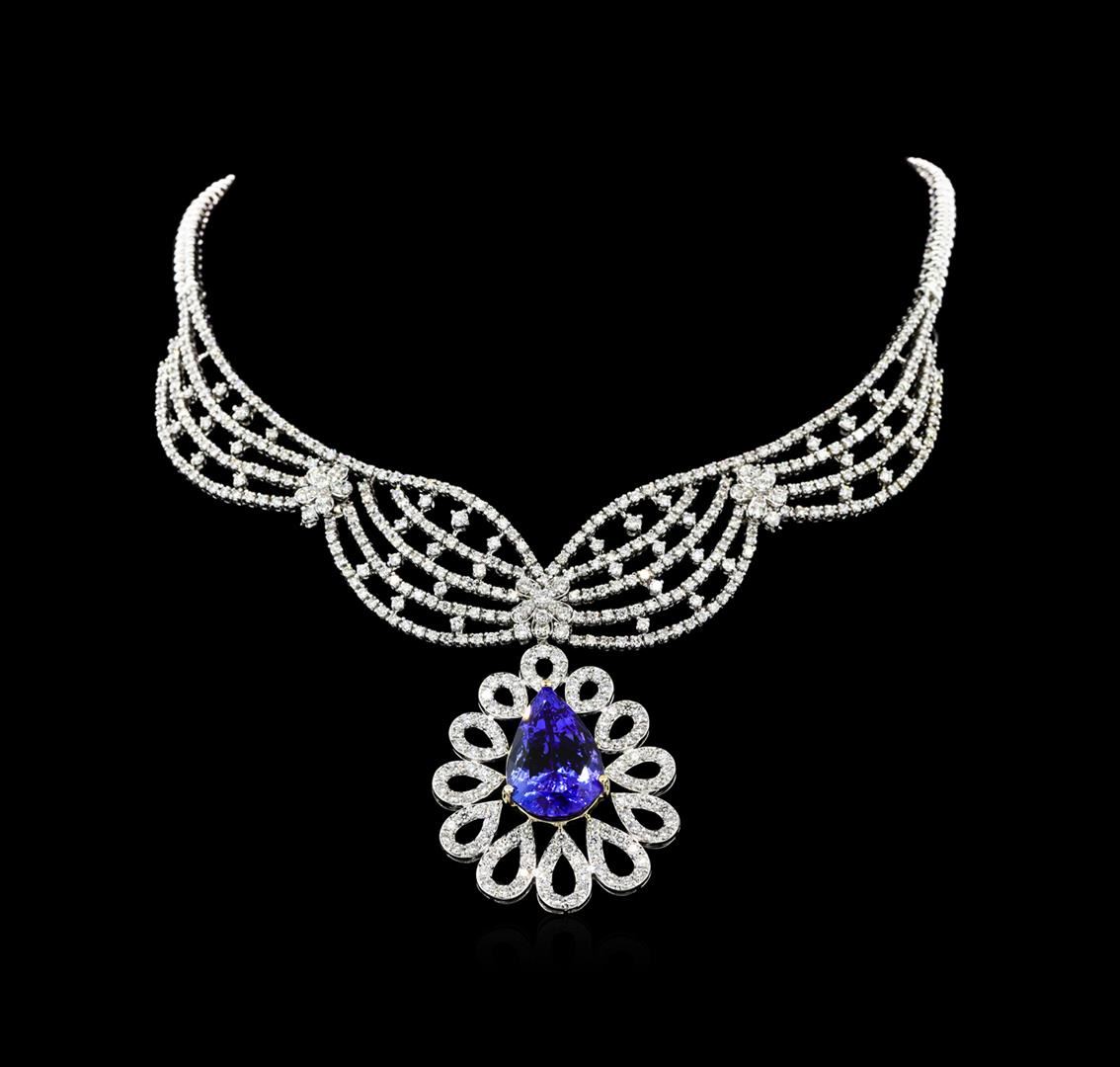 One 14KT white and yellow gold lady's combination cast & assembled tanzanite and diamond suite. The suite features a pair of earrings and a necklace. The sixteen inch necklace features a center tanzanite surrounded by multiple pear shaped halo motifs, supported by five diamond encrusted ribbons and terminating in a tongue clasp with a foldover safety. The suite also contains a matching pair of tanzanite and diamond dangle earrings with hinged backs with snap locking posts. The suite is finished with a bright polish. Condition is new, good workmanship. Containing: One prong set pear modified brilliant cut natural tanzanite, measuring 22.35 x 15.11 x 12.17mm, (depth est.) approximate weight of 26.31ct., clarity is eye clean, medium dark, strong, violetish blue color, (GIA vB 6/5), cut is excellent. Transmitting light with no distortion, transparent. Colored gemstones are presumed to have been subjected to commonly used enhancement processes. Graded loose prior to setting in the GIA Laboratory, Report #5171668593. Two prong set pear modified brilliant cut natural tanzanites, measuring 11.80 x 8.70 x 5.80mm, (depth est.) 2%. bulge factor, approximate total weight of 8.15ct., clarity is eye clean, medium dark, moderately strong, violetish blue color, (GIA vB 6/4), cut is very good. Transmitting light with no distortion, transparent. Colored gemstones are presumed to have been subjected to commonly used enhancement processes. Graded in the setting. One Hundred Seventy-Three prong set round brilliant cut diamonds, measuring 2.40 - 2.10 x 1.37mm (depth est.) approximate total weight of 173 Stones = 7.36ct. Graded in the setting. Clarity VS-2 to SI-2. Color: G - I Cut Good Three Hundred Forty-Three prong set round brilliant cut diamonds, measuring 1.70 - 1.50 x 0.99mm (depth est.) approximate total weight of 343 Stones = 5.30ct. Graded in the setting. Clarity VS-2 to SI-2. Color: G - I Cut Good Two Hundred Twenty-Four prong set round brilliant cut diamonds, measuring 1.40 - 1.30 x 0.81mm (depth est.) approximate total weight of 224 Stones = 1.99ct. Graded in the setting. Clarity VS-2 to SI-2. Color: G - I Cut Good. Total Weight of Colored Stones 34.46ct.. Total Weight of Diamonds 14.65ct.. Total Weight of Suite 81.60gm GAS Appraised at $98,610.00.