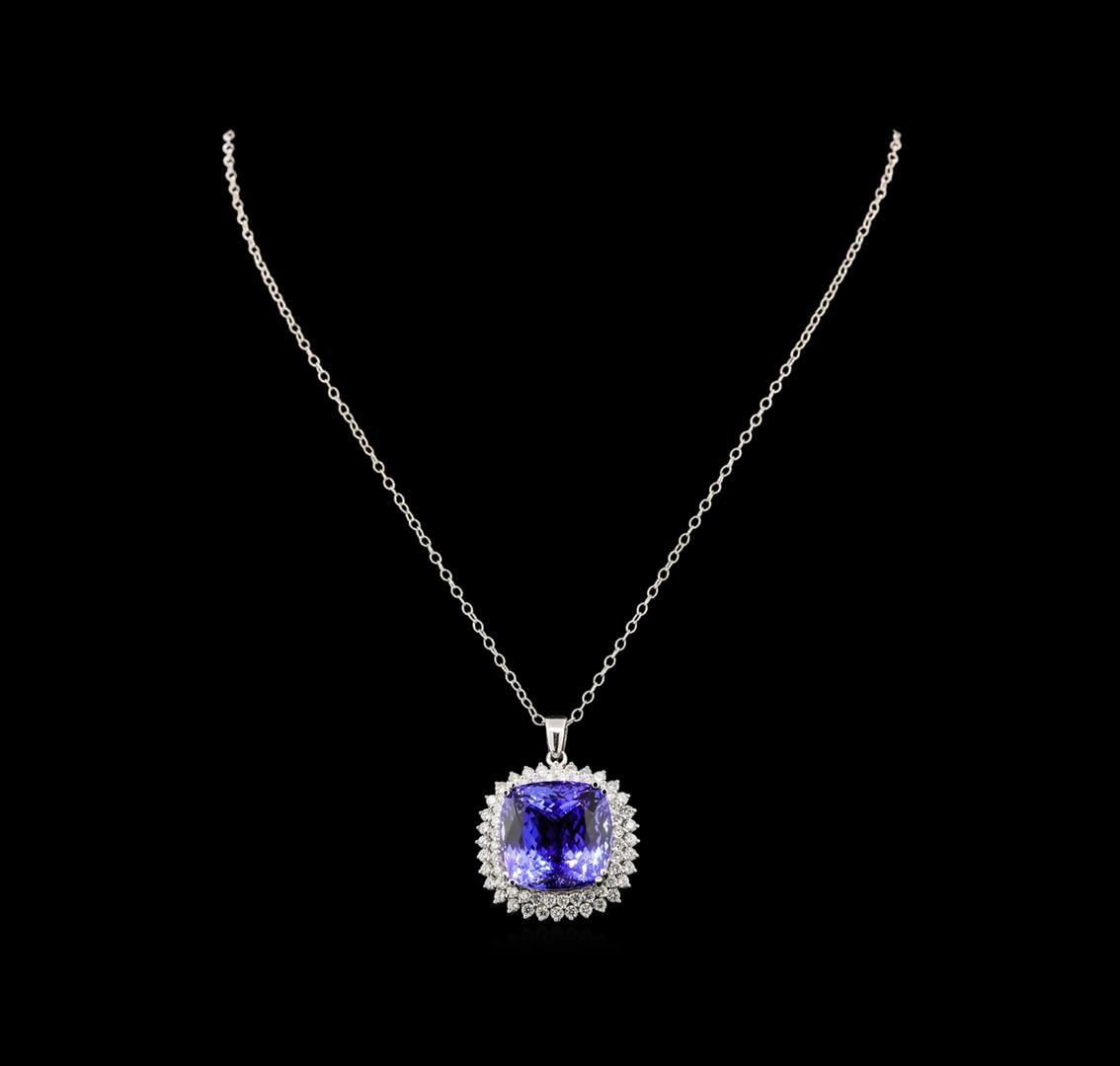 One electronically tested 14KT white gold lady's cast fashion pendant & chain 18.0' long, 2mm twisted oval cable link with a lobster claw clasp with a double basket halo with a bright polish finish. Identified with markings of 'K14'. Condition is new, good workmanship. Containing: One prong set square cushion modified brilliant cut natural tanzanite, measuring 18.63 x 18.53 x 12.52mm, (depth est.) 4%. bulge factor, approximate weight of 35.28ct., clarity is eye clean, medium dark, moderately strong, violetish blue color, (GIA vB 6/4), cut is excellent. Transmitting light with no distortion, transparent. Colored gemstones are presumed to have been subjected to commonly used enhancement processes. Graded loose prior to setting in the GIA Laboratory, Report #5171668651. Thirty-Two prong set round brilliant cut diamonds, measuring 2.20 - 2.15 x 1.35mm (depth est.) approximate total weight of 32 Stones = 1.28ct. Graded in the setting. Clarity SI-1 to I-1. Color: H - I Cut Good Thirty-Two prong set round brilliant cut diamonds, measuring 2.10 - 2.00 x 1.27mm (depth est.) approximate total weight of 32 Stones = 1.04ct. Graded in the setting. Clarity SI-1 to I-1. Color: H - I Cut Good. Total Weight of Colored Stones 35.28ct.. Total Weight of Diamonds 2.32ct.. Total Weight of Pendant & Chain 20.50gm. GAS Appraised at $53,950.00.