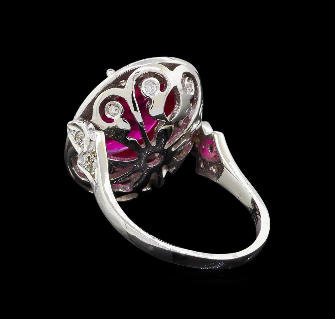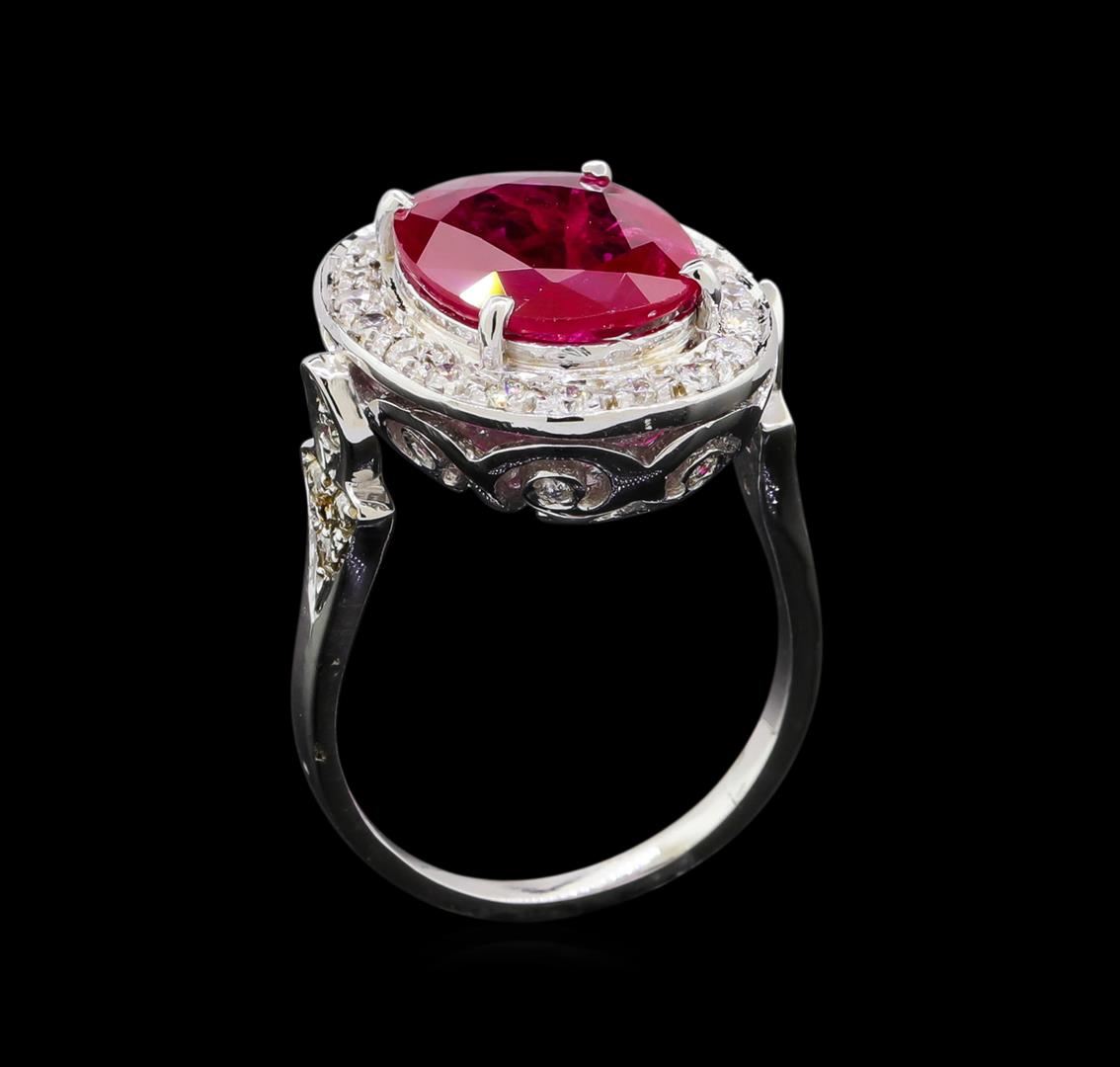 One electronically tested 14KT white gold lady's cast fashion ring with a halo with a bright polish finish. The featured lady's ring has a shank measuring 1.67 millimeters wide. Condition is new, good workmanship. Containing: One prong set oval modified mixed cut natural ruby, measuring 13.12 x 10.01 x 2.75mm, (depth est.) 15%. bulge factor, approximate weight of 4.07ct., clarity is heavily included, medium dark, very slightly brownish, strongly purplish red color, (GIA stpR 6/3), cut is very good. Transmitting light somewhat diffusely, transparent to translucent. Naturally occurring internal & external characteristics are present. Colored gemstones are presumed to have been subjected to commonly used enhancement processes. Graded loose prior to setting in the GIA Laboratory, Report #1176603107. Twenty-Eight prong set round brilliant cut diamonds, measuring 1.70 - 1.65 x 1.04mm (depth est.) approximate total weight of 28 Stones = 0.50ct. Graded in the setting. Clarity SI-1 to SI-2. Color: H - I Cut Good Eight bead set round brilliant cut diamonds, measuring 1.30 - 1.20 x 0.78mm (depth est.) approximate total weight of 8 Stones = 0.06ct. Graded in the setting. Clarity VS-2 to SI-2. Color: H - I Cut Good. Total Weight of Colored Stones 4.07ct.. Total Weight of Diamonds 0.56ct.. Total Weight of Ring 6.70gm. GAS Appraised at $10,505.00.