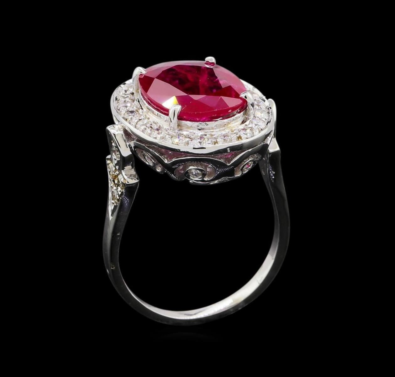 One electronically tested 14KT white gold lady's cast fashion ring with a halo with a bright polish finish. The featured lady's ring has a shank measuring 1.67 millimeters wide. Condition is new, good workmanship. Containing: One prong set oval modified mixed cut natural ruby, measuring 13.12 x 10.01 x 2.75mm, (depth est.) 15%. bulge factor, approximate weight of 4.07ct., clarity is heavily included, medium dark, very slightly brownish, strongly purplish red color, (GIA stpR 6/3), cut is very good. Transmitting light somewhat diffusely, transparent to translucent. Naturally occurring internal & external characteristics are present. Colored gemstones are presumed to have been subjected to commonly used enhancement processes. Graded loose prior to setting in the GIA Laboratory, Report #1176603107. Twenty-Eight prong set round brilliant cut diamonds, measuring 1.70 - 1.65 x 1.04mm (depth est.) approximate total weight of 28 Stones = 0.50ct. Graded in the setting. Clarity SI-1 to SI-2. Color: H - I Cut Good Eight bead set round brilliant cut diamonds, measuring 1.30 - 1.20 x 0.78mm (depth est.) approximate total weight of 8 Stones = 0.06ct. Graded in the setting. Clarity VS-2 to SI-2. Color: H - I Cut Good. Total Weight of Colored Stones 4.07ct.. Total Weight of Diamonds 0.56ct.. Total Weight of Ring 6.70gm. GAS Appraised.