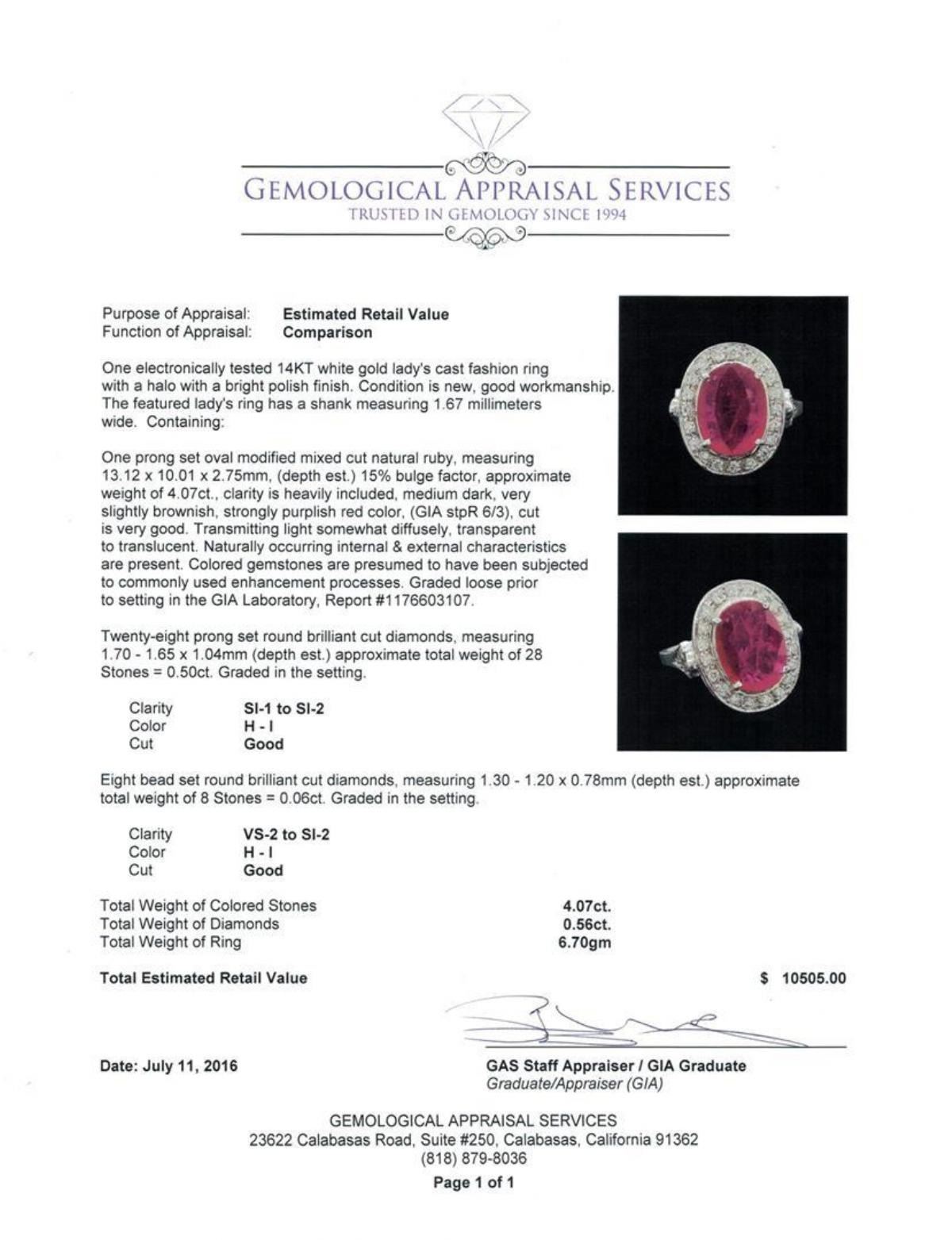 One electronically tested 14KT white gold lady's cast fashion ring with a halo with a bright polish finish. The featured lady's ring has a shank measuring 1.67 millimeters wide. Condition is new, good workmanship. Containing: One prong set oval modified mixed cut natural ruby, measuring 13.12 x 10.01 x 2.75mm, (depth est.) 15%. bulge factor, approximate weight of 4.07ct., clarity is heavily included, medium dark, very slightly brownish, strongly purplish red color, (GIA stpR 6/3), cut is very good. Transmitting light somewhat diffusely, transparent to translucent. Naturally occurring internal & external characteristics are present. Colored gemstones are presumed to have been subjected to commonly used enhancement processes. Graded loose prior to setting in the GIA Laboratory, Report #1176603107. Twenty-Eight prong set round brilliant cut diamonds, measuring 1.70 - 1.65 x 1.04mm (depth est.) approximate total weight of 28 Stones = 0.50ct. Graded in the setting. Clarity SI-1 to SI-2. Color: H - I Cut Good Eight bead set round brilliant cut diamonds, measuring 1.30 - 1.20 x 0.78mm (depth est.) approximate total weight of 8 Stones = 0.06ct. Graded in the setting. Clarity VS-2 to SI-2. Color: H - I Cut Good. Total Weight of Colored Stones 4.07ct.. Total Weight of Diamonds 0.56ct.. Total Weight of Ring 6.70gm. GAS Appraised.