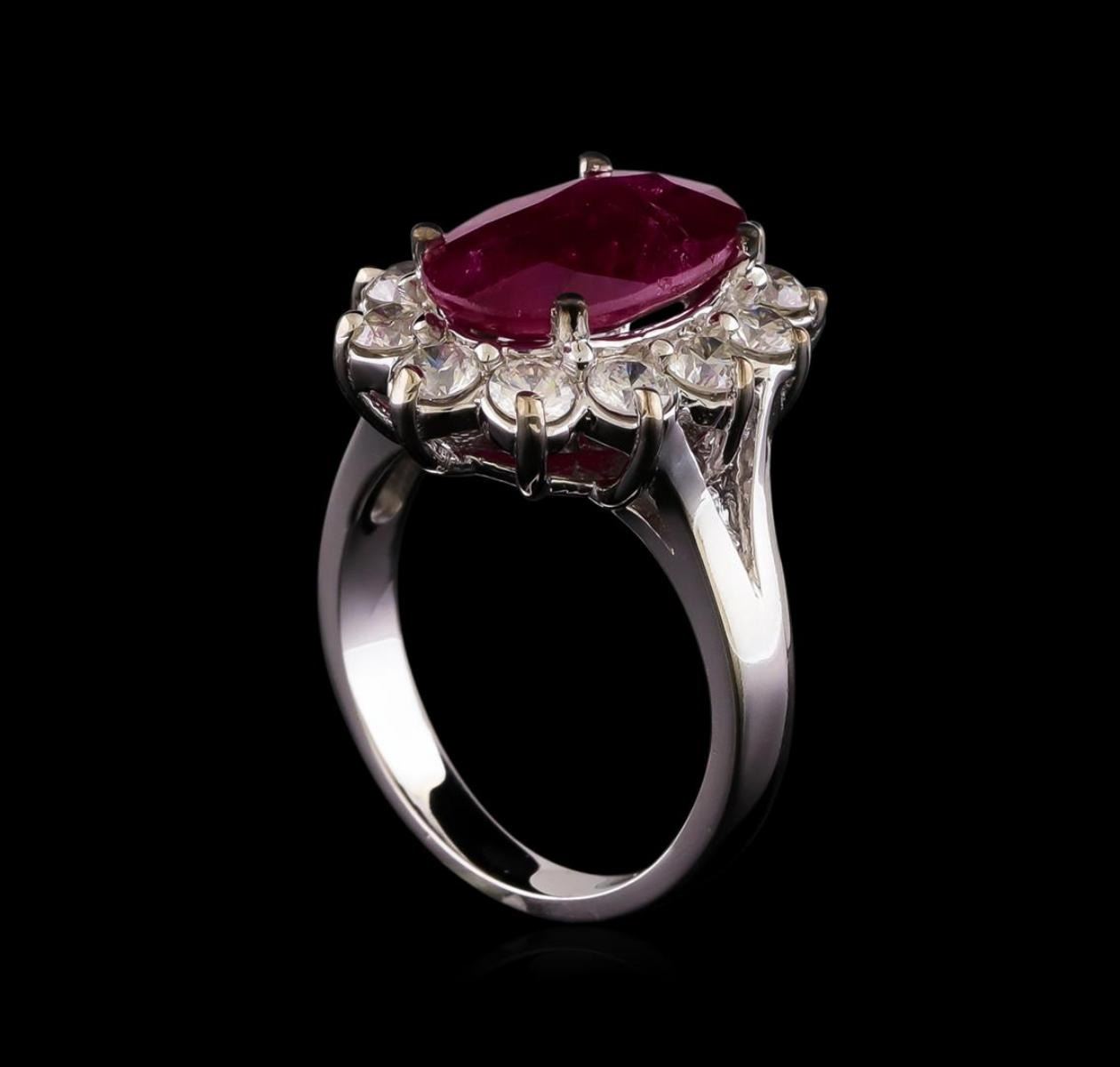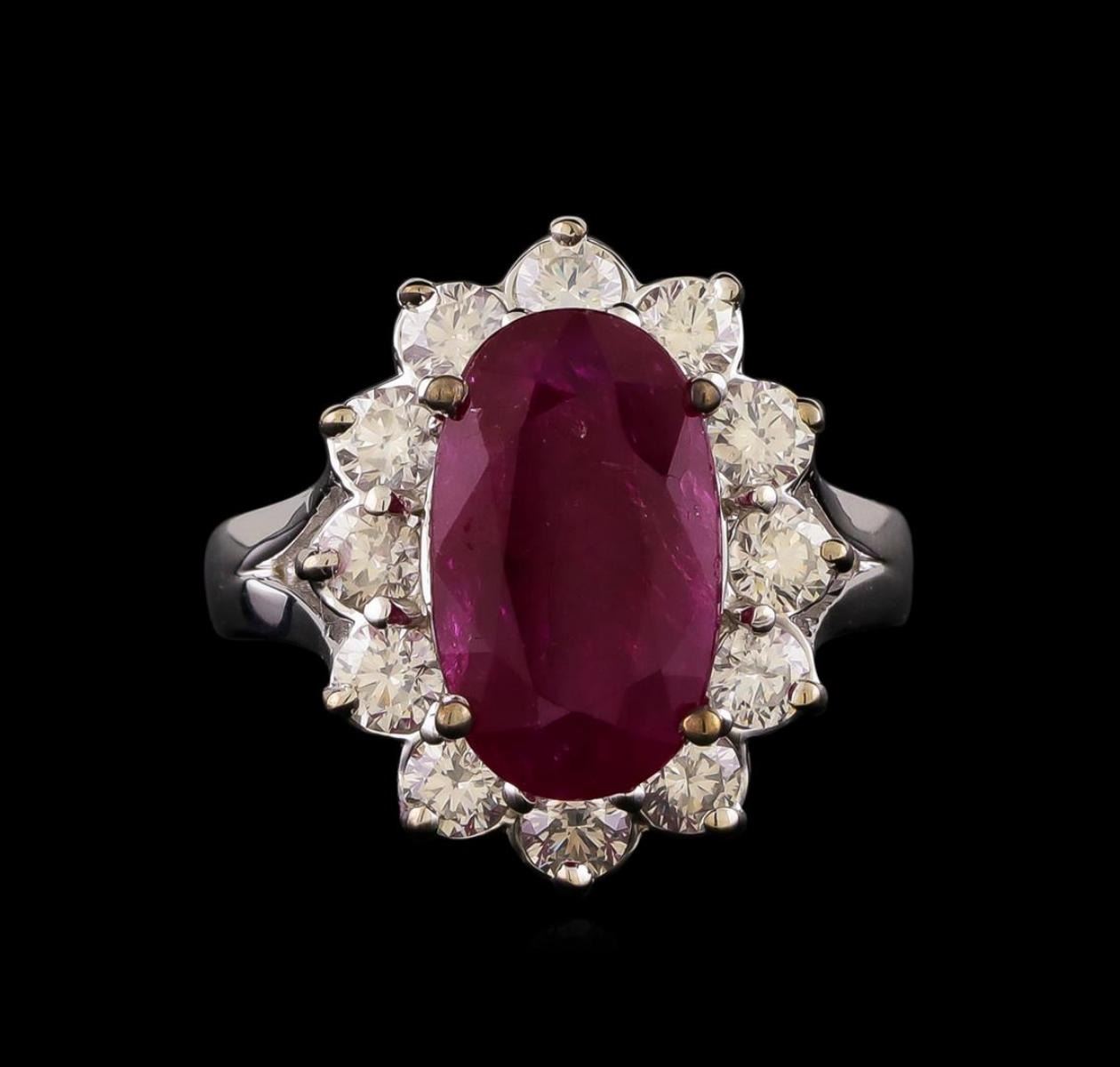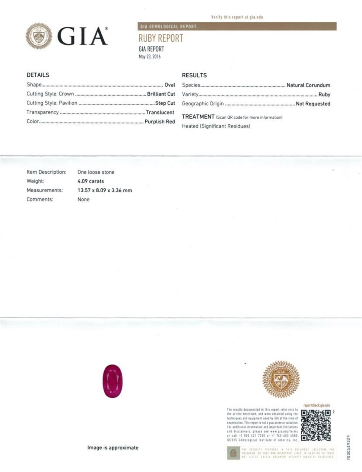 One electronically tested 14KT white gold lady's cast fashion ring with a basket halo with a bright polish finish. The featured lady's ring has a shank measuring 2.90 millimeters wide. Identified with markings of '14K'. Condition is new, good workmanship. Containing: One prong set oval modified mixed cut natural ruby, measuring 13.57 x 8.09 x 3.36mm, (depth est.) 15%. bulge factor, approximate weight of 4.09ct., clarity is severely included, medium dark, very slightly brownish, strongly purplish red color, (GIA stpR 6/3), cut is good. Transmitting light somewhat diffusely, semi-transparent to translucent. Naturally occurring internal & external characteristics are present. Colored gemstones are presumed to have been subjected to commonly used enhancement processes. Graded loose prior to setting in the GIA Laboratory, Report #5171603111. Twelve prong set round brilliant cut diamonds, measuring 3.10 - 3.00 x 1.89mm (depth est.) approximate total weight of 12 Stones = 1.30 ct. Graded in the setting. Clarity VS-2 to SI-1. Color: H - I Cut Good. Total Weight of Colored Stones 4.09ct.. Total Weight of Diamonds 1.30 ct.. Total Weight of Ring 7.70gm. GAS Appraised.