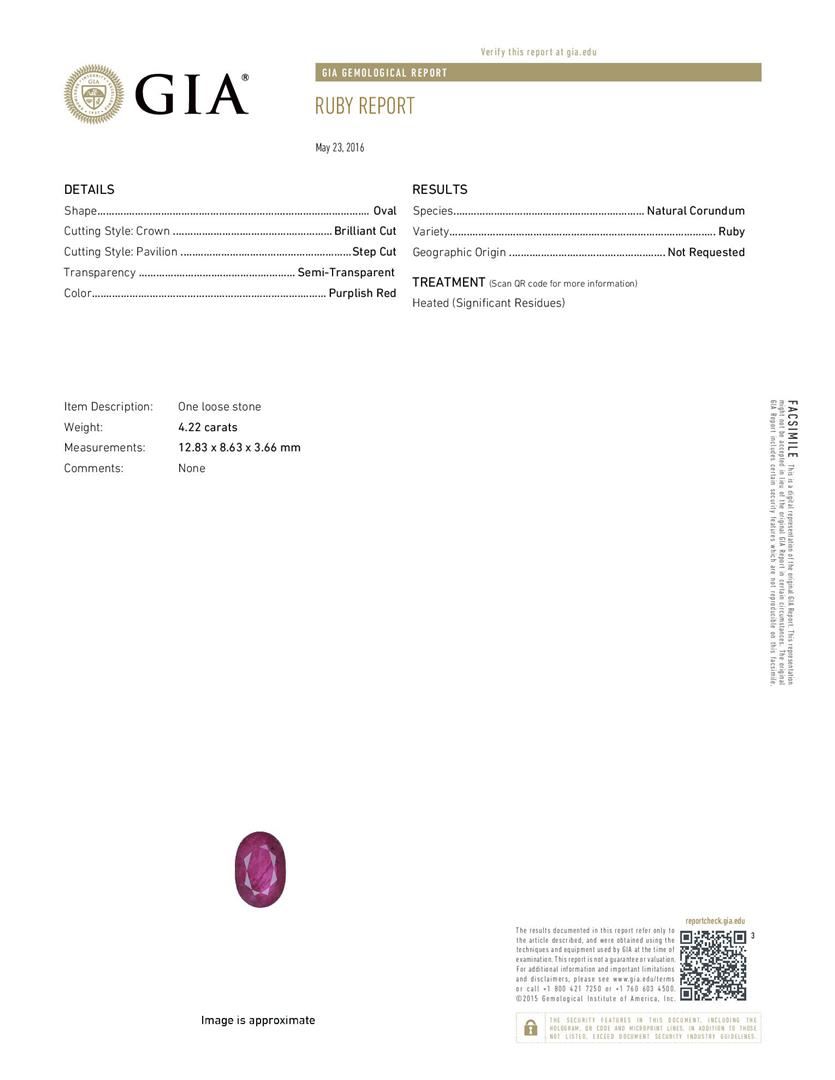 One electronically tested 14KT white gold lady's cast fashion ring with a double halo with a bright polish finish. The featured lady's ring has a split double shank measuring 6.62 millimeters wide. Identified with markings of 'K14'. Condition is new, good workmanship. Containing: One prong set oval modified mixed cut natural ruby, measuring 12.83 x 8.63 x 3.66mm, (depth est.) 15%. bulge factor, approximate weight of 4.22ct., clarity is heavily included, medium dark, very slightly brownish, strongly purplish red color, (GIA stpR 6/3), cut is good. Transmitting light somewhat diffusely, semi-transparent to translucent. Naturally occurring internal & external characteristics are present. Colored gemstones are presumed to have been subjected to commonly used enhancement processes. Graded loose prior to setting in the GIA Laboratory, Report #1176603130. Twenty-Six prong set round brilliant cut diamonds, measuring 2.40 - 2.30 x 1.46mm (depth est.) approximate total weight of 26 Stones = 1.30ct. Graded in the setting. Clarity SI-1 to SI-2. Color: H - I Cut Good Ten bezel set round brilliant cut diamonds, measuring 1.70 - 1.60 x 1.02mm (depth est.) approximate total weight of 10 Stones = 0.18ct. Graded in the setting. Clarity SI-1 to SI-2. Color: H - I Cut Good. Total Weight of Colored Stones 4.22ct.. Total Weight of Diamonds 1.48ct.. Total Weight of Ring 8.00gm. GAS Appraised at $11,350.00.
