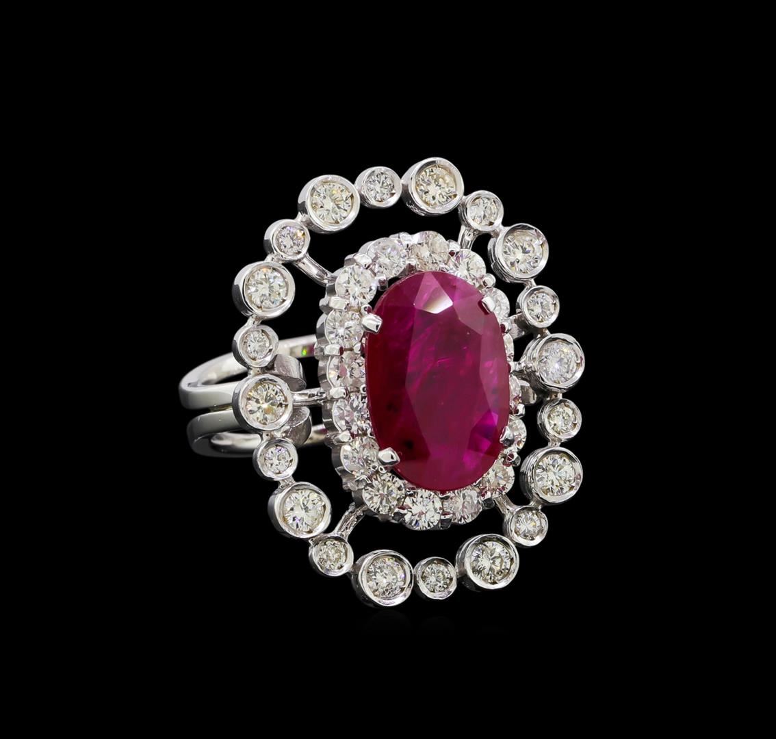 One electronically tested 14KT white gold lady's cast fashion ring with a double halo with a bright polish finish. The featured lady's ring has a split double shank measuring 6.62 millimeters wide. Identified with markings of 'K14'. Condition is new, good workmanship. Containing: One prong set oval modified mixed cut natural ruby, measuring 12.83 x 8.63 x 3.66mm, (depth est.) 15%. bulge factor, approximate weight of 4.22ct., clarity is heavily included, medium dark, very slightly brownish, strongly purplish red color, (GIA stpR 6/3), cut is good. Transmitting light somewhat diffusely, semi-transparent to translucent. Naturally occurring internal & external characteristics are present. Colored gemstones are presumed to have been subjected to commonly used enhancement processes. Graded loose prior to setting in the GIA Laboratory, Report #1176603130. Twenty-Six prong set round brilliant cut diamonds, measuring 2.40 - 2.30 x 1.46mm (depth est.) approximate total weight of 26 Stones = 1.30ct. Graded in the setting. Clarity SI-1 to SI-2. Color: H - I Cut Good Ten bezel set round brilliant cut diamonds, measuring 1.70 - 1.60 x 1.02mm (depth est.) approximate total weight of 10 Stones = 0.18ct. Graded in the setting. Clarity SI-1 to SI-2. Color: H - I Cut Good. Total Weight of Colored Stones 4.22ct.. Total Weight of Diamonds 1.48ct.. Total Weight of Ring 8.00gm. GAS Appraised at $11,350.00.