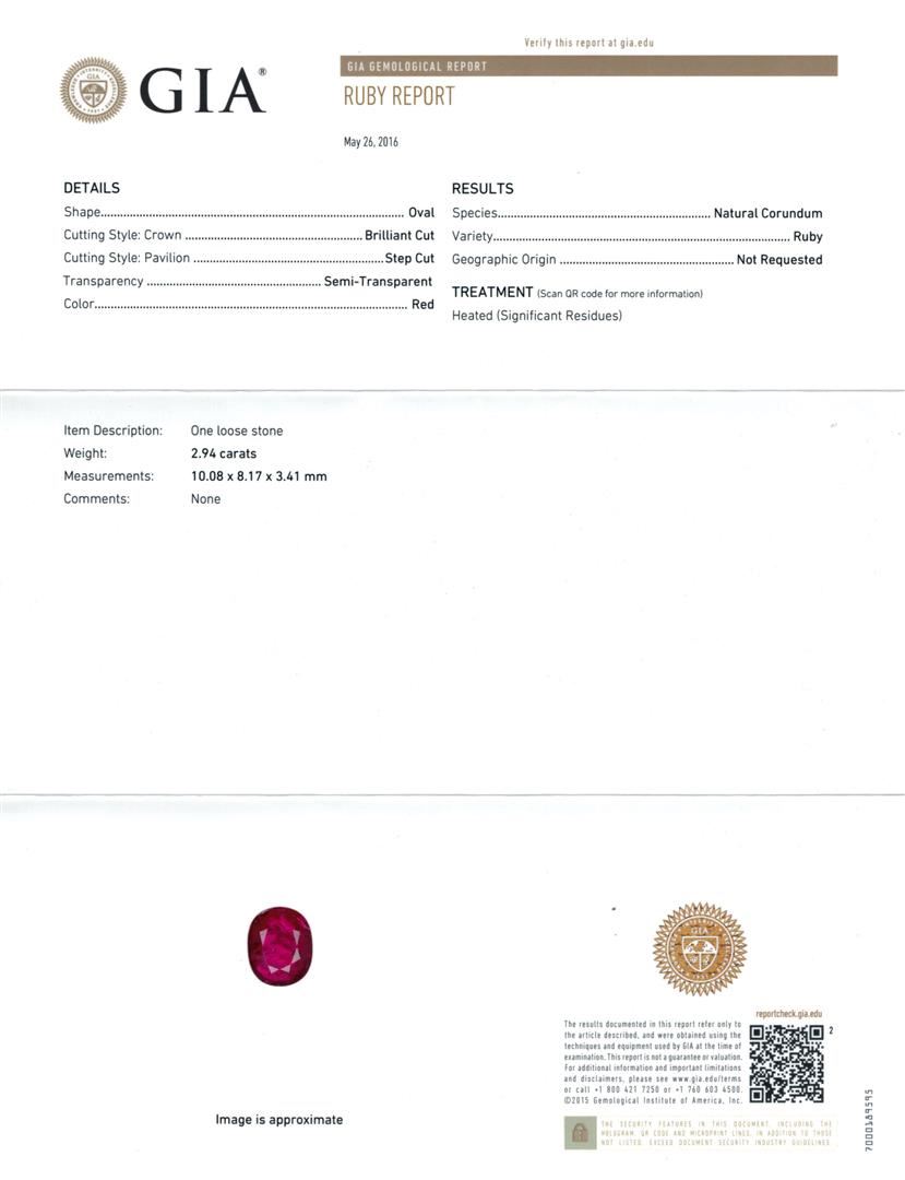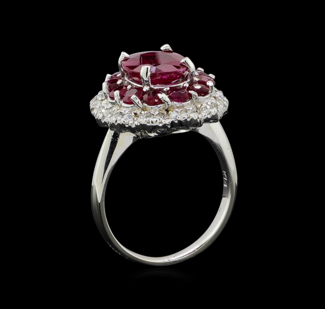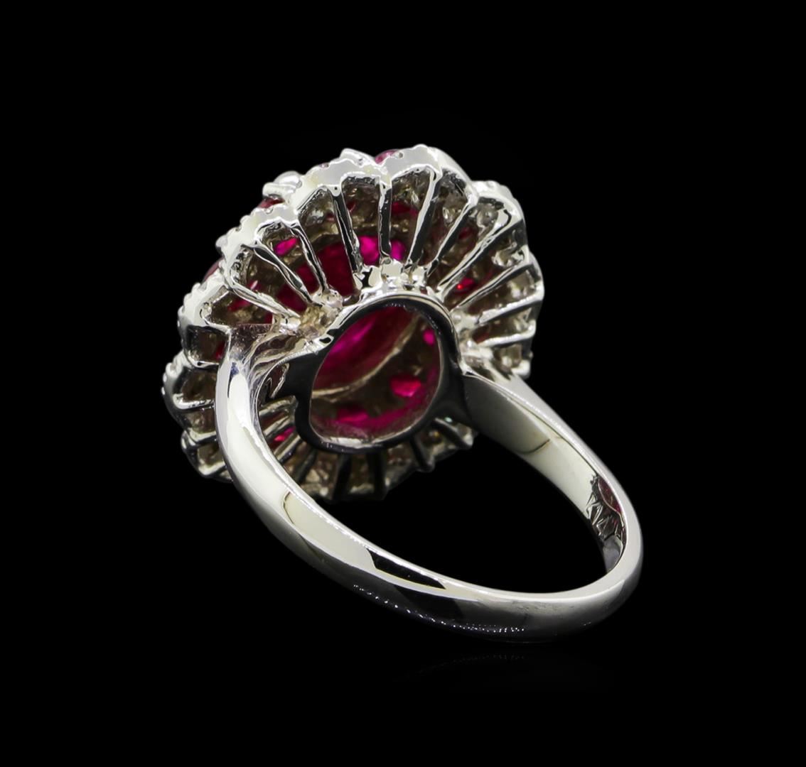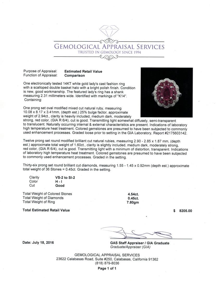 One electronically tested 14KT white gold lady's cast fashion ring with a scalloped double basket halo with a bright polish finish. The featured lady's ring has a shank measuring 2.31 millimeters wide. Identified with markings of 'K14'. Condition is new, good workmanship. Containing: One prong set oval modified mixed cut natural ruby, measuring 10.08 x 8.17 x 3.41mm, (depth est.) 25%. bulge factor, approximate weight of 2.94ct., clarity is heavily included, medium dark, moderately strong, red color, (GIA R 6/4), cut is good. Transmitting light somewhat diffusely, semi-transparent to translucent. Naturally occurring internal & external characteristics are present. Indications of laboratory high temperature heat treatment. Colored gemstones are presumed to have been subjected to commonly used enhancement processes. Graded loose prior to setting in the GIA Laboratory, Report #2175603142. Twelve prong set round modified brilliant cut natural rubies, measuring 2.90 - 2.85 x 1.87 mm, (depth est.) approximate total weight of 1.60ct., clarity is slightly included, medium dark, moderately strong, red color, (GIA R 6/4), cut is good. Transmitting light with a minimum of distortion, transparent. Indications of laboratory high temperature heat treatment. Colored gemstones are presumed to have been subjected to commonly used enhancement processes. Graded in the setting. Thirty-Six prong set round brilliant cut diamonds, measuring 1.55 - 1.45 x 0.92mm (depth est.) approximate total weight of 36 Stones = 0.45ct. Graded in the setting. Clarity VS-2 to SI-2. Color: H - I Cut Good. Total Weight of Colored Stones 4.54ct.. Total Weight of Diamonds 0.45ct.. Total Weight of Ring 7.80gm. GAS Appraised at $8,205.00.