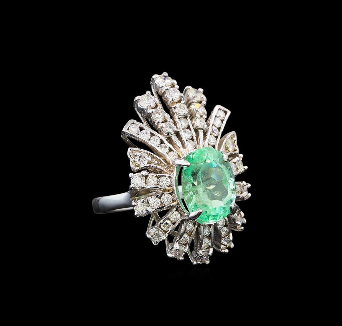 One electronically tested 14KT white gold ladies cast emerald and diamond ring. The featured emerald is set within a floret of radiating diamond ribbons supported by a ribbed under gallery, completed by a two millimeter wide band. Bright and patterned finish. Identified with markings of 'K14'. Condition is new, good workmanship. Containing: One prong set oval modified brilliant cut natural emerald, measuring 11.98 x 9.78 x 7.46mm, exact weight 4.99ct., clarity is moderately included, type III, medium light, very slightly grayish, green color, (GIA G 4/3), cut is good. Transmitting light with a minimum of distortion, transparent. Naturally occurring internal & external characteristics are present. Moderate clarity enhancement. GIA Gemological Report attached. Graded loose prior to setting in the GIA Laboratory, Report #2175664623. Three prong set round brilliant cut diamonds, measuring 3.00 - 2.90 x 1.77mm (depth est.) approximate total weight of 3 Stones = 0.30ct. Graded in the setting. Clarity I-1 to I-2. Color: G - I Seventeen prong set round brilliant cut diamonds, measuring 2.50 - 2.20 x 1.41mm (depth est.) approximate total weight of 17 Stones = 0.82ct. The clarity grade reflects the entire range of clarity for this group. Graded in the setting. Clarity SI-2 to I-2. Color: G - I Thirty-One prong set round brilliant cut diamonds, measuring 1.80 - 1.80 x 1.08mm (depth est.) approximate total weight of 31 Stones = 0.70ct. The color grade reflects the entire range of color for this group. Graded in the setting. Clarity SI-2 to I-2. Color: F - I. Total Weight of Colored Stones 4.99ct.. Total Weight of Diamonds 1.82ct.. Total Weight of Ring 10.27gm. AIG Appraised at $12,430.00.