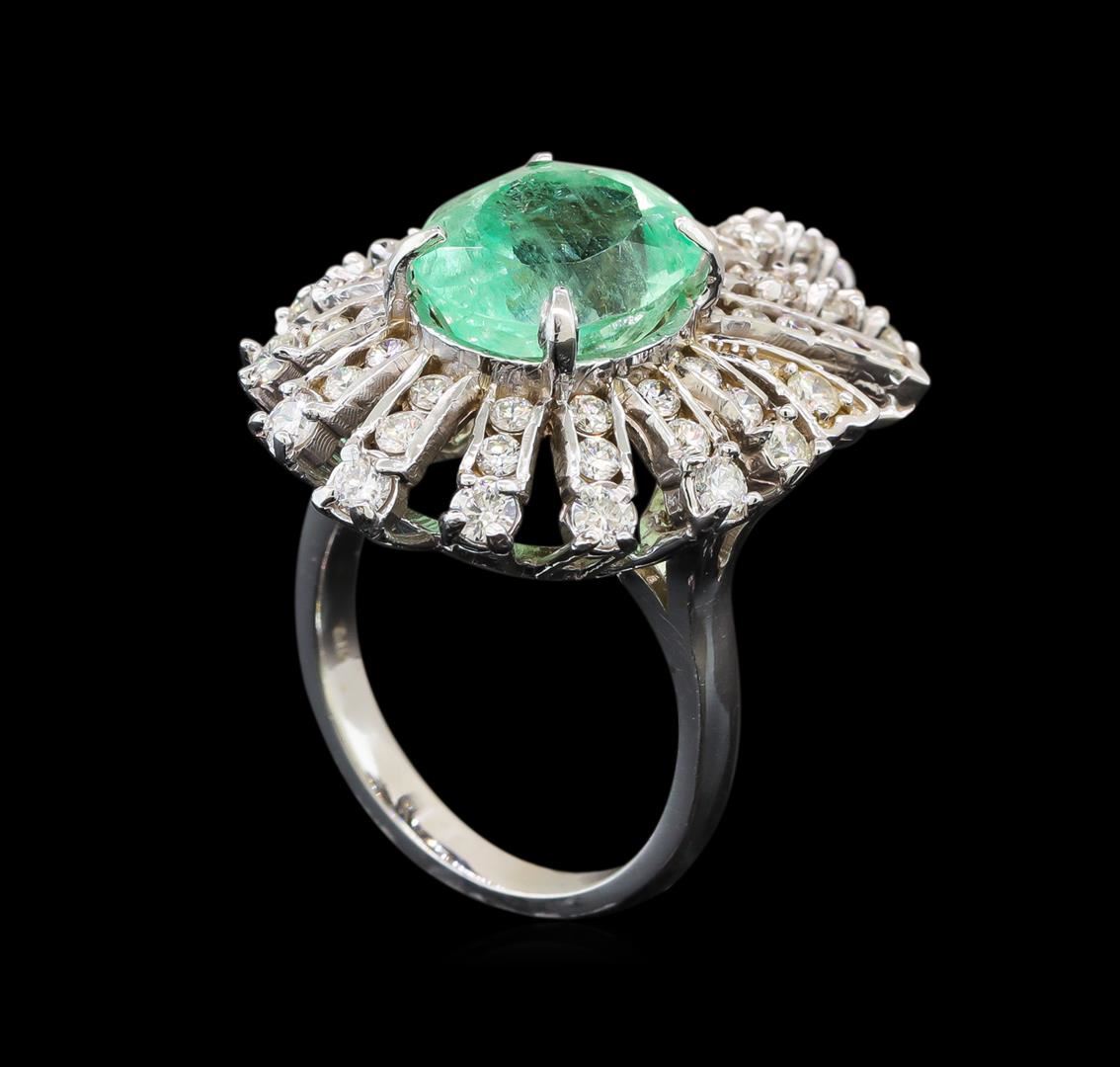 One electronically tested 14KT white gold ladies cast emerald and diamond ring. The featured emerald is set within a floret of radiating diamond ribbons supported by a ribbed under gallery, completed by a two millimeter wide band. Bright and patterned finish. Identified with markings of 'K14'. Condition is new, good workmanship. Containing: One prong set oval modified brilliant cut natural emerald, measuring 11.98 x 9.78 x 7.46mm, exact weight 4.99ct., clarity is moderately included, type III, medium light, very slightly grayish, green color, (GIA G 4/3), cut is good. Transmitting light with a minimum of distortion, transparent. Naturally occurring internal & external characteristics are present. Moderate clarity enhancement. GIA Gemological Report attached. Graded loose prior to setting in the GIA Laboratory, Report #2175664623. Three prong set round brilliant cut diamonds, measuring 3.00 - 2.90 x 1.77mm (depth est.) approximate total weight of 3 Stones = 0.30ct. Graded in the setting. Clarity I-1 to I-2. Color: G - I Seventeen prong set round brilliant cut diamonds, measuring 2.50 - 2.20 x 1.41mm (depth est.) approximate total weight of 17 Stones = 0.82ct. The clarity grade reflects the entire range of clarity for this group. Graded in the setting. Clarity SI-2 to I-2. Color: G - I Thirty-One prong set round brilliant cut diamonds, measuring 1.80 - 1.80 x 1.08mm (depth est.) approximate total weight of 31 Stones = 0.70ct. The color grade reflects the entire range of color for this group. Graded in the setting. Clarity SI-2 to I-2. Color: F - I. Total Weight of Colored Stones 4.99ct.. Total Weight of Diamonds 1.82ct.. Total Weight of Ring 10.27gm. AIG Appraised at $12,430.00.