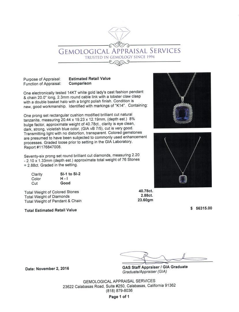One electronically tested 14KT white gold lady's cast fashion pendant & chain 20.0' long, 2.3mm round cable link with a lobster claw clasp with a double basket halo with a bright polish finish. Identified with markings of 'K14'. Condition is new, good workmanship. Containing: One prong set rectangular cushion modified brilliant cut natural tanzanite, measuring 20.44 x 19.23 x 12.19mm, (depth est.) 8%. bulge factor, approximate weight of 40.78ct., clarity is eye clean, dark, strong, violetish blue color, (GIA vB 7/5), cut is very good. Transmitting light with no distortion, transparent. Colored gemstones are presumed to have been subjected to commonly used enhancement processes. Graded loose prior to setting in the GIA Laboratory, Report #1176847008. Seventy-Six prong set round brilliant cut diamonds, measuring 2.20 - 2.10 x 1.33mm (depth est.) approximate total weight of 76 Stones = 2.88ct. Graded in the setting. Clarity SI-1 to SI-2. Color: H - I Cut Good. Total Weight of Colored Stones 40.78ct.. Total Weight of Diamonds 2.88ct.. Total Weight of Pendant & Chain 23.60gm. GAS Appraised.