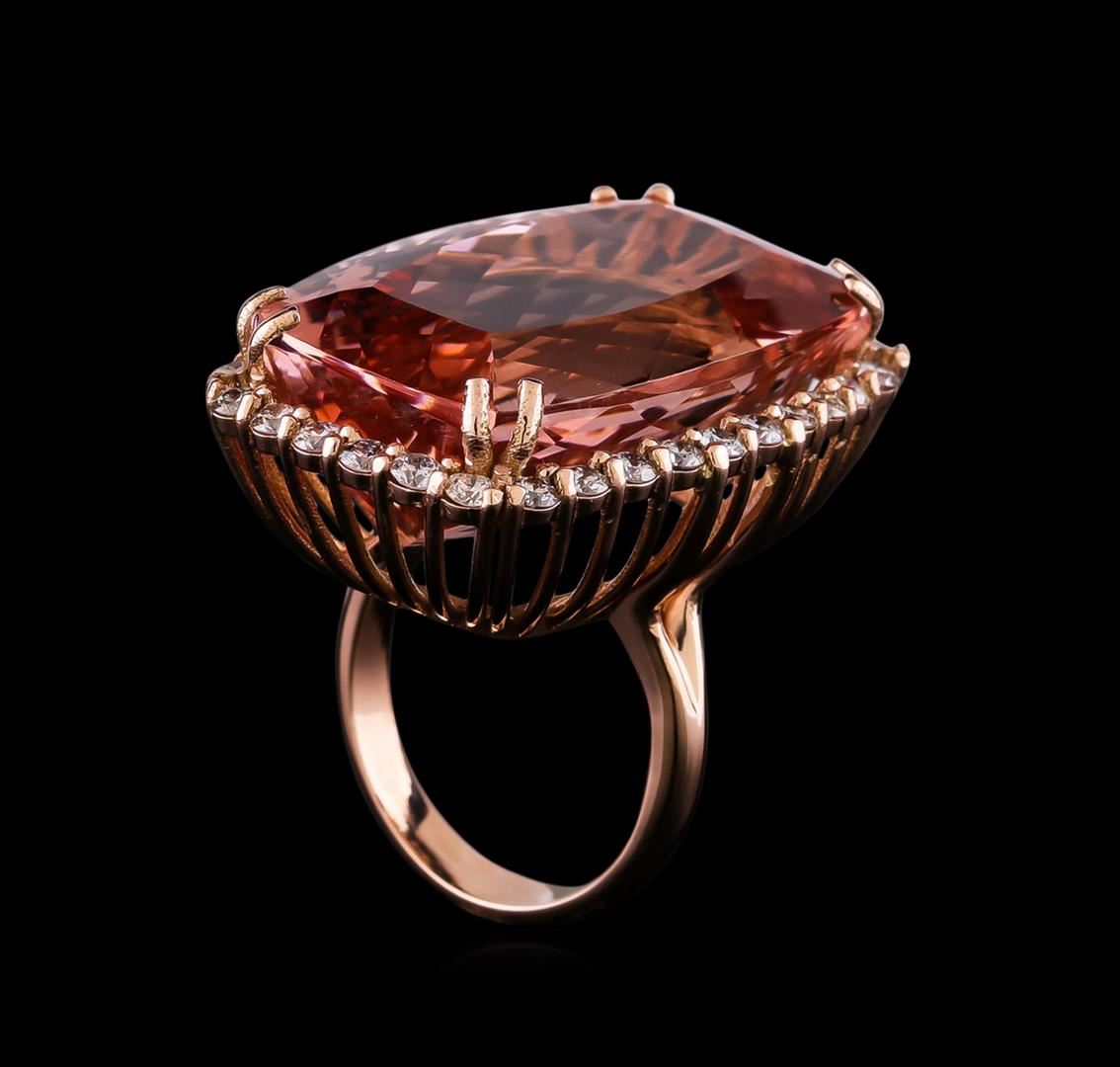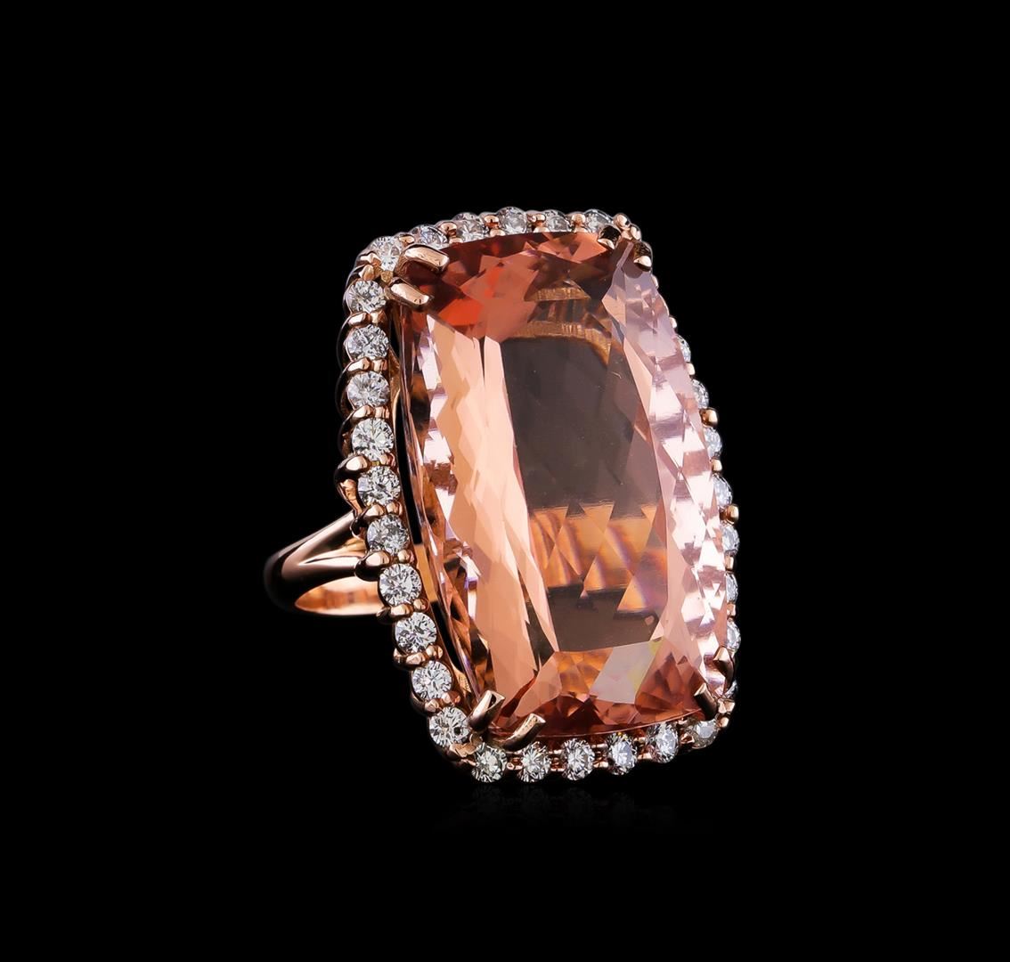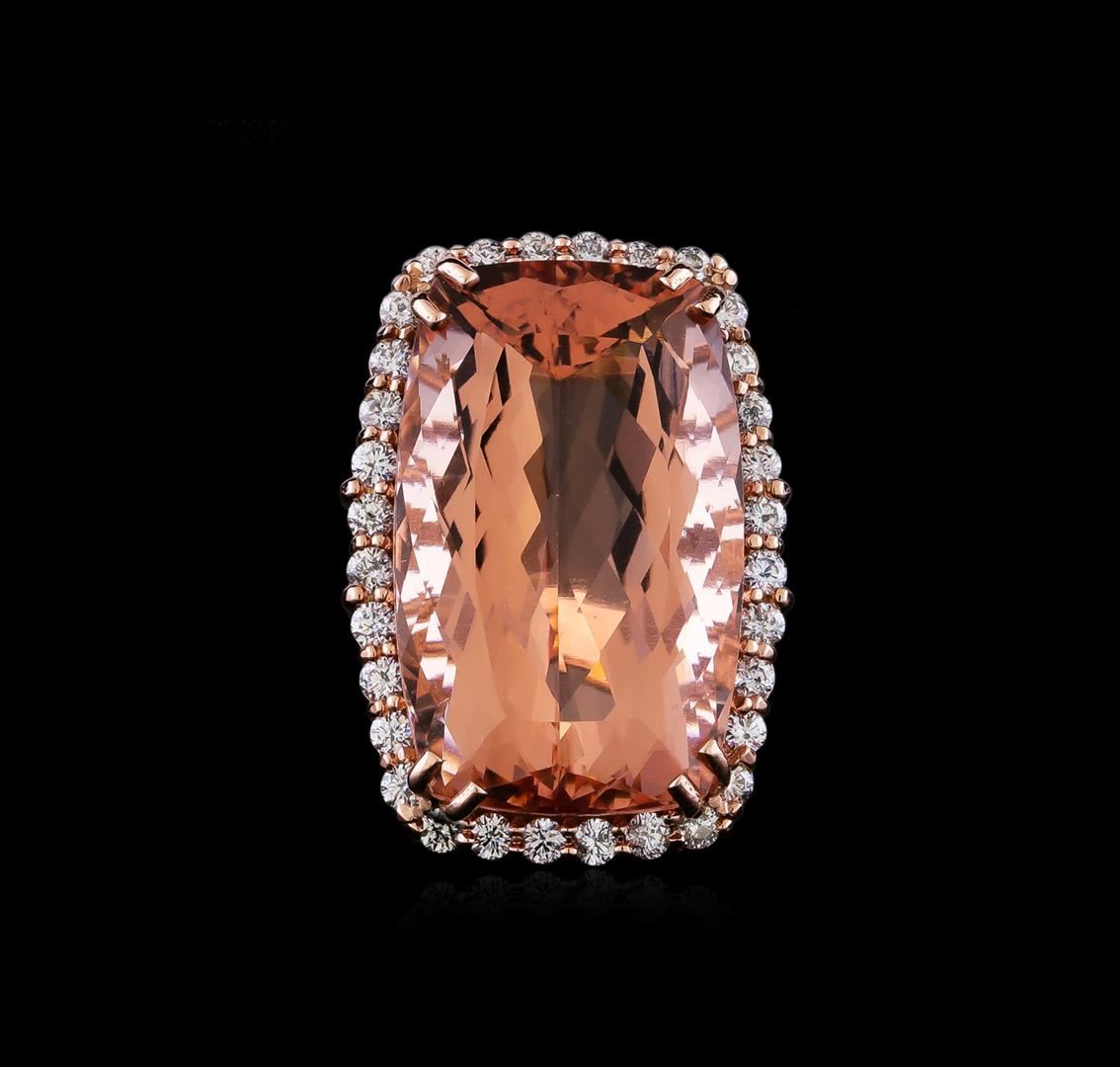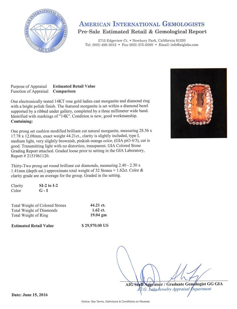 One prong set cushion modified brilliant cut natural morganite, measuring 28.56 x 17.78 x 12.08mm, exact weight 44.21ct., clarity is slightly included, type I, light, very slightly brownish, cut is good. Transmitting light with no distortion, transparent. GIA Colored Stone Grading Report attached. Graded loose prior to setting in the GIA Laboratory, Report # 2151961120.Thirty-Two prong set round brilliant cut diamonds, measuring 2.40 - 2.30 x 1.41mm (depth est.) approximate total weight of 32 Stones = 1.62ct. Color & clarity grade are an average for the group. Graded in the setting. Clarity: SI-2 to I-2. Color: G - I. Total Weight of Colored Stones 44.21ct. Total Weight of Diamonds 1.62ct. Total Weight of Ring 19.04gm. AIG Appraised at $29,970.00.