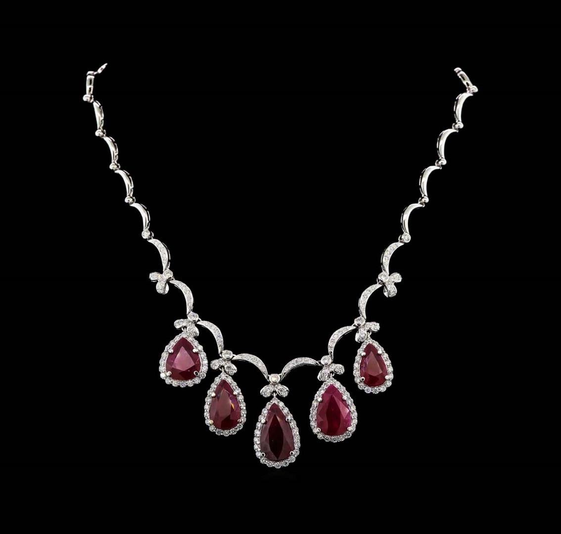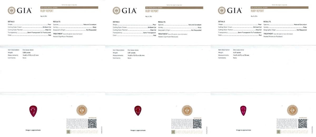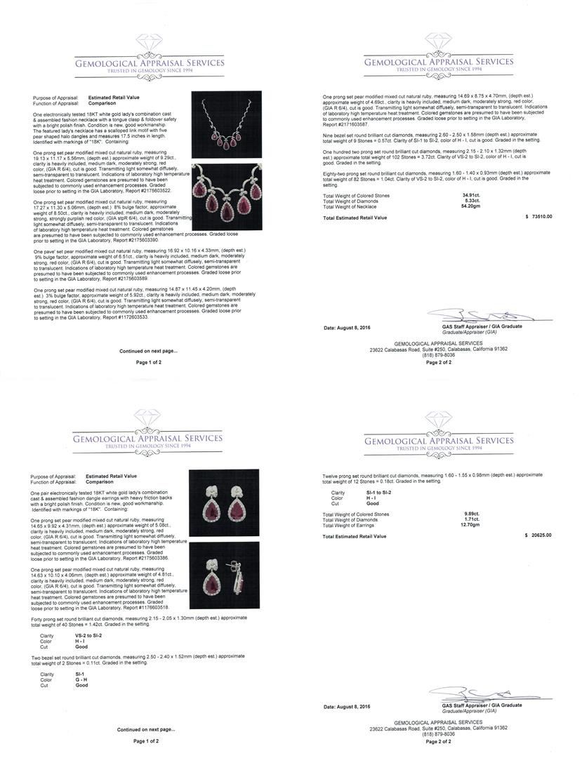 One Suite containing : One pair electronically tested 18KT white gold lady's combination cast & assembled fashion dangle earrings with heavy friction backs with a bright polish finish. Identified with markings of '18K'. Condition is new, good workmanship. Containing: One prong set pear modified mixed cut natural ruby, measuring 14.65 x 9.92 x 4.31mm, (depth est.) approximate weight of 5.08ct., clarity is heavily included, medium dark, moderately strong, red color, (GIA R 6/4), cut is good. Transmitting light somewhat diffusely, semi-transparent to translucent. Indications of laboratory high temperature heat treatment. Colored gemstones are presumed to have been subjected to commonly used enhancement processes. Graded loose prior to setting in the GIA Laboratory, Report #2175603386. One prong set pear modified mixed cut natural ruby, measuring 14.63 x 10.10 x 4.06mm, (depth est.) approximate weight of 4.81ct., clarity is heavily included, medium dark, moderately strong, red color, (GIA R 6/4), cut is good. Transmitting light somewhat diffusely, semi-transparent to translucent. Indications of laboratory high temperature heat treatment. Colored gemstones are presumed to have been subjected to commonly used enhancement processes. Graded loose prior to setting in the GIA Laboratory, Report #1176603518. Forty prong set round brilliant cut diamonds, measuring 2.15 - 2.05 x 1.30mm (depth est.) approximate total weight of 40 Stones = 1.42ct. Graded in the setting. Clarity VS-2 to SI-2. Color: H - I Cut Good Two bezel set round brilliant cut diamonds, measuring 2.50 - 2.40 x 1.52mm (depth est.) approximate total weight of 2 Stones = 0.11ct. Graded in the setting. Clarity SI-1. Color: G - H Cut Good Twelve prong set round brilliant cut diamonds, measuring 1.60 - 1.55 x 0.98mm (depth est.) approximate total weight of 12 Stones = 0.18ct. Graded in the setting. Clarity SI-1 to SI-2. Color: H - I Cut Good. Total Weight of Colored Stones 9.89ct.. Total Weight of Diamonds 1.71ct.. Total Weight of Earrings 12.70gm. One electronically tested 18KT white gold lady's combination cast & assembled fashion necklace with a tongue clasp & foldover safety with a bright polish finish. The featured lady's necklace has a scalloped link motif with five pear shaped halo dangles and measures 17.5 inches in length. Identified with markings of "18K". Condition is new, good workmanship. Containing: One prong set pear modified mixed cut natural ruby, measuring 19.13 x 11.17 x 5.56mm, (depth est.) approximate weight of 9.29ct., clarity is heavily included, medium dark, moderately strong, red color, (GIA R 6/4), cut is good. Transmitting light somewhat diffusely, semi-transparent to translucent. Indications of laboratory high temperature heat treatment. Colored gemstones are presumed to have been subjected to commonly used enhancement processes. Graded loose prior to setting in the GIA Laboratory, Report #2175603522.One prong set pear modified mixed cut natural ruby, measuring 17.27 x 11.30 x 5.06mm, (depth est.) 8%. bulge factor, approximate weight of 8.50ct., clarity is heavily included, medium dark, moderately strong, strongly purplish red color, (GIA stpR 6/4), cut is good. Transmitting light somewhat diffusely, semi-transparent to translucent. Indications of laboratory high temperature heat treatment. Colored gemstones are presumed to have been subjected to commonly used enhancement processes. Graded loose prior to setting in the GIA Laboratory, Report #2175603390.One pave' set pear modified mixed cut natural ruby, measuring 16.92 x 10.16 x 4.33mm, (depth est.) 9%. bulge factor, approximate weight of 6.51ct., clarity is heavily included, medium dark, moderately strong, red color, (GIA R 6/4), cut is good. Transmitting light somewhat diffusely, semi-transparent to translucent. Indications of laboratory high temperature heat treatment. Colored gemstones are presumed to have been subjected to commonly used enhancement processes. Graded loose prior to setting in the GIA Laboratory, Report #2175603589.One prong set pear modified mixed cut natural ruby, measuring 14.87 x 11.45 x 4.20mm, (depth est.) 3%. bulge factor, approximate weight of 5.92ct., clarity is heavily included, medium dark, moderately strong, red color, (GIA R 6/4), cut is good. Transmitting light somewhat diffusely, semi-transparent to translucent. Indications of laboratory high temperature heat treatment. Colored gemstones are presumed to have been subjected to commonly used enhancement processes. Graded loose prior to setting in the GIA Laboratory, Report #1172603533.One prong set pear modified mixed cut natural ruby, measuring 14.69 x 8.75 x 4.70mm, (depth est.) approximate weight of 4.69ct., clarity is heavily included, medium dark, moderately strong, red color, (GIA R 6/4), cut is good. Transmitting light somewhat diffusely, semi-transparent to translucent. Indications of laboratory high temperature heat treatment. Colored gemstones are presumed to have been subjected to commonly used enhancement processes. Graded loose prior to setting in the GIA Laboratory, Report #2171603587.Nine bezel set round brilliant cut diamonds, measuring 2.60 - 2.50 x 1.58mm (depth est.) approximate. Total Weight of 9 Stones = 0.57ct. Graded in the setting. Clarity: SI-1 to SI-2. Color: H - I. Cut Good One Hundred Two prong set round brilliant cut diamonds, measuring 2.15 - 2.10 x 1.32mm (depth est.) approximate. Total Weight of 102 Stones = 3.72ct. Graded in the setting. Clarity: VS-2 to SI-2. Color: H - I. Cut Good Eighty-Two prong set round brilliant cut diamonds, measuring 1.60 - 1.40 x 0.93mm (depth est.) approximate. Total Weight of 82 Stones = 1.04ct. Graded in the setting. Clarity: VS-2 to SI-2. Color: H - I. Cut Good. Total Weight of Colored Stones 34.91ct. Total Weight of Diamonds 5.33ct. Total Weight of Necklace 54.20gm. GAS Appraised at $94,135.00.