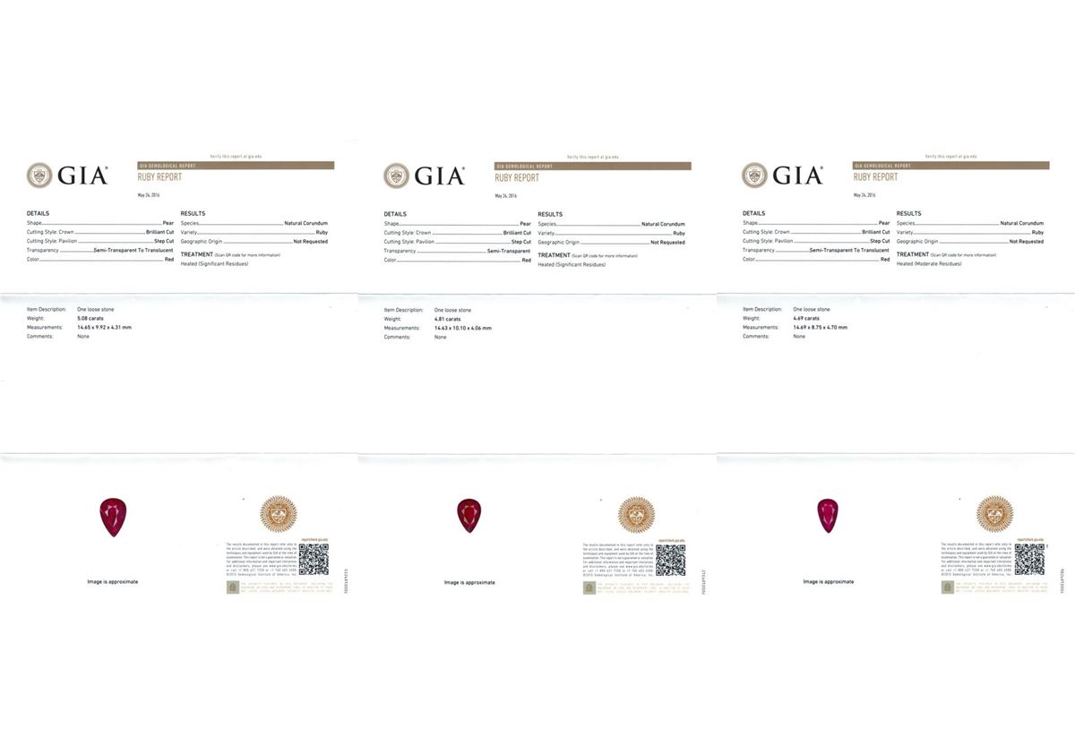 One Suite containing : One pair electronically tested 18KT white gold lady's combination cast & assembled fashion dangle earrings with heavy friction backs with a bright polish finish. Identified with markings of '18K'. Condition is new, good workmanship. Containing: One prong set pear modified mixed cut natural ruby, measuring 14.65 x 9.92 x 4.31mm, (depth est.) approximate weight of 5.08ct., clarity is heavily included, medium dark, moderately strong, red color, (GIA R 6/4), cut is good. Transmitting light somewhat diffusely, semi-transparent to translucent. Indications of laboratory high temperature heat treatment. Colored gemstones are presumed to have been subjected to commonly used enhancement processes. Graded loose prior to setting in the GIA Laboratory, Report #2175603386. One prong set pear modified mixed cut natural ruby, measuring 14.63 x 10.10 x 4.06mm, (depth est.) approximate weight of 4.81ct., clarity is heavily included, medium dark, moderately strong, red color, (GIA R 6/4), cut is good. Transmitting light somewhat diffusely, semi-transparent to translucent. Indications of laboratory high temperature heat treatment. Colored gemstones are presumed to have been subjected to commonly used enhancement processes. Graded loose prior to setting in the GIA Laboratory, Report #1176603518. Forty prong set round brilliant cut diamonds, measuring 2.15 - 2.05 x 1.30mm (depth est.) approximate total weight of 40 Stones = 1.42ct. Graded in the setting. Clarity VS-2 to SI-2. Color: H - I Cut Good Two bezel set round brilliant cut diamonds, measuring 2.50 - 2.40 x 1.52mm (depth est.) approximate total weight of 2 Stones = 0.11ct. Graded in the setting. Clarity SI-1. Color: G - H Cut Good Twelve prong set round brilliant cut diamonds, measuring 1.60 - 1.55 x 0.98mm (depth est.) approximate total weight of 12 Stones = 0.18ct. Graded in the setting. Clarity SI-1 to SI-2. Color: H - I Cut Good. Total Weight of Colored Stones 9.89ct.. Total Weight of Diamonds 1.71ct.. Total Weight of Earrings 12.70gm. One electronically tested 18KT white gold lady's combination cast & assembled fashion necklace with a tongue clasp & foldover safety with a bright polish finish. The featured lady's necklace has a scalloped link motif with five pear shaped halo dangles and measures 17.5 inches in length. Identified with markings of "18K". Condition is new, good workmanship. Containing: One prong set pear modified mixed cut natural ruby, measuring 19.13 x 11.17 x 5.56mm, (depth est.) approximate weight of 9.29ct., clarity is heavily included, medium dark, moderately strong, red color, (GIA R 6/4), cut is good. Transmitting light somewhat diffusely, semi-transparent to translucent. Indications of laboratory high temperature heat treatment. Colored gemstones are presumed to have been subjected to commonly used enhancement processes. Graded loose prior to setting in the GIA Laboratory, Report #2175603522.One prong set pear modified mixed cut natural ruby, measuring 17.27 x 11.30 x 5.06mm, (depth est.) 8%. bulge factor, approximate weight of 8.50ct., clarity is heavily included, medium dark, moderately strong, strongly purplish red color, (GIA stpR 6/4), cut is good. Transmitting light somewhat diffusely, semi-transparent to translucent. Indications of laboratory high temperature heat treatment. Colored gemstones are presumed to have been subjected to commonly used enhancement processes. Graded loose prior to setting in the GIA Laboratory, Report #2175603390.One pave' set pear modified mixed cut natural ruby, measuring 16.92 x 10.16 x 4.33mm, (depth est.) 9%. bulge factor, approximate weight of 6.51ct., clarity is heavily included, medium dark, moderately strong, red color, (GIA R 6/4), cut is good. Transmitting light somewhat diffusely, semi-transparent to translucent. Indications of laboratory high temperature heat treatment. Colored gemstones are presumed to have been subjected to commonly used enhancement processes. Graded loose prior to setting in the GIA Laboratory, Report #2175603589.One prong set pear modified mixed cut natural ruby, measuring 14.87 x 11.45 x 4.20mm, (depth est.) 3%. bulge factor, approximate weight of 5.92ct., clarity is heavily included, medium dark, moderately strong, red color, (GIA R 6/4), cut is good. Transmitting light somewhat diffusely, semi-transparent to translucent. Indications of laboratory high temperature heat treatment. Colored gemstones are presumed to have been subjected to commonly used enhancement processes. Graded loose prior to setting in the GIA Laboratory, Report #1172603533.One prong set pear modified mixed cut natural ruby, measuring 14.69 x 8.75 x 4.70mm, (depth est.) approximate weight of 4.69ct., clarity is heavily included, medium dark, moderately strong, red color, (GIA R 6/4), cut is good. Transmitting light somewhat diffusely, semi-transparent to translucent. Indications of laboratory high temperature heat treatment. Colored gemstones are presumed to have been subjected to commonly used enhancement processes. Graded loose prior to setting in the GIA Laboratory, Report #2171603587.Nine bezel set round brilliant cut diamonds, measuring 2.60 - 2.50 x 1.58mm (depth est.) approximate. Total Weight of 9 Stones = 0.57ct. Graded in the setting. Clarity: SI-1 to SI-2. Color: H - I. Cut Good One Hundred Two prong set round brilliant cut diamonds, measuring 2.15 - 2.10 x 1.32mm (depth est.) approximate. Total Weight of 102 Stones = 3.72ct. Graded in the setting. Clarity: VS-2 to SI-2. Color: H - I. Cut Good Eighty-Two prong set round brilliant cut diamonds, measuring 1.60 - 1.40 x 0.93mm (depth est.) approximate. Total Weight of 82 Stones = 1.04ct. Graded in the setting. Clarity: VS-2 to SI-2. Color: H - I. Cut Good. Total Weight of Colored Stones 34.91ct. Total Weight of Diamonds 5.33ct. Total Weight of Necklace 54.20gm. GAS Appraised at $94,135.00.